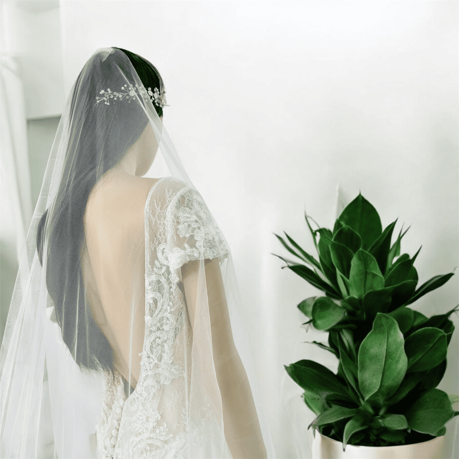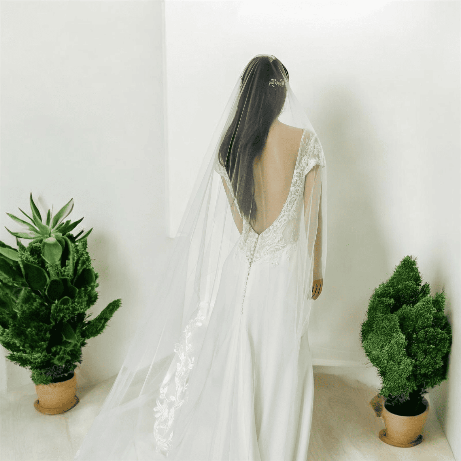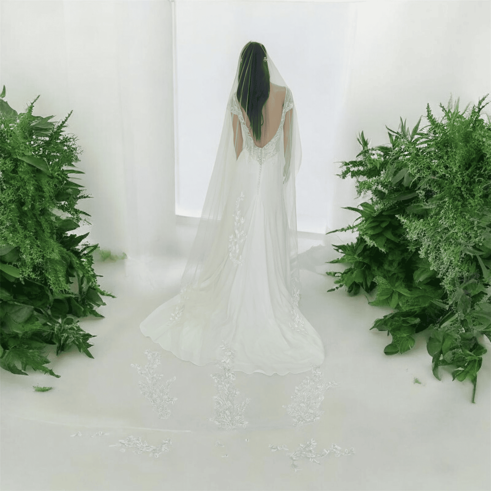 Velo bordado en apliques, distribuidos de centro a final de mantilla