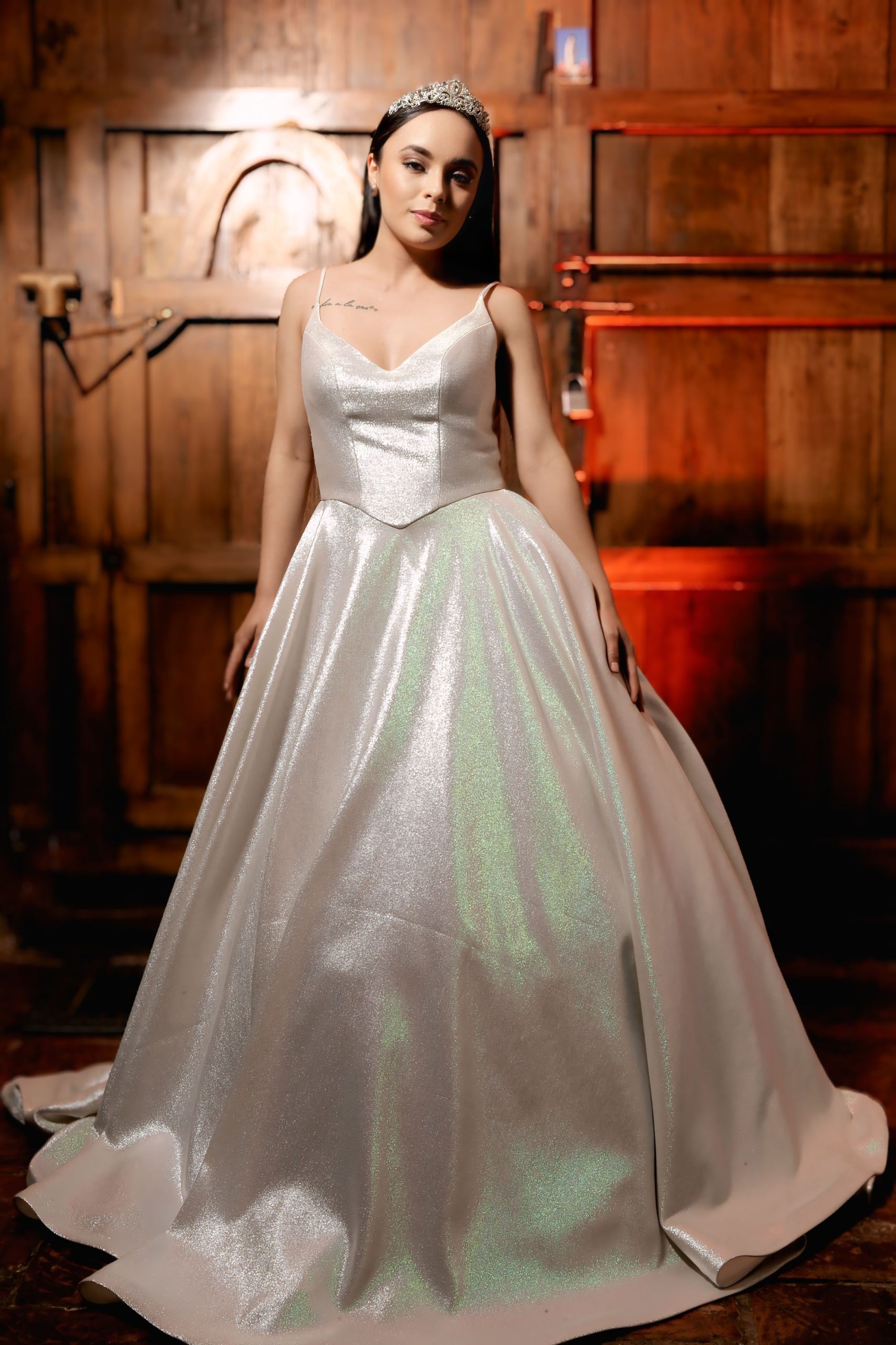 Vestido de silueta princesa con estructura de corsetería interna y escote en “V” de corte limpio. Cargaderas delgadas integradas al cuerpo superior. La línea de cintura está marcada en forma de punta al frente. La falda presenta construcción amplia con caída circular y volumen generado por capas internas de soporte.