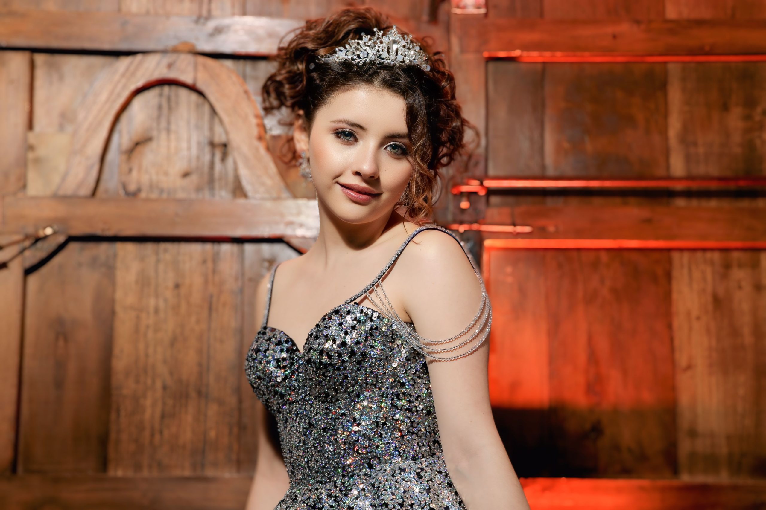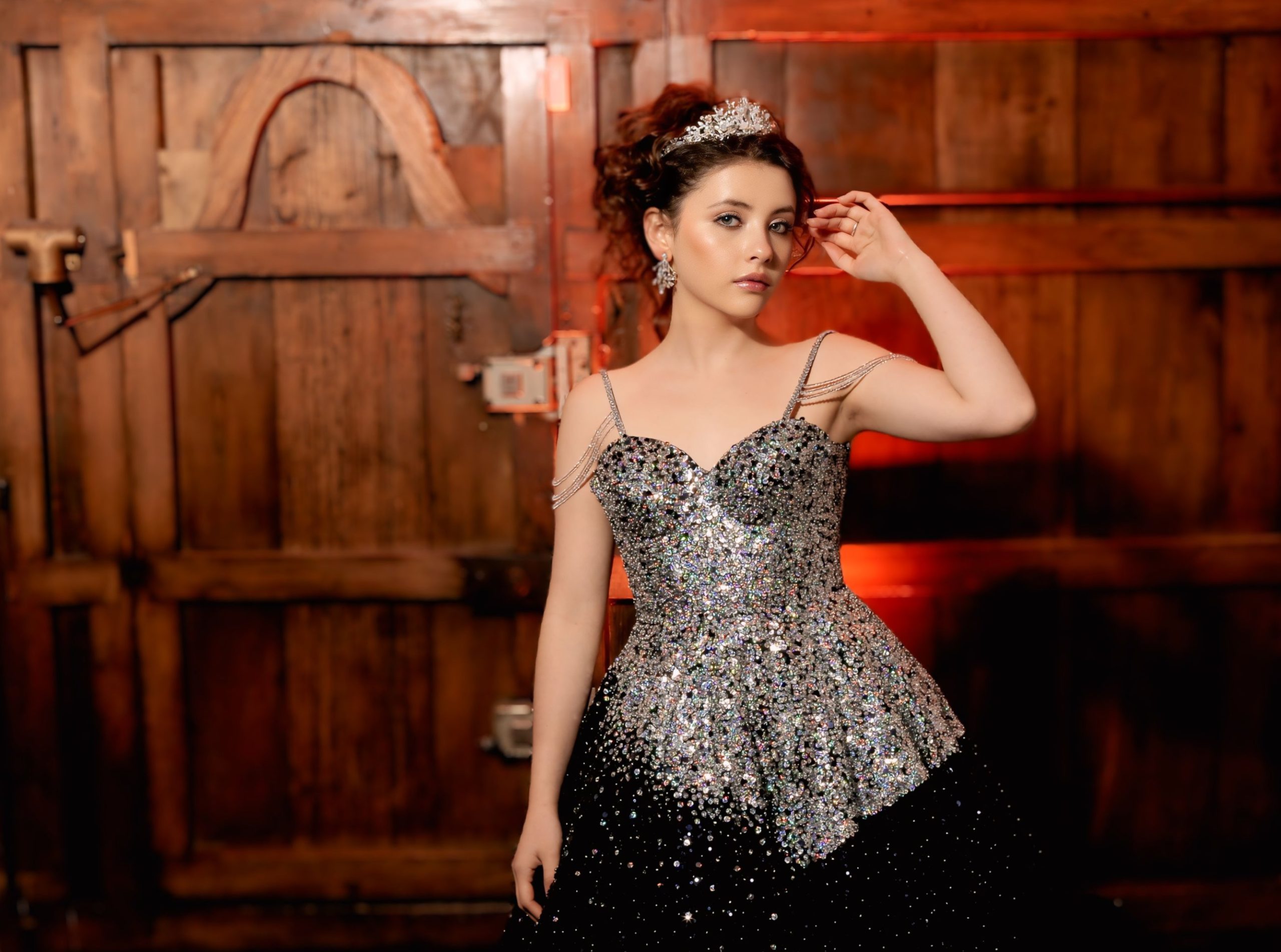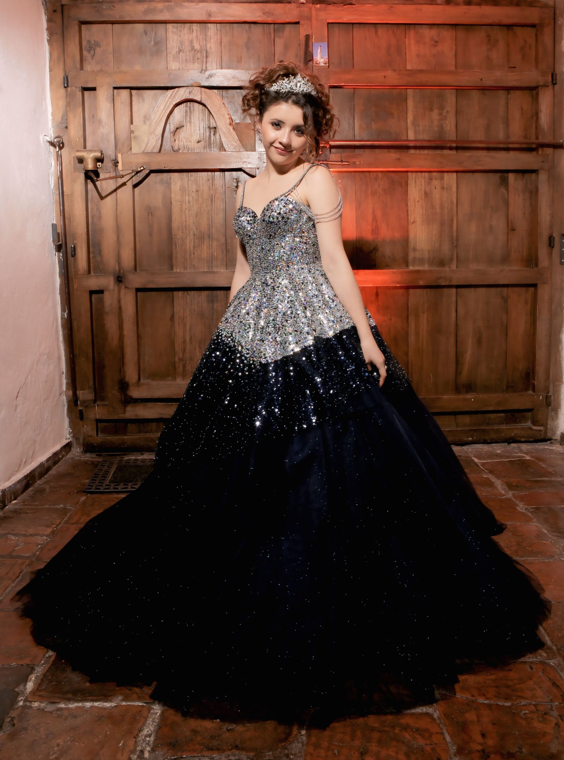 Vestido de quinceañera confeccionado en una sola pieza con estructura interna de corsé integrado. Presenta escote corazón con copas formadas, refuerzo interno con varillas y pinzas verticales para ajuste anatómico.La falda presenta silueta amplia con volumen estructurado a partir de capas superpuestas. La superficie superior incorpora aplicación continua de elementos brillantes dispuestos en degradado desde el cuerpo hasta el ruedo medio