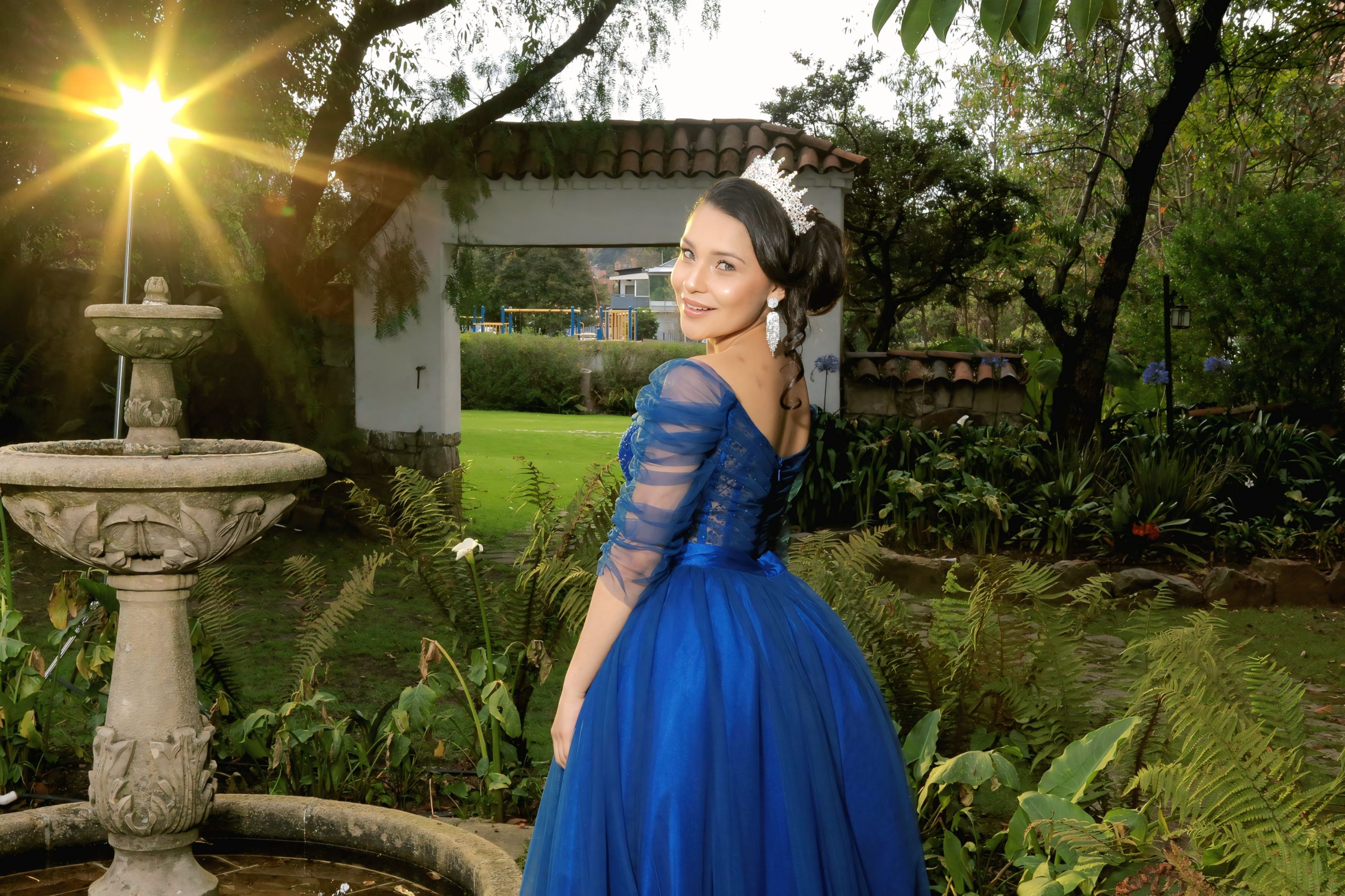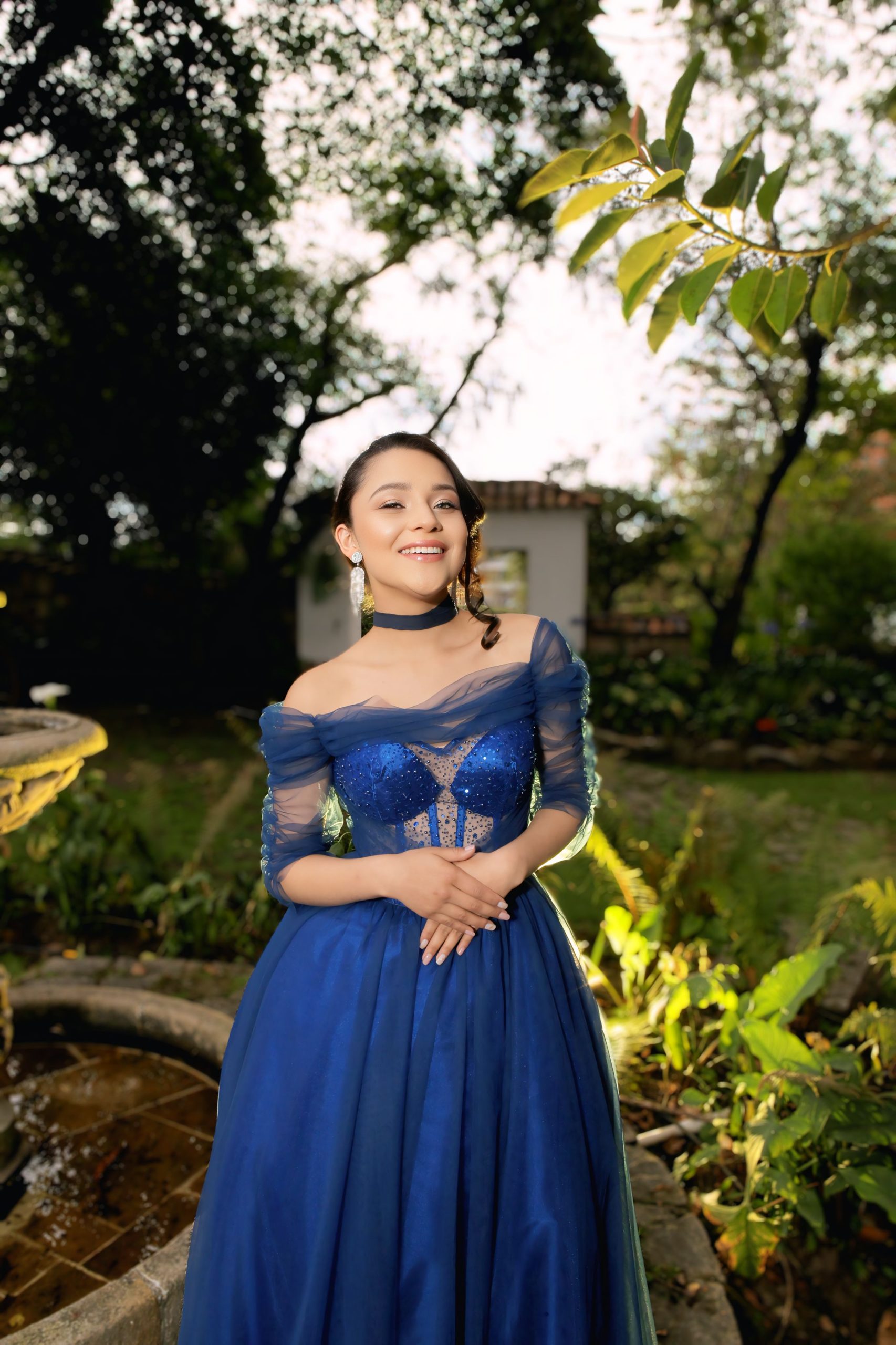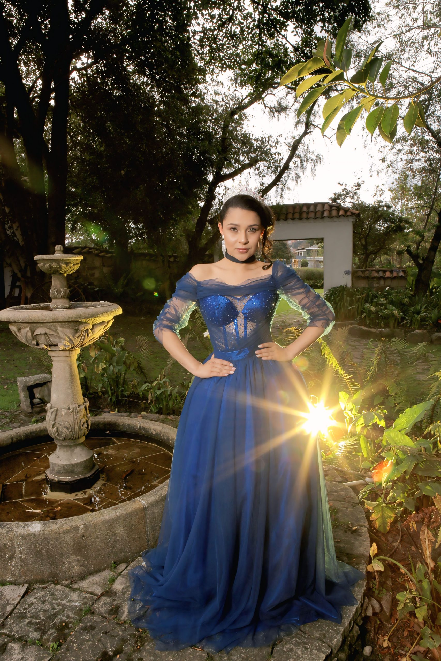 Vestido de quinceañera de una sola pieza con estructura interna de corsé integrado. Presenta escote tipo palabra de honor con recubrimiento superior semitransparente que forma mangas caídas hasta el antebrazo. El corsé incorpora copas formadas, refuerzo con varillas verticales y aplicación de elementos brillantes distribuidos en paneles frontales y laterales.El diseño incluye doble sistema de falda: una falda interna corta de base estructurada y una falda externa larga desmontable o superpuesta, con volumen obtenido mediante capas de soporte y forro interno.
