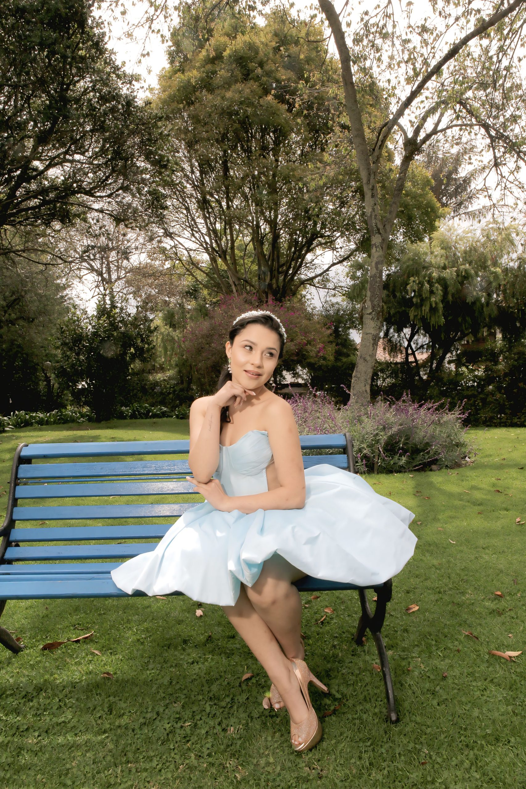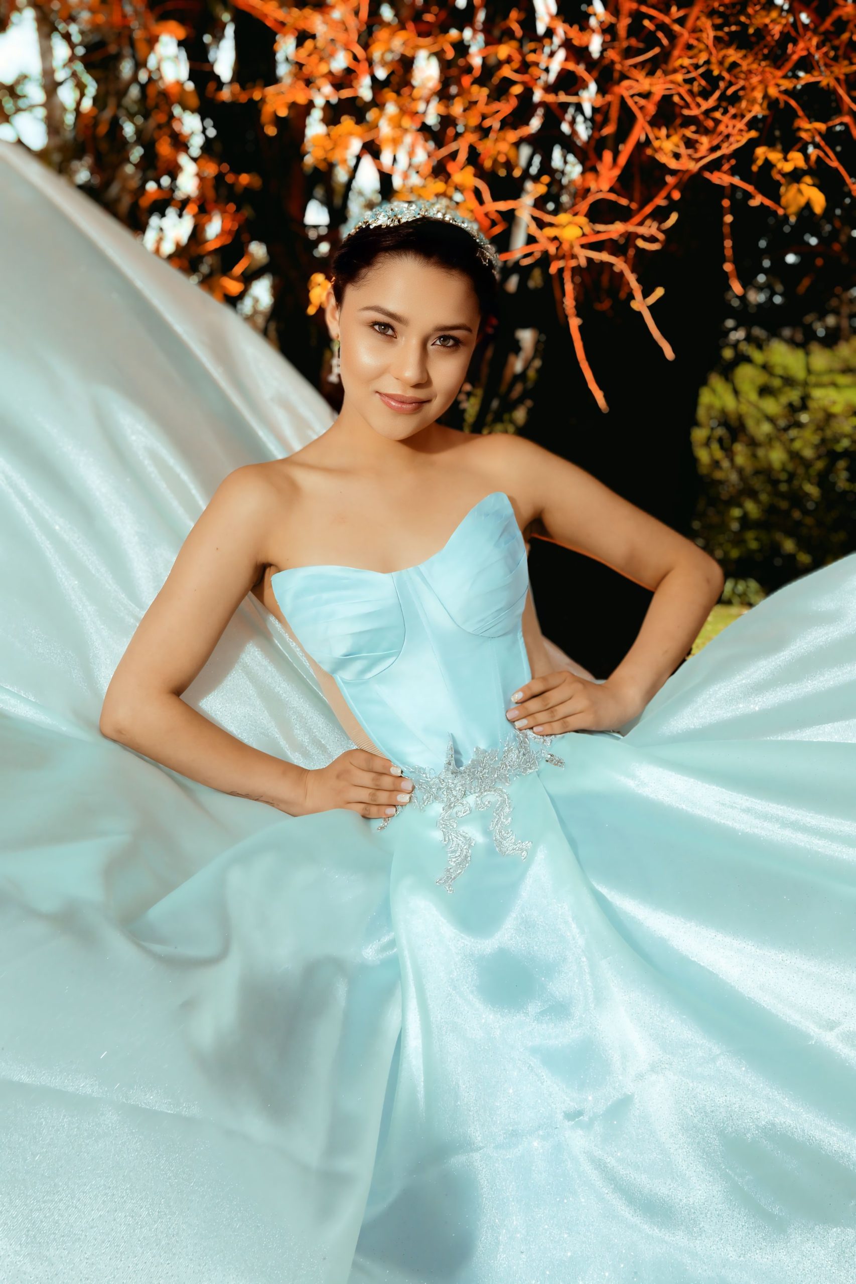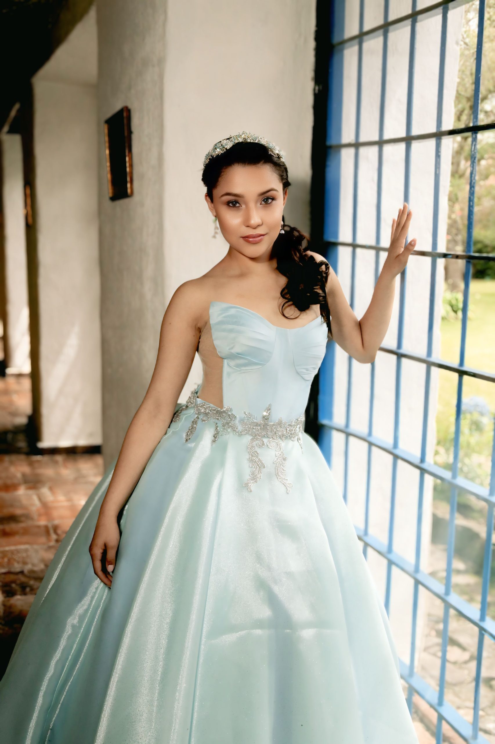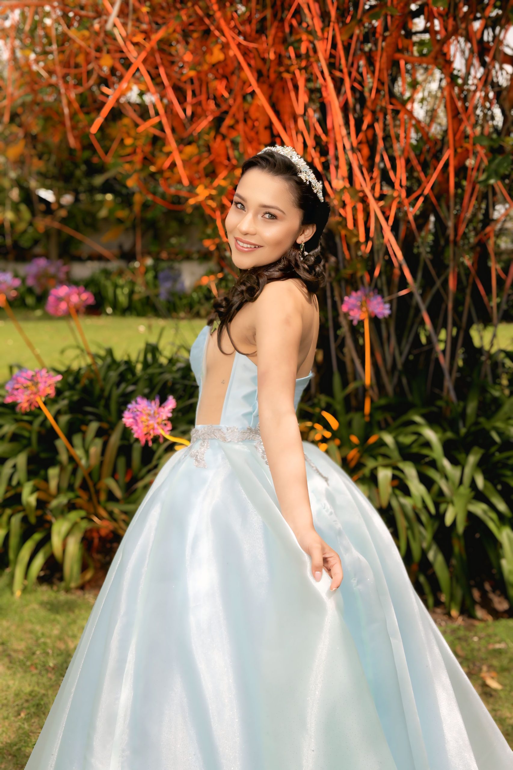 Vestido de quinceañera de una sola pieza con estructura interna de corsé integrado. Presenta escote corazón con copas formadas y pliegues horizontales en el delantero superior. Los laterales del cuerpo incluyen paneles semitransparentes que se extienden hasta la línea de cintura.El diseño incorpora doble sistema de falda: una falda corta de base estructurada y una falda larga superpuesta con volumen controlado mediante capas internas de soporte.