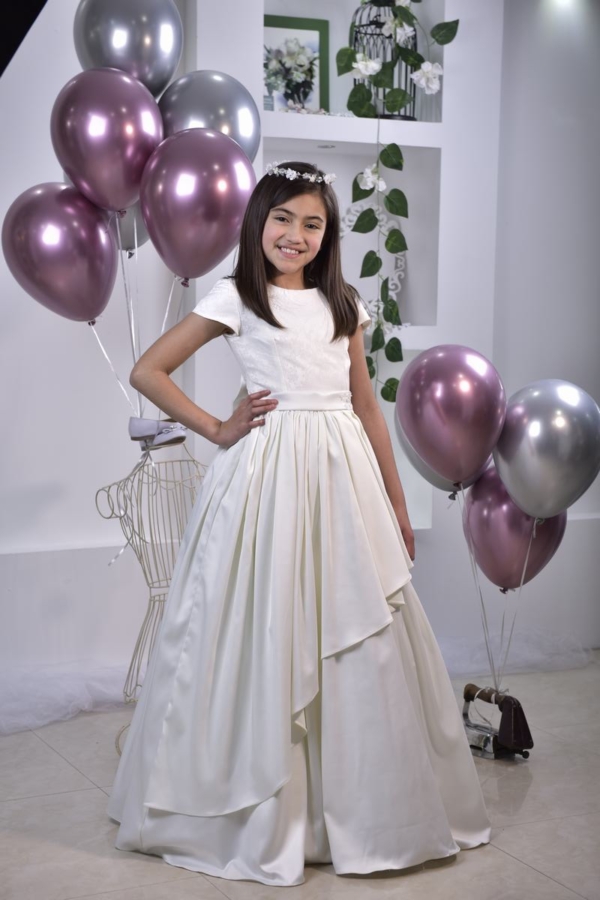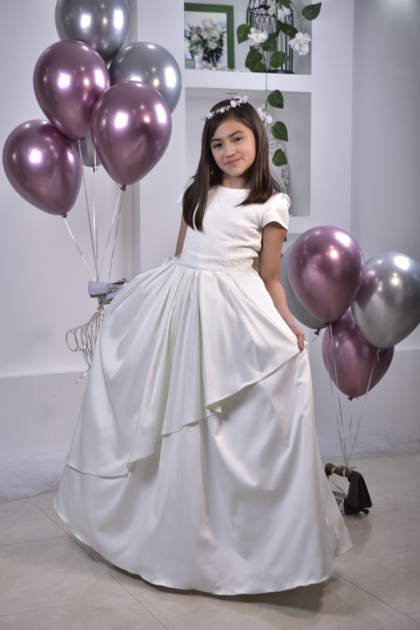 VESTIDO CORPIÑO EN BLONDA CON MANGA CORTA FALDA EN SATIN CON CAPA ASIMETRICA FAJON EN CINTURA CON LISTONES
