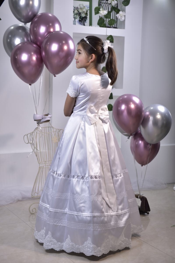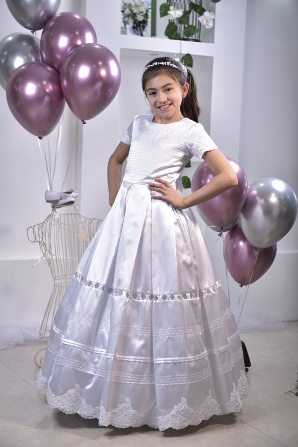 VESTIDO CON PLIEGUES HORIZONTALES MANGA CORTA FALDA PRINCESA EN TABLAS CON BORDADOS Y CENEFA EN BORDE
