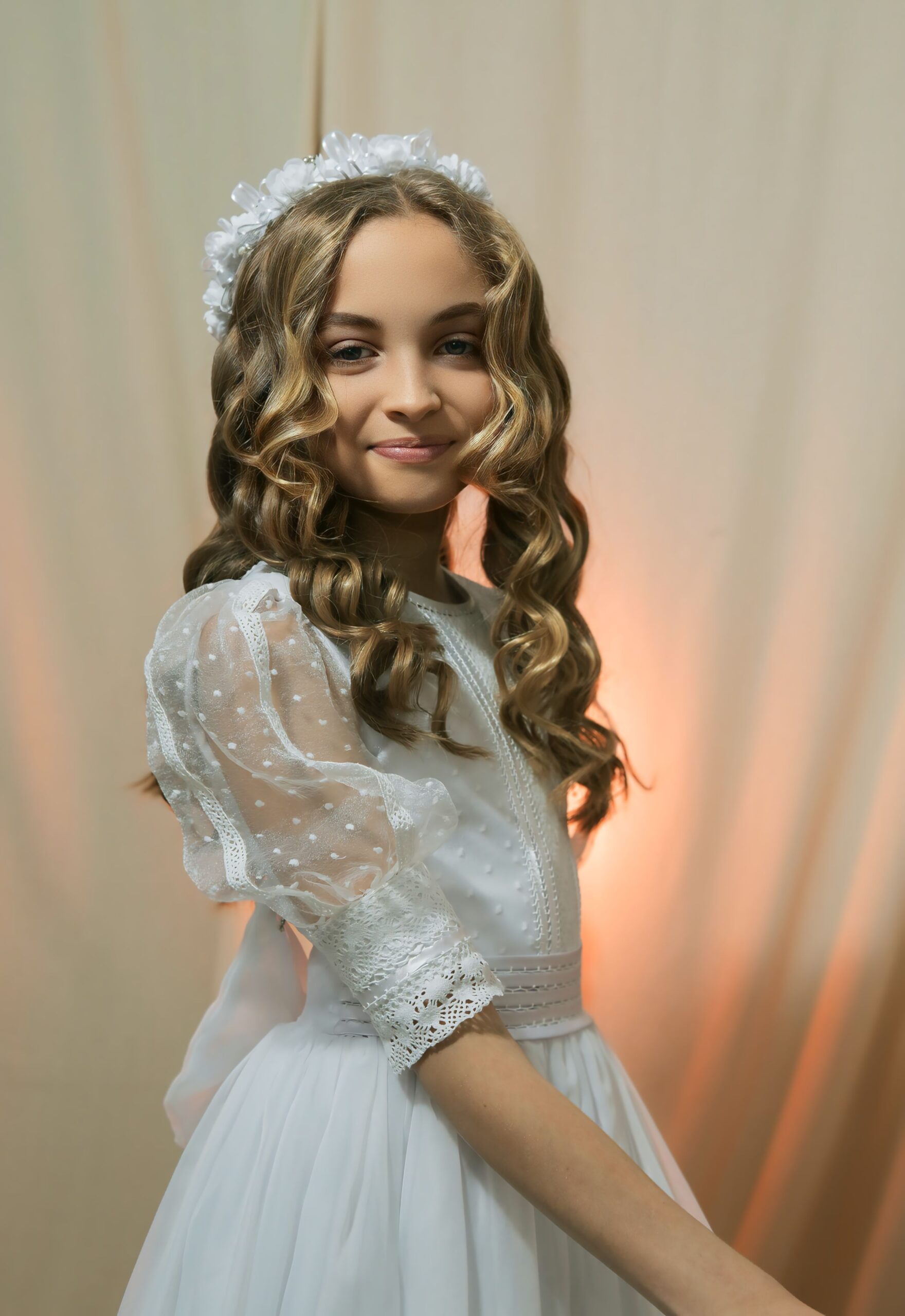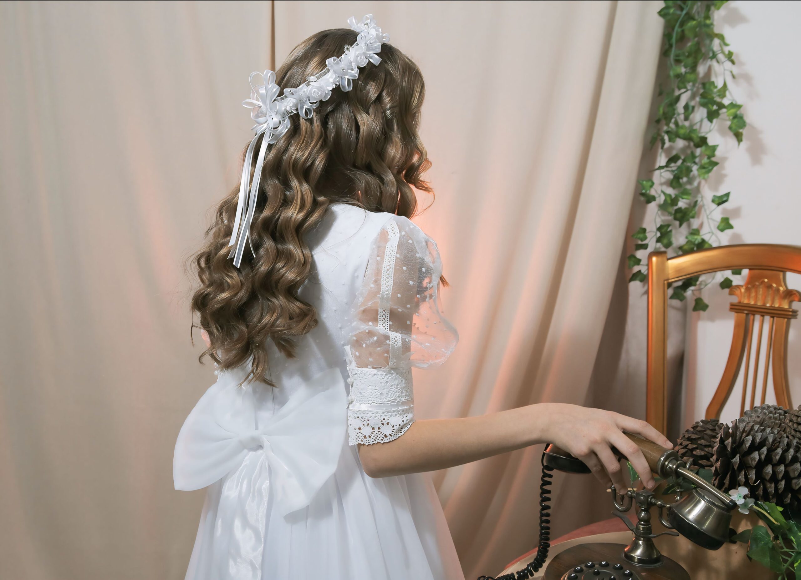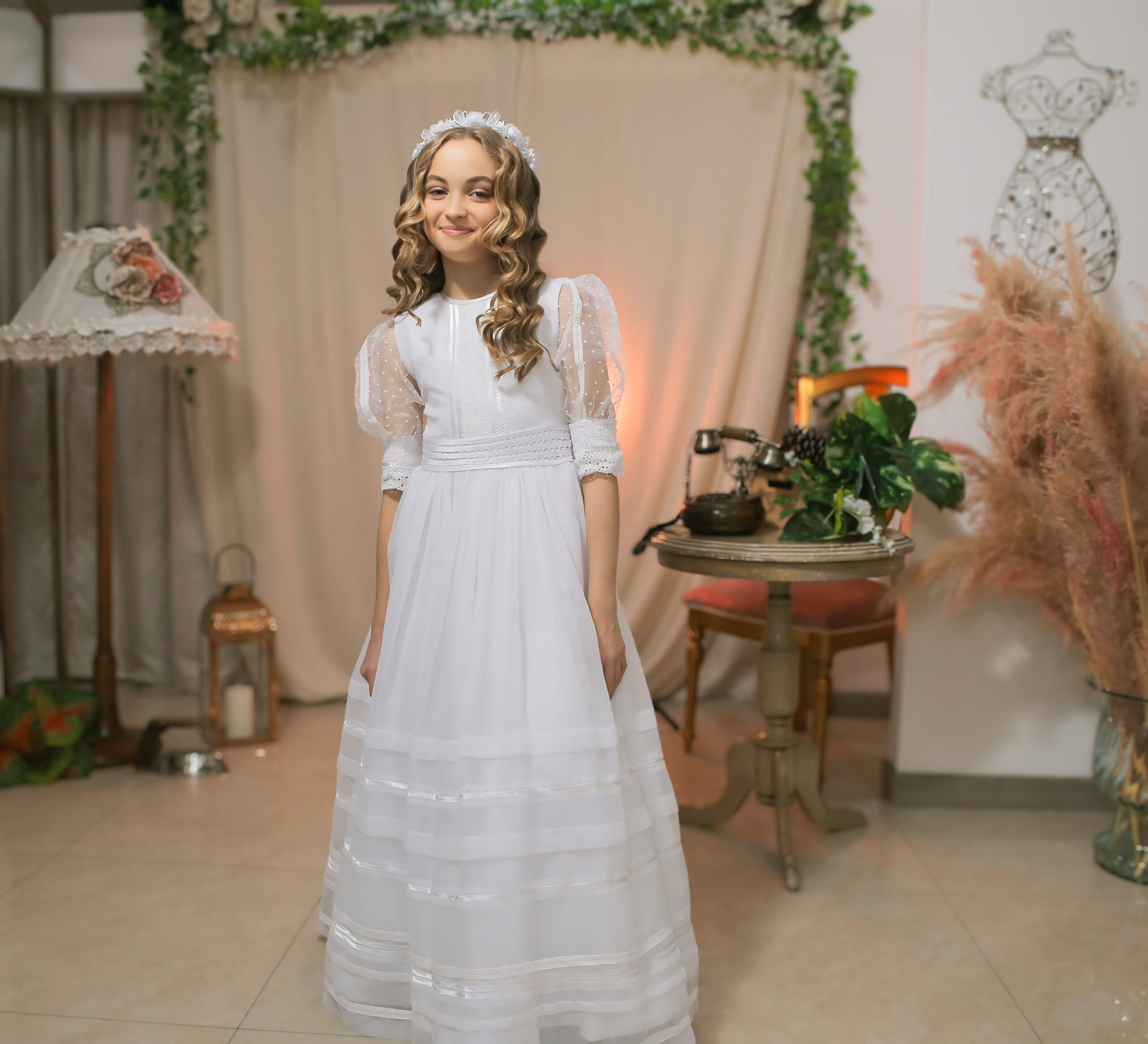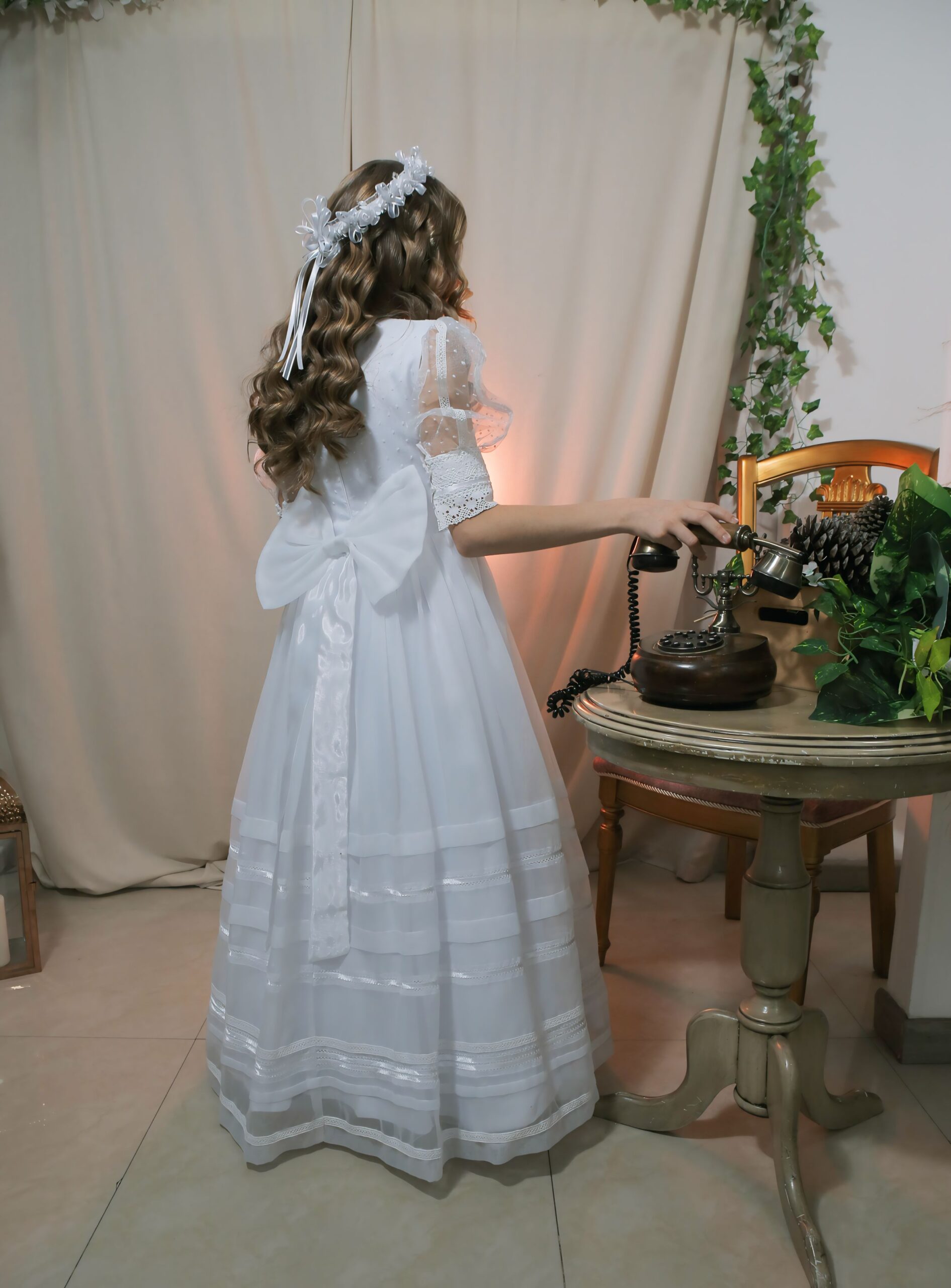 Vestido de primera comunión, corpiño con cuello redondo, base con técnica pate cabra, sobre tela con tul bordado en puntos, manga hasta el codo con puño en encaje y falda rotonda con alforzas inferiores y moño decorativo posterior.