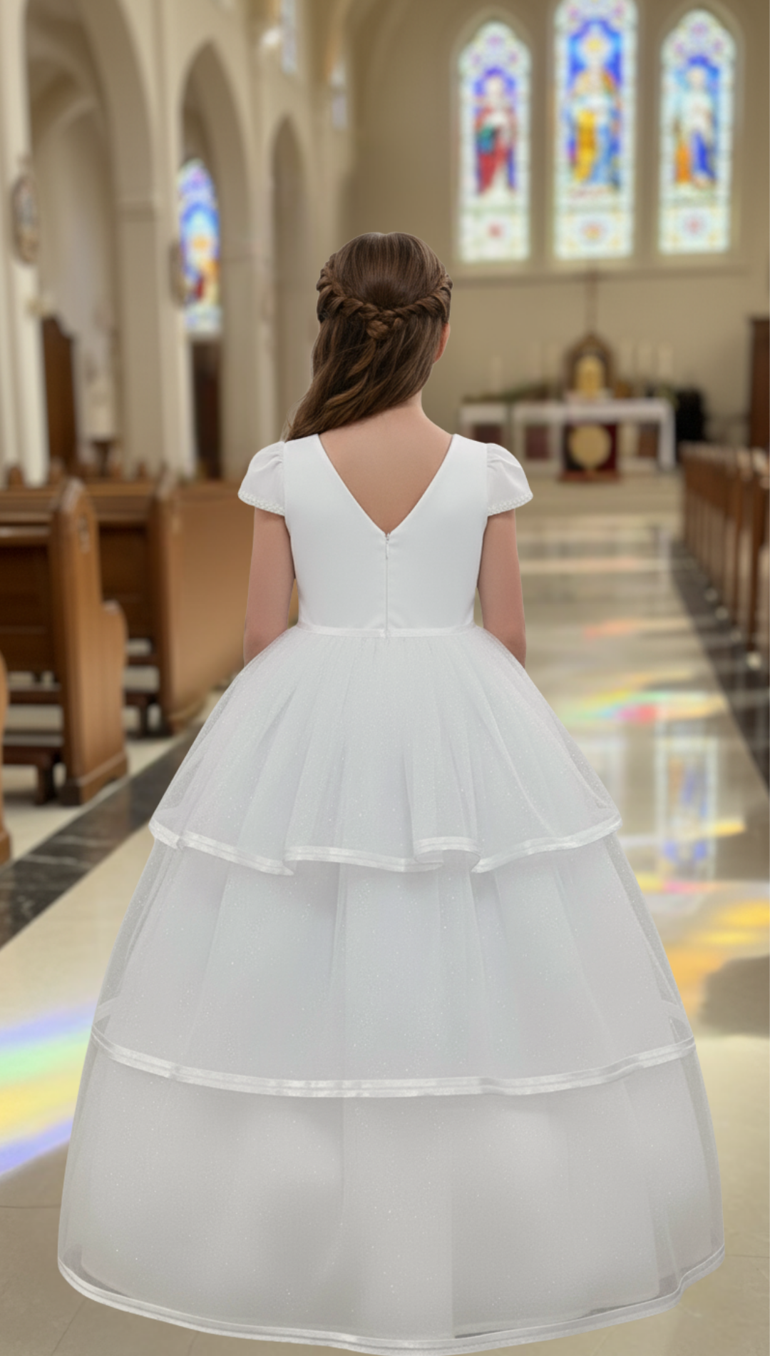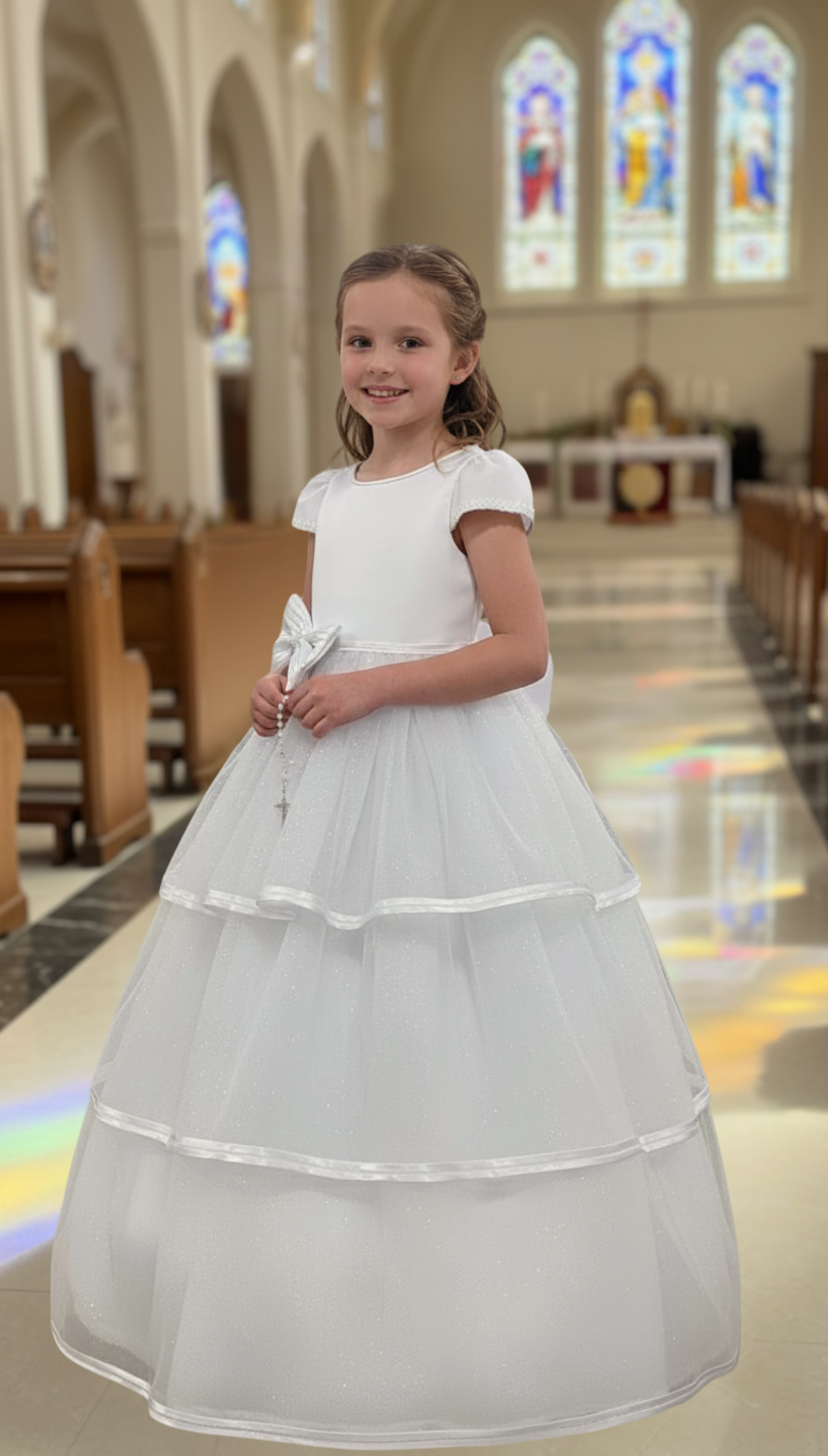 Vestido de primera comunión con silueta línea A, escote redondo y mangas cortas con terminación curva. El cuerpo es liso y lleva un moño de gran tamaño ubicado en la cintura hacia un costado. La falda está construida en varias capas con tres niveles visibles, cada uno delimitado por un vivo horizontal.