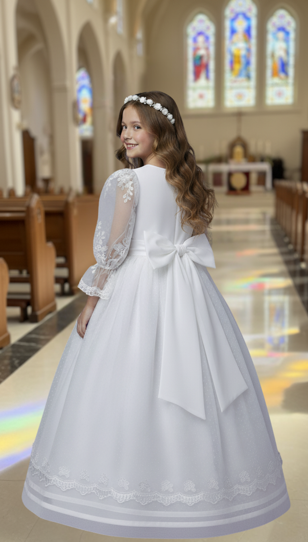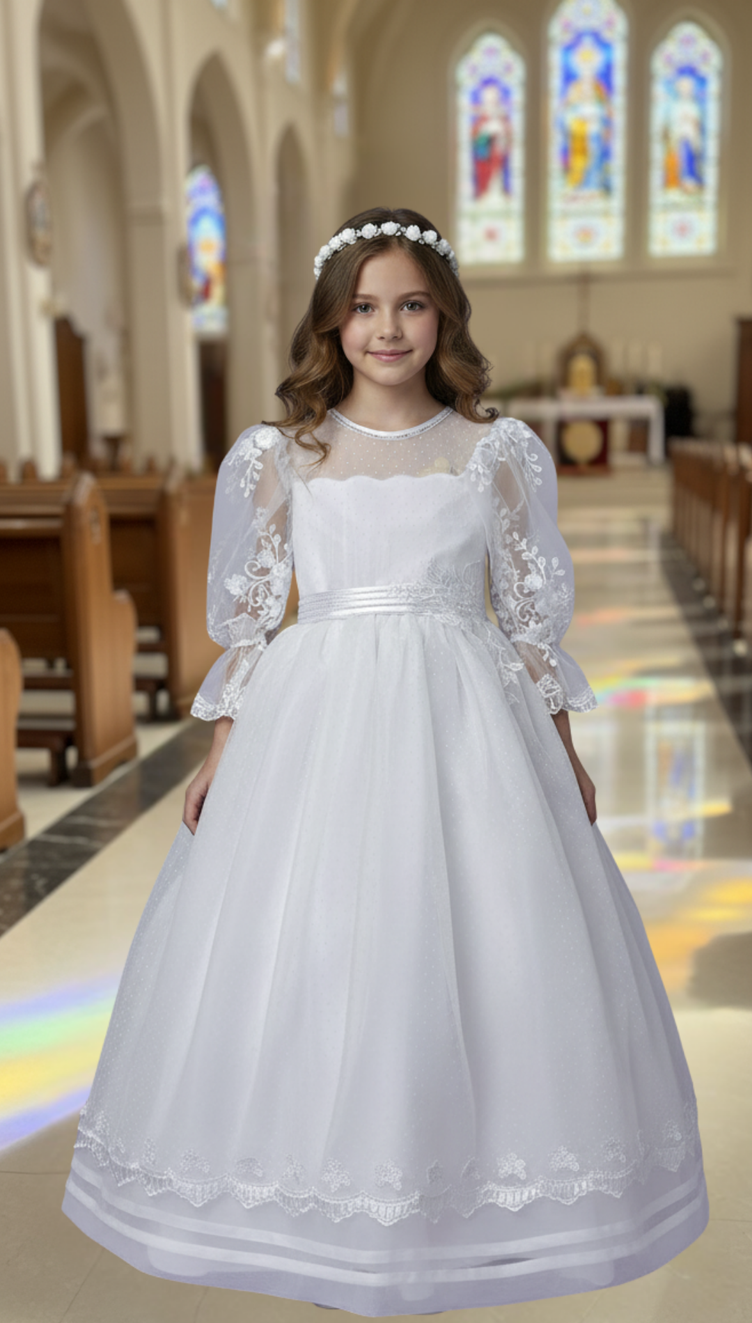 Vestido de primera comunión confeccionado en tejido con motivo de puntos aplicados, con canesú superior en tul liso y escote redondo. El cuerpo presenta base lisa y se une a un fajón horizontal en raso con bordado lineal. Las mangas son tres cuartos en tul bordado con motivo floral y terminación en puño con encaje. La falda amplia está construida en capas con tul de puntos como capa superior y ruedo con aplicación de encaje bordado y franjas horizontales de organza.