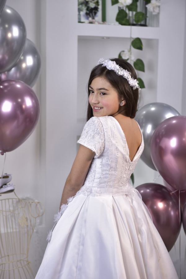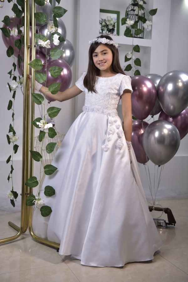 VESTIDO CUELLO REDONDO MANGA CORTA CORPIÑO EN ENCAJE CHANTILLY FALDA SATINADA EN TABLAS CON FAJON EN FLORES 3D, ESPALDA ESCOTE EN V