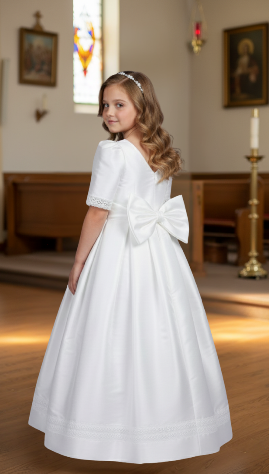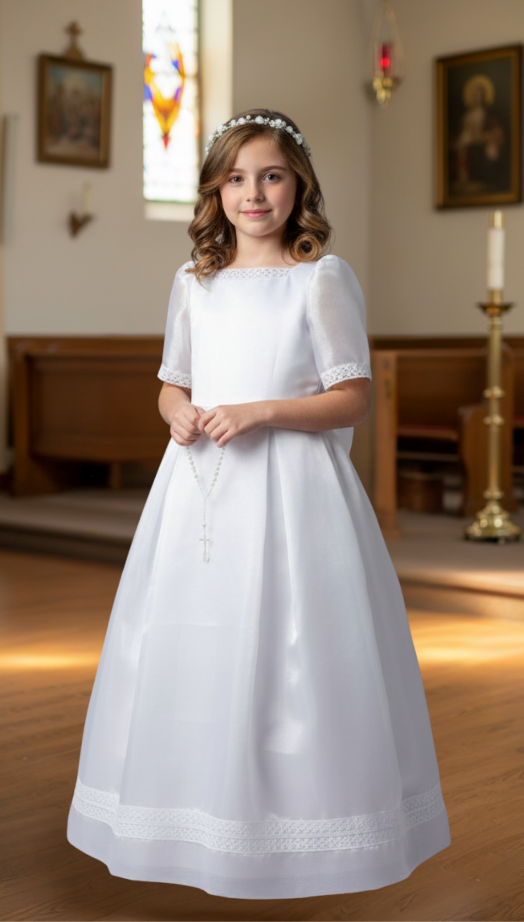 Vestido de primera comunión confeccionado en tejido liso con cuerpo de manga corta y escote redondo. El diseño incorpora terminación de encaje lineal en el borde de las mangas y en el ruedo. La falda está construida en capas con capa superior lisa y franjas horizontales de encaje aplicadas en la parte inferior.