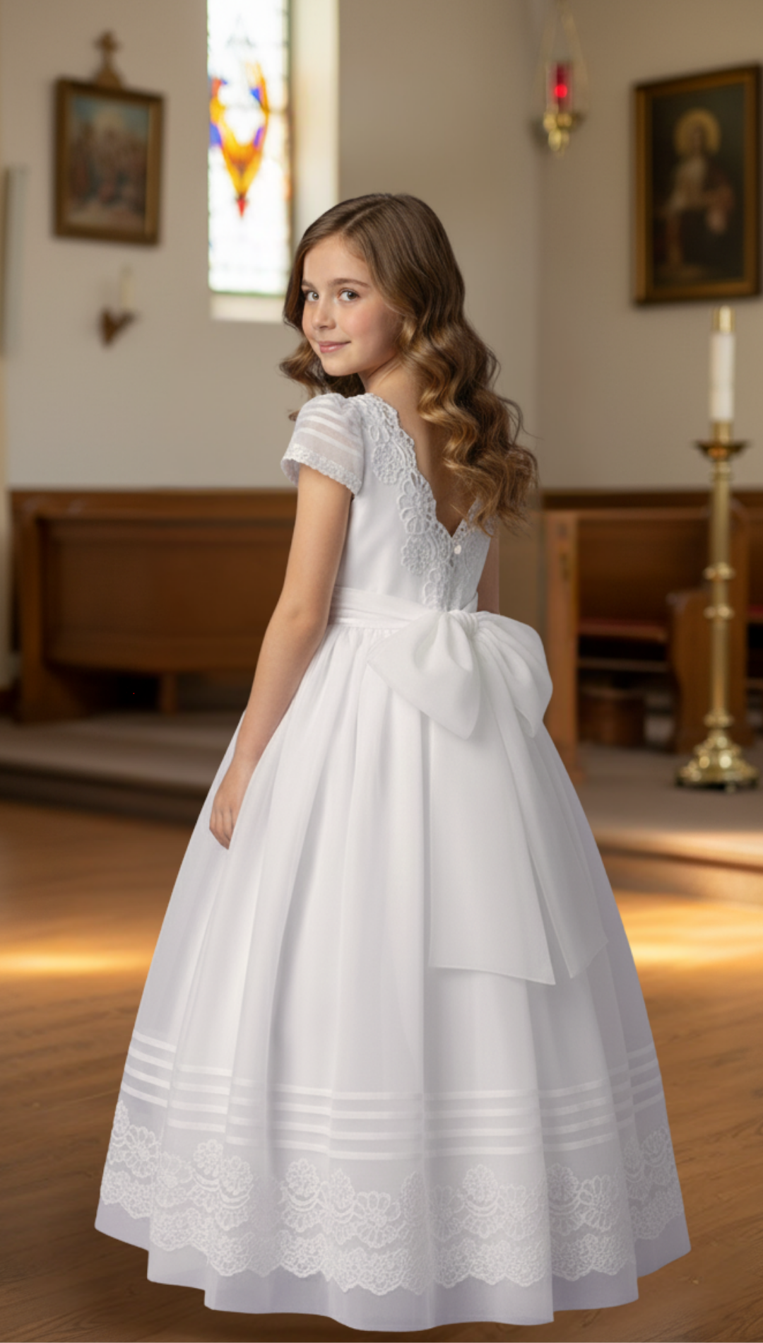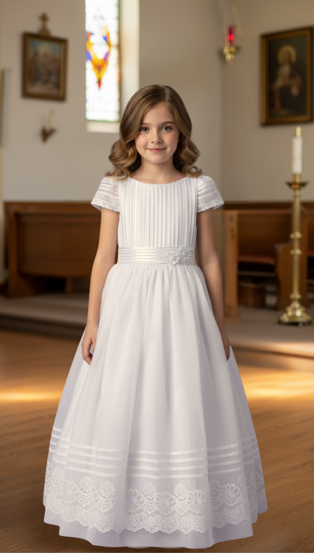 Vestido de primera comunión confeccionado en tejido liso con cuerpo de alforzas verticales y manga corta con terminación en encaje lineal. La cintura presenta fajón horizontal con aplicación floral al centro. La falda está construida en capas con capa superior lisa, franjas horizontales en la parte baja y aplicación de encaje bordado en el ruedo.