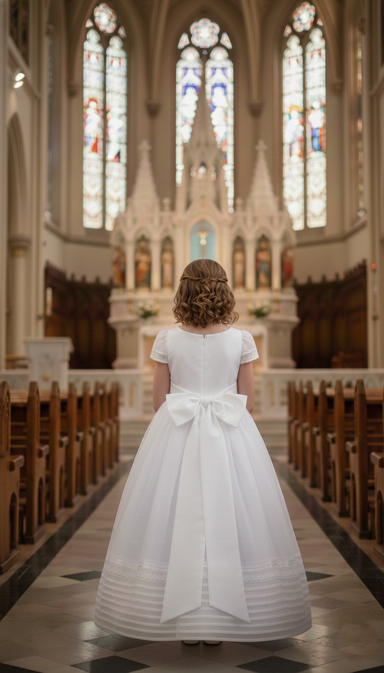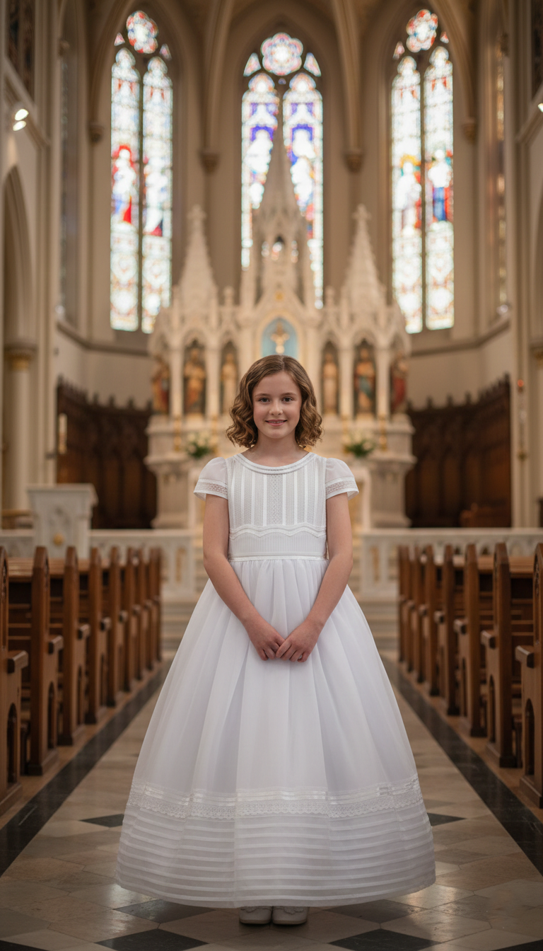 Vestido de Primera Comunión de silueta clásica con corte a la cintura, diseñado con un cuerpo presenta delicados detalles verticales en el frente y un acabado limpio que aporta sobriedad y elegancia. Incluye mangas cortas de diseño sencillo que brindan comodidad y un look tradicional. La falda es amplia, de largo ceremonial, con caída suave y volumen equilibrado, complementada por discretos detalles en el borde inferior.