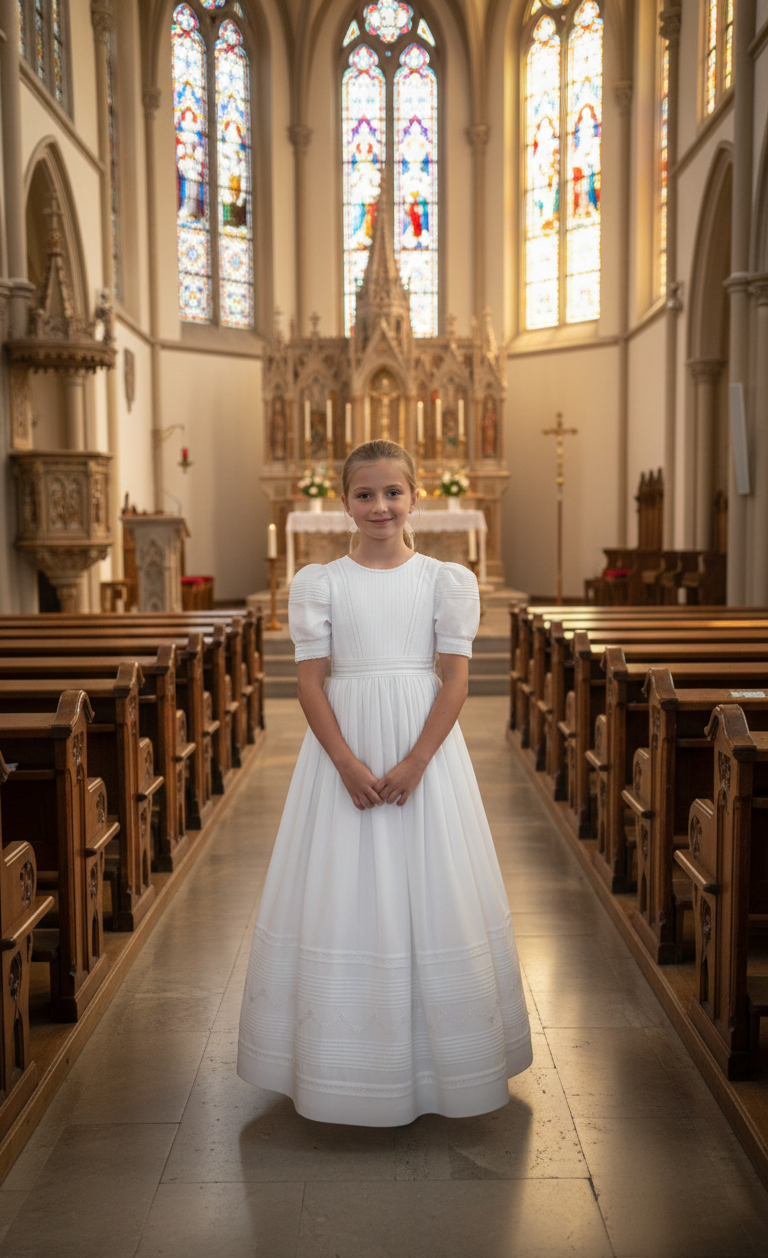 Vestido de Primera Comunión de silueta clásica con corte a la cintura, diseñado con un cuerpo de líneas limpias y detalles verticales sutiles que aportan estructura y elegancia. Presenta mangas cortas con ligero volumen que brindan un acabado delicado y tradicional. La falda es amplia, de largo ceremonial, con caída fluida y volumen equilibrado, complementada con discretos detalles horizontales en el borde inferior que enriquecen el diseño.