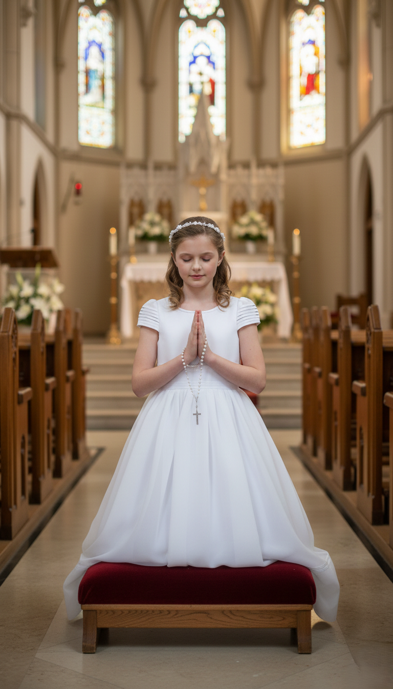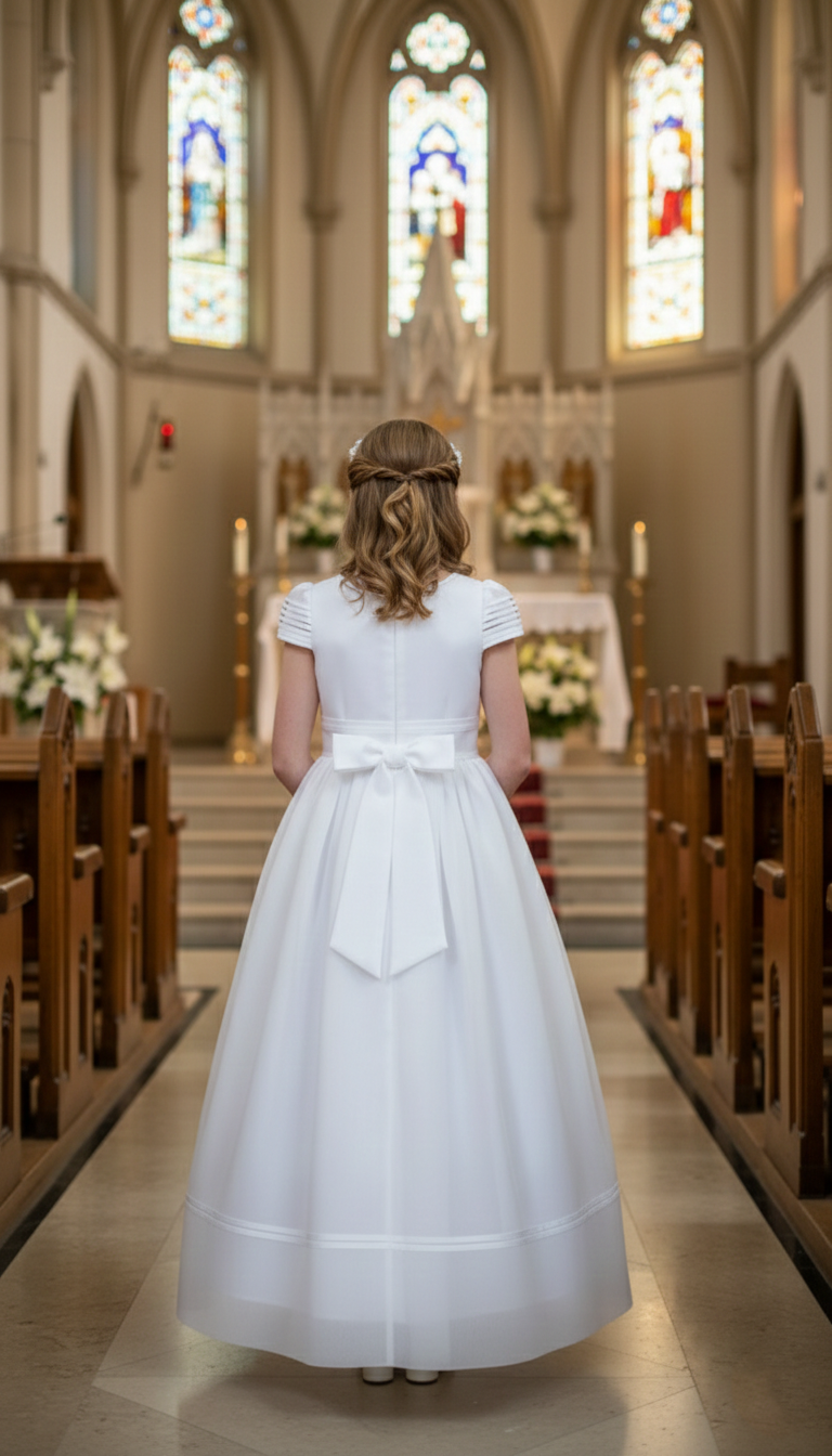 Vestido de comunión con escote en forma de círculo, cuerpo al torso, manga a la altura del hombro con pliegues en sentido horizontal, unión en cintura con banda, falda con frunces desde cintura hasta el piso, ruedo con aplicación de técnica pate cabra en sentido horizontal y cierre en parte de atrás.
