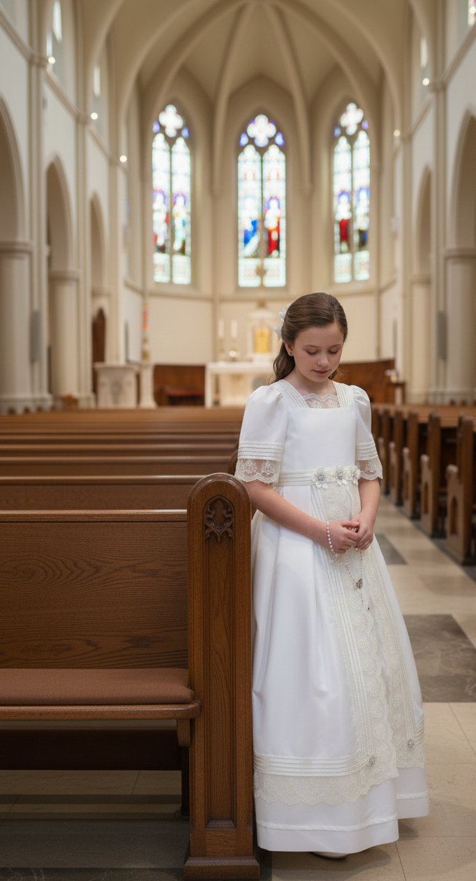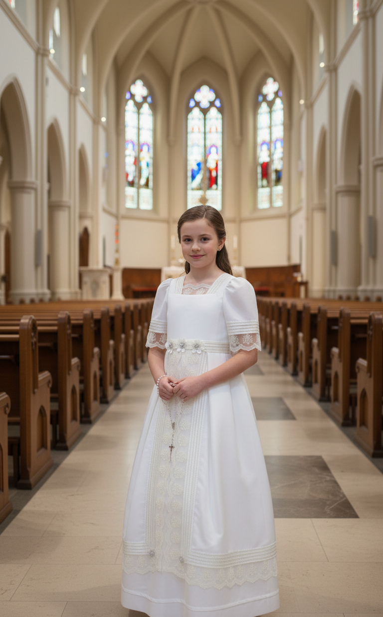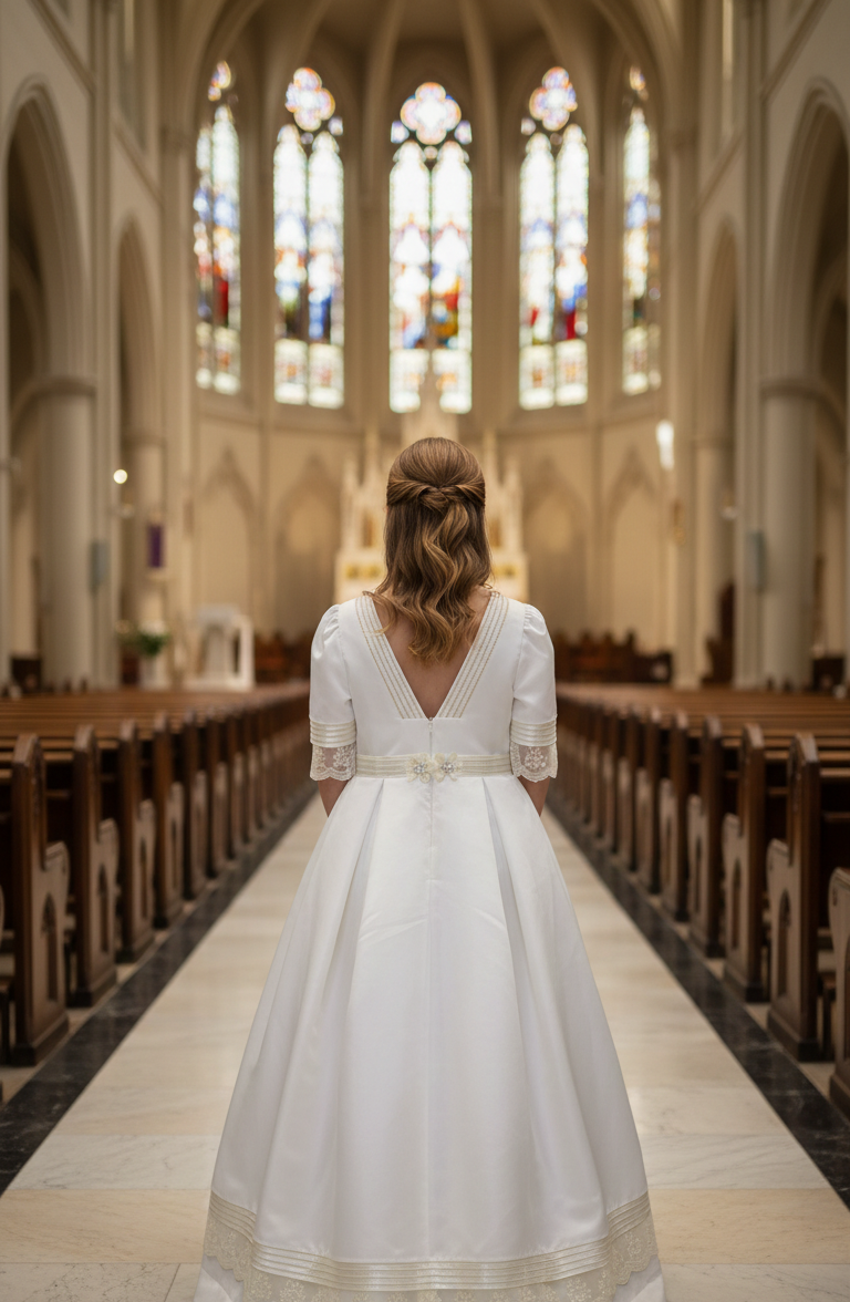 Vestido de comunión con escote en forma de cuadro, cuerpo al torso con panel central en frente y aplicación en borde superior, manga a la altura del codo con franja horizontal y terminación con aplicación, unión en cintura con banda y aplicaciones en frente, falda con caída recta hasta largo al tobillo con panel central decorativo en frente, ruedo con franjas horizontales y aplicación en borde, cierre en parte de atrás.