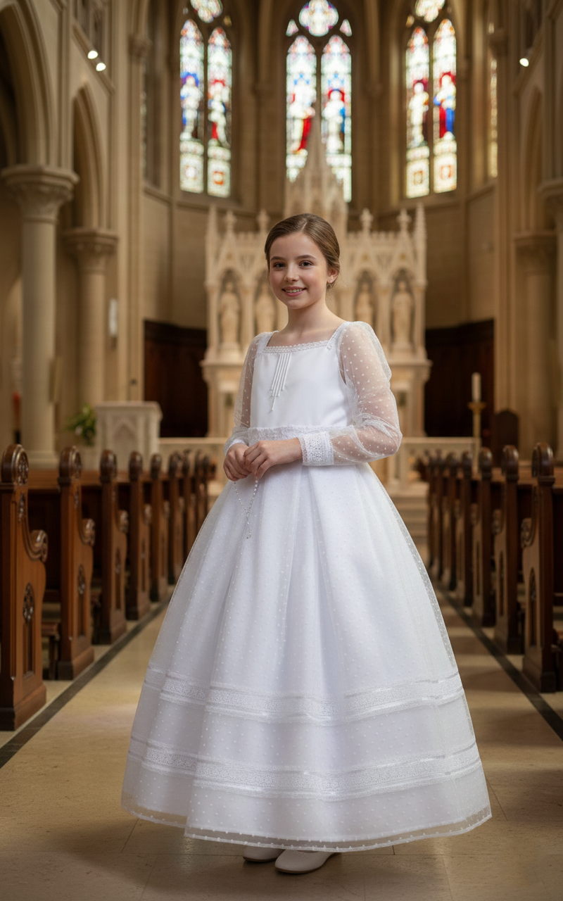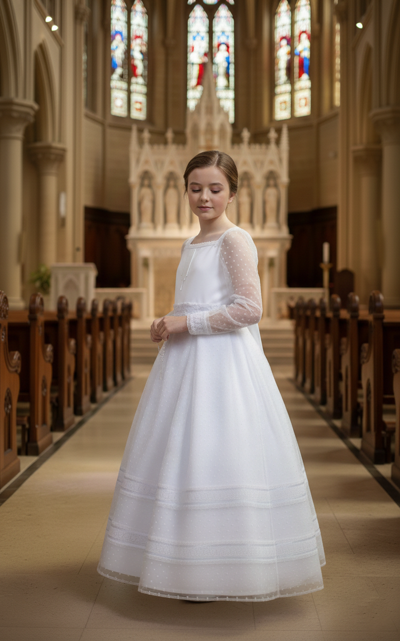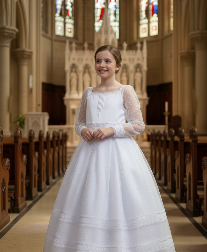 Vestido de comunión con escote en forma de cuadro, cuerpo al torso con panel central en frente y detalle lineal vertical, manga larga en transparencia con puntos y puño definido, unión en cintura con banda, falda con volumen desde cintura hasta el piso con capas superpuestas y franjas horizontales en parte inferior, cierre en parte de atrás