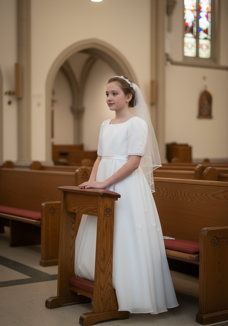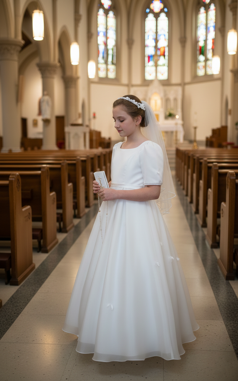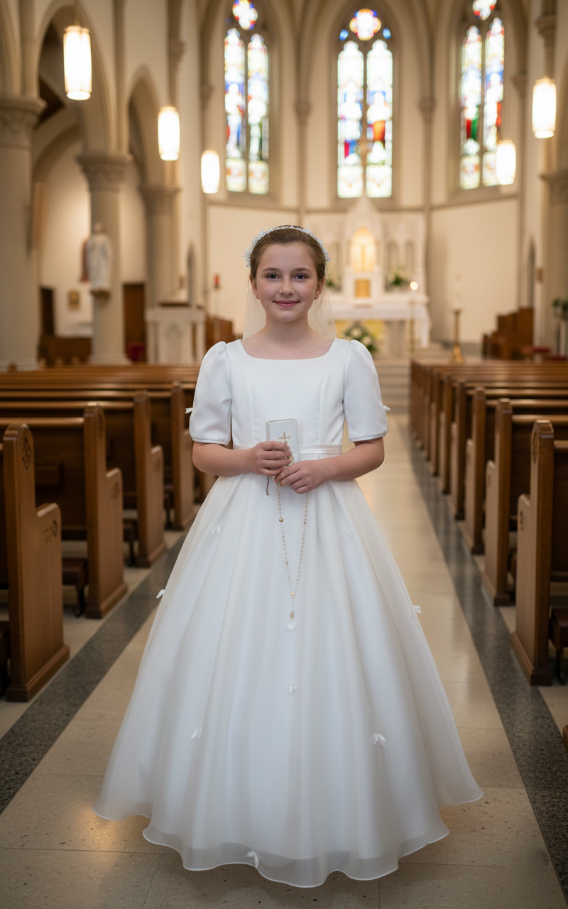 Vestido de comunión con escote en forma de cuadro, cuerpo al torso con cortes verticales, manga corta con volumen en hombro, unión en cintura con banda, falda con amplitud desde cintura hasta el piso con aplicaciones distribuidas en superficie y cierre en parte de atrás.