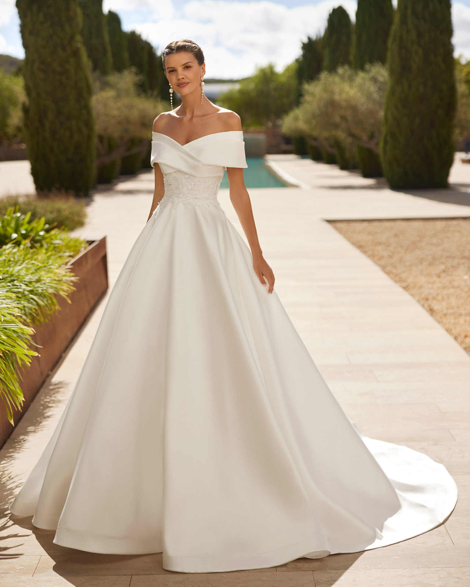 Vestido de novia Rosa Clará, silueta princesa, escote palabra de honor con banda cruzada sobre los hombros en efecto off shoulder, cuerpo ajustado con aplicaciones concentradas en el torso, cintura definida, falda amplia de volumen continuo desde la cintura hasta el suelo, cola integrada de longitud media.