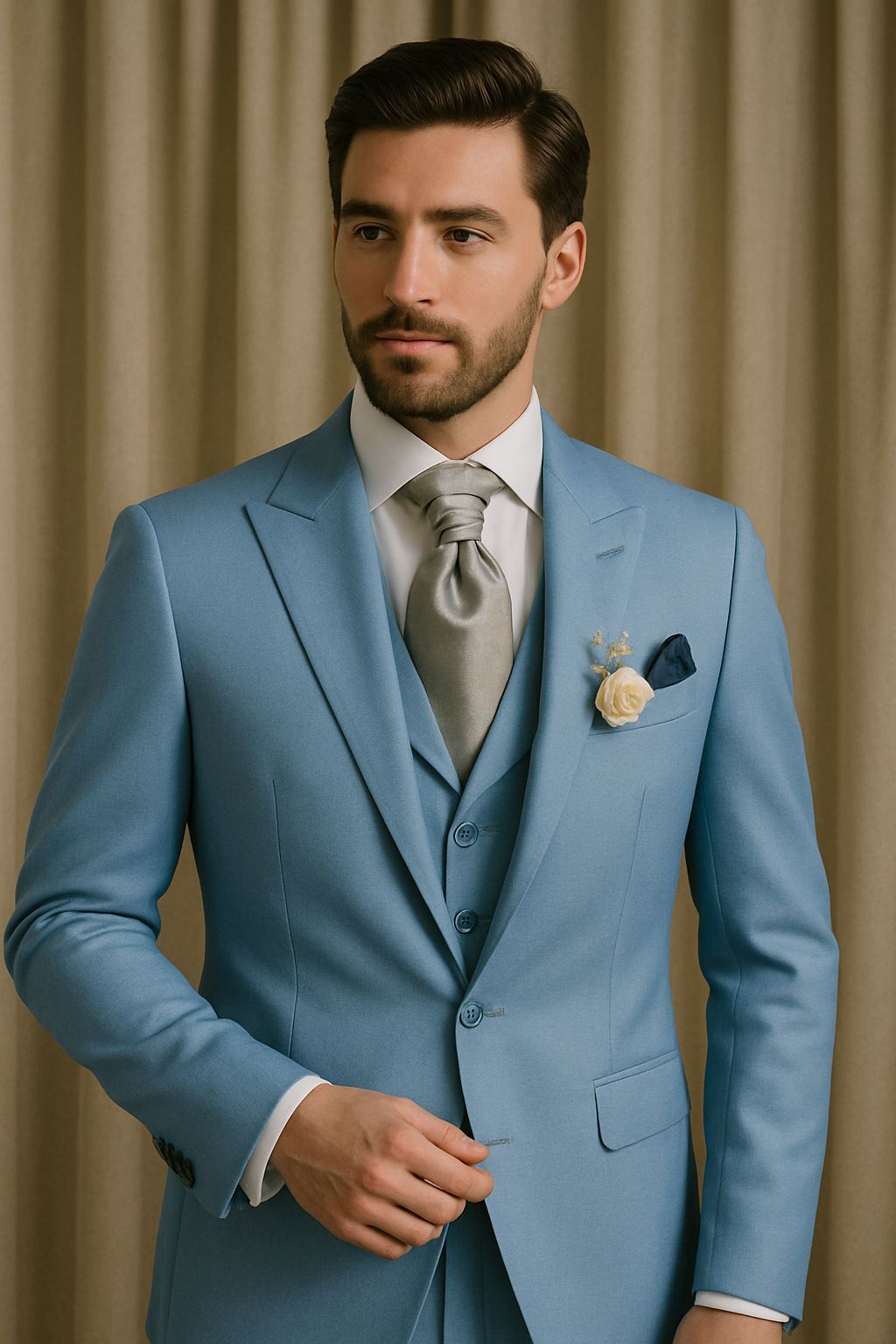 | Traje de tres piezas conformado por saco, chaleco y pantalón en tejido liso. El saco presenta solapa de pico, cierre de dos botones frontales, bolsillo tipo ojal en el pecho con pañuelo decorativo y flor prendida, y dos bolsillos con solapa en la parte inferior. El chaleco lleva cierre frontal con cuatro botones y escote en pico. El pantalón tiene corte recto y cinturilla clásica. |