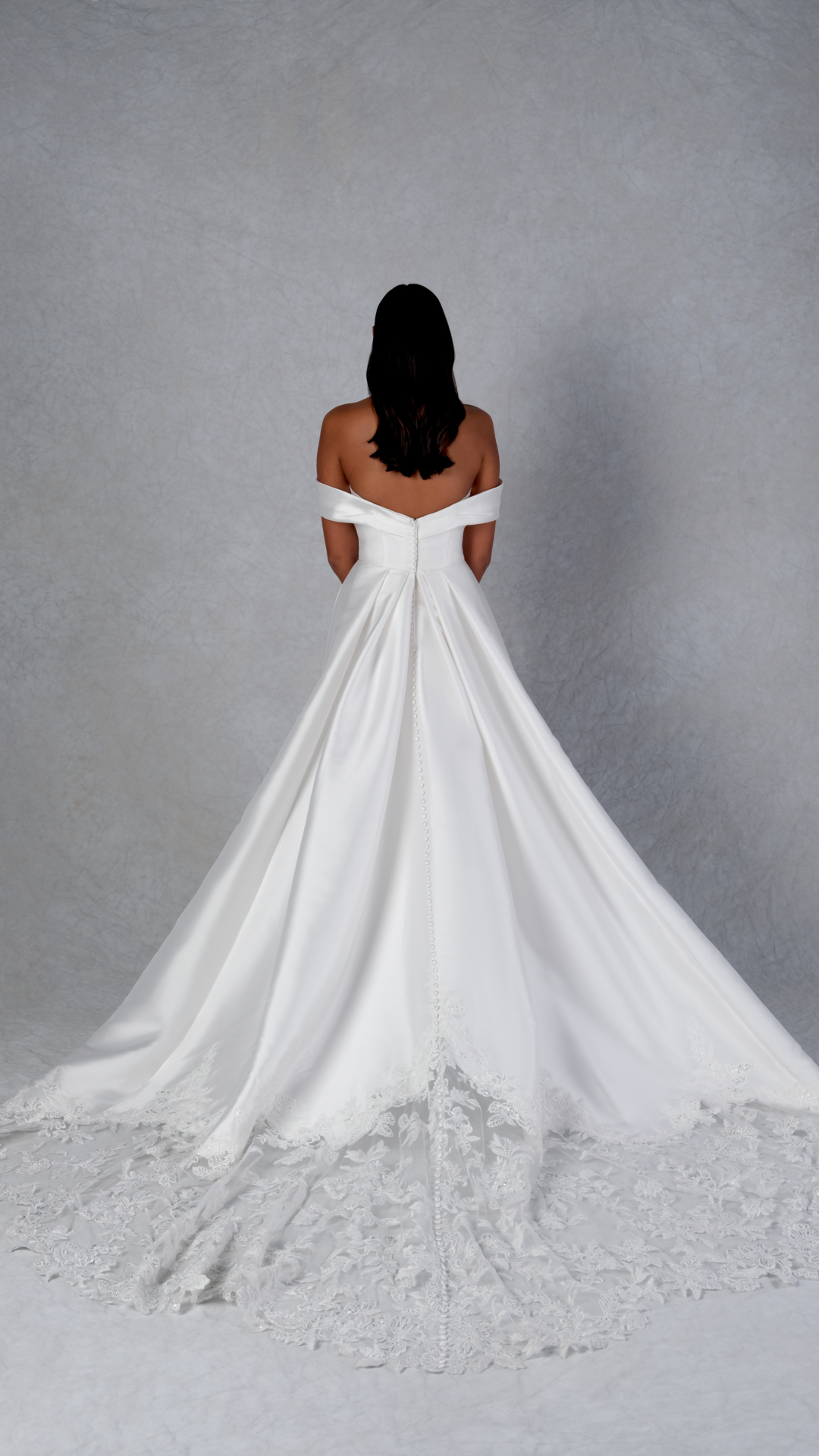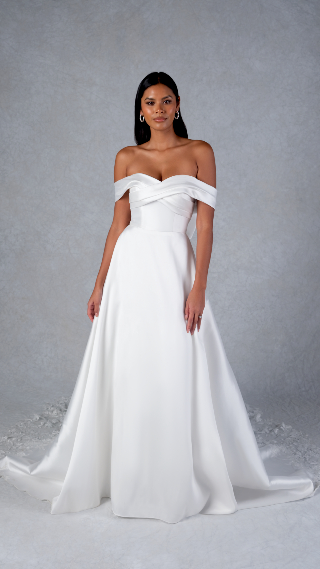 Vestido de novia con escote en forma de corazón estructurado. Corsé interno con soporte completo y cortes verticales que definen la construcción del torso. Detalle superior con drapeado cruzado que forma una caída fuera de los hombros. Cintura marcada mediante corte horizontal.