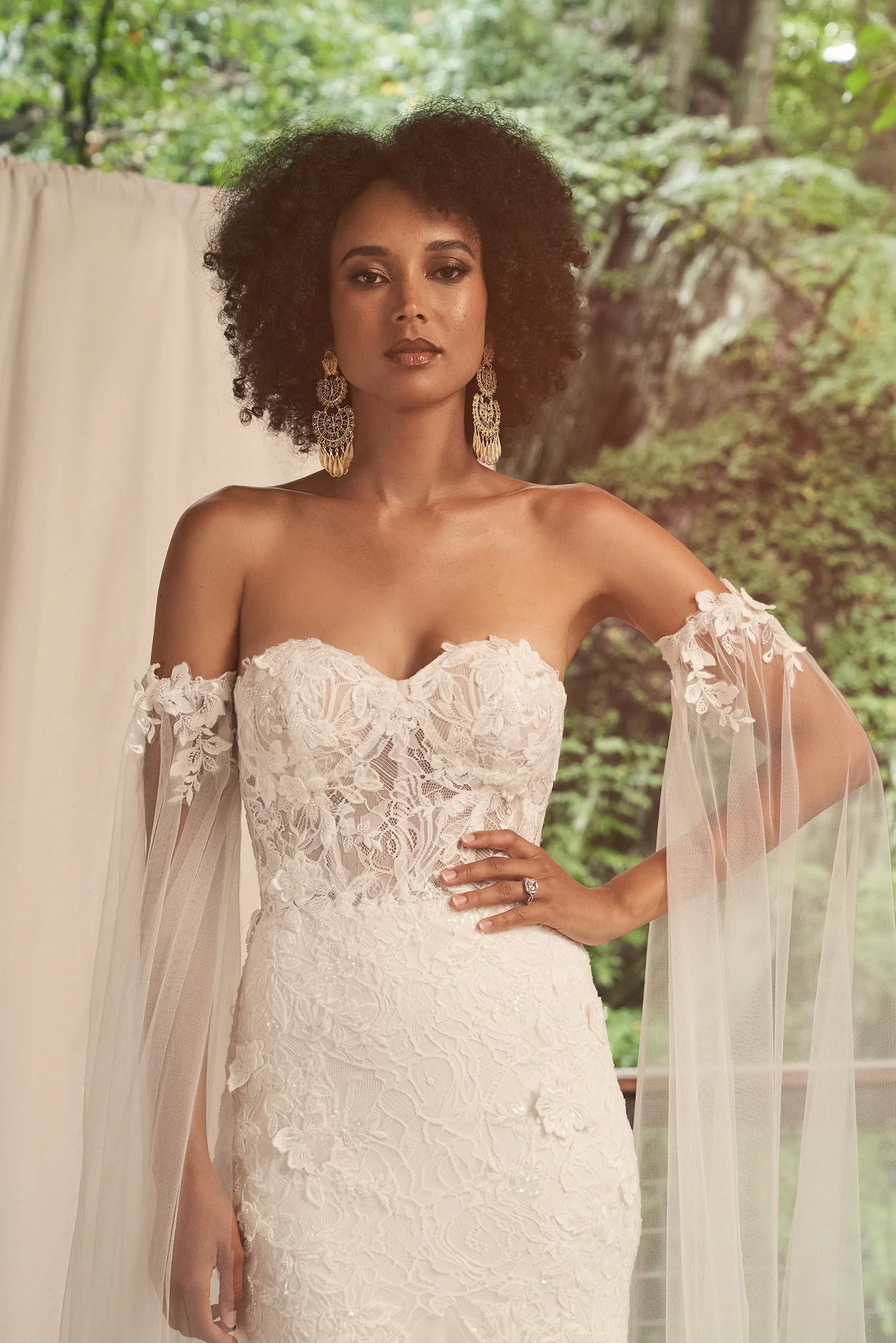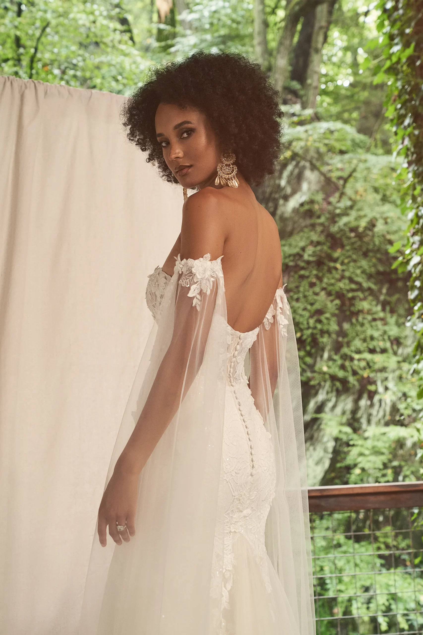 Vestido de novia bohemio combina elegancia y ligereza con una silueta sirena que realza la figura, confeccionado en un delicado encaje de patrón floral, escote en V, espalda abierta y falda que se extiende en una espectacular cola que añaden un acabado majestuoso.