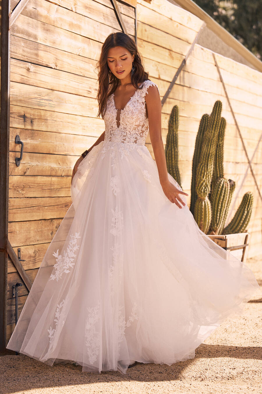 Vestido de novia confeccionado en tul con aplicaciones bordadas en encaje floral. El cuerpo presenta escote profundo en forma de “V” con transparencia central y tirantes anchos formados por el mismo encaje del corsé. La parte superior está estructurada con varillas internas y el cierre posterior es con cremallera invisible. La falda es amplia, formada por varias capas de tul con bordados distribuidos desde la cintura hasta el ruedo, e incluye una cola prolongada elaborada en el mismo tejido.