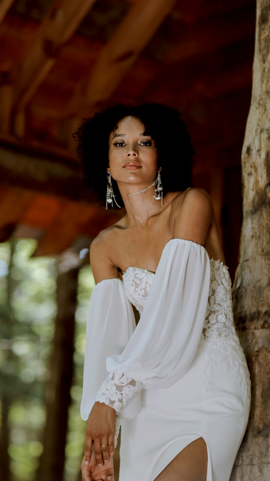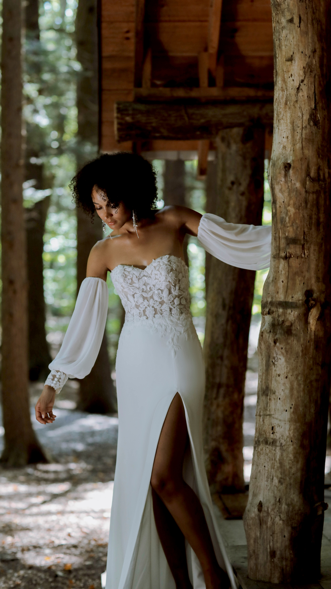 Vestido de novia con silueta ajustada y abertura frontal lateral. Escote en forma de corazón con estructura interna de corsé y soporte completo. Mangas largas tipo off shoulder con volumen en la parte superior y ajuste en el puño. Cuerpo con bordado aplicado en la parte superior y transición limpia hacia la falda lisa. Extensión posterior tipo cola con terminación en diseño floral.