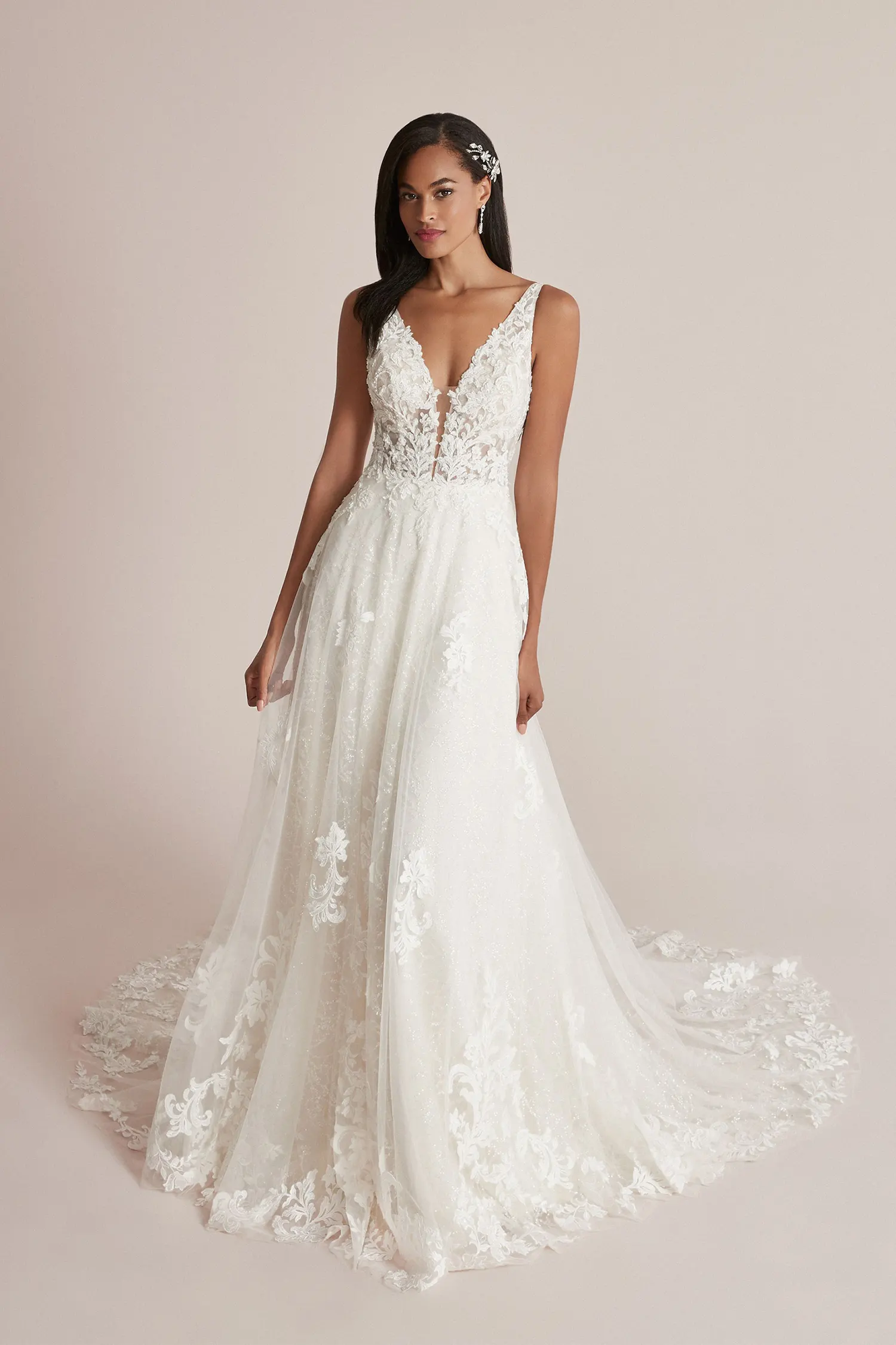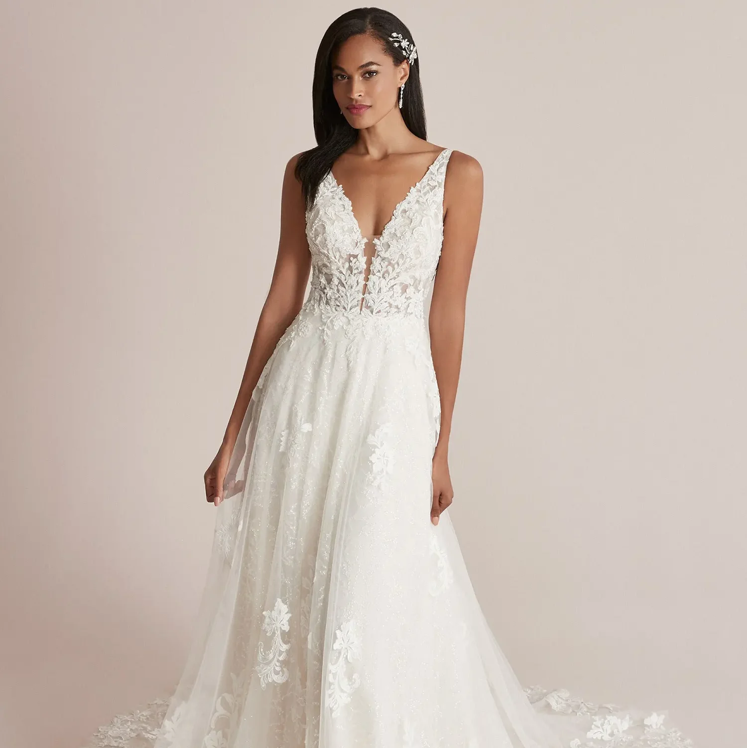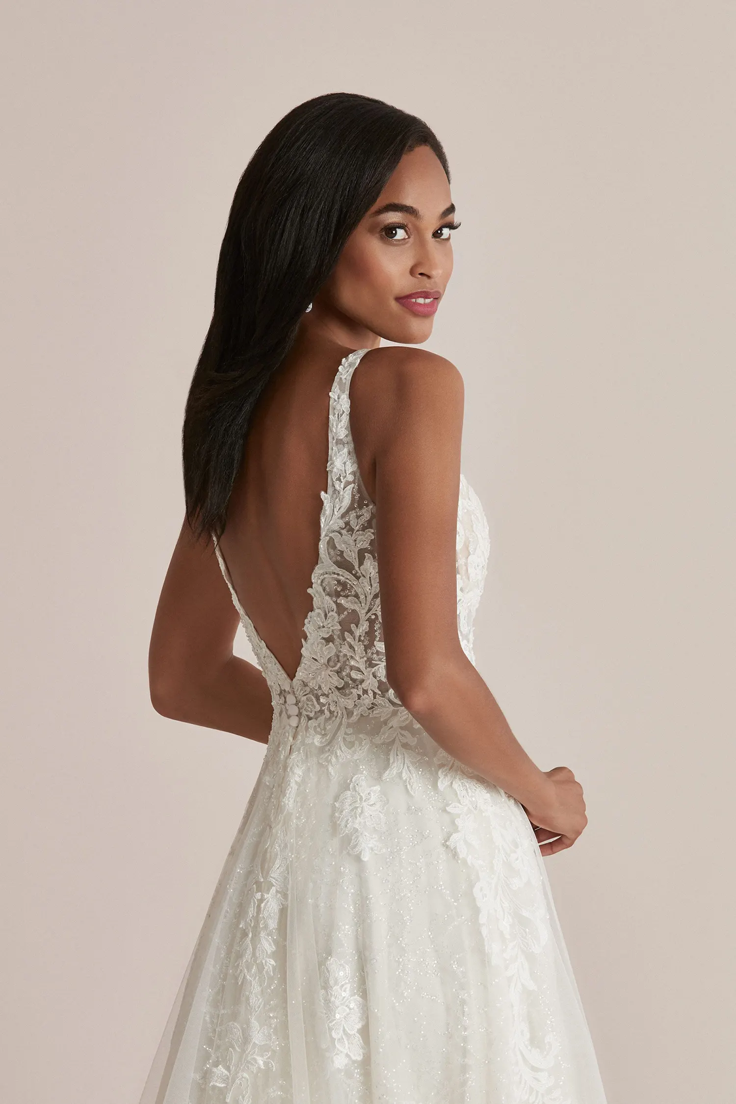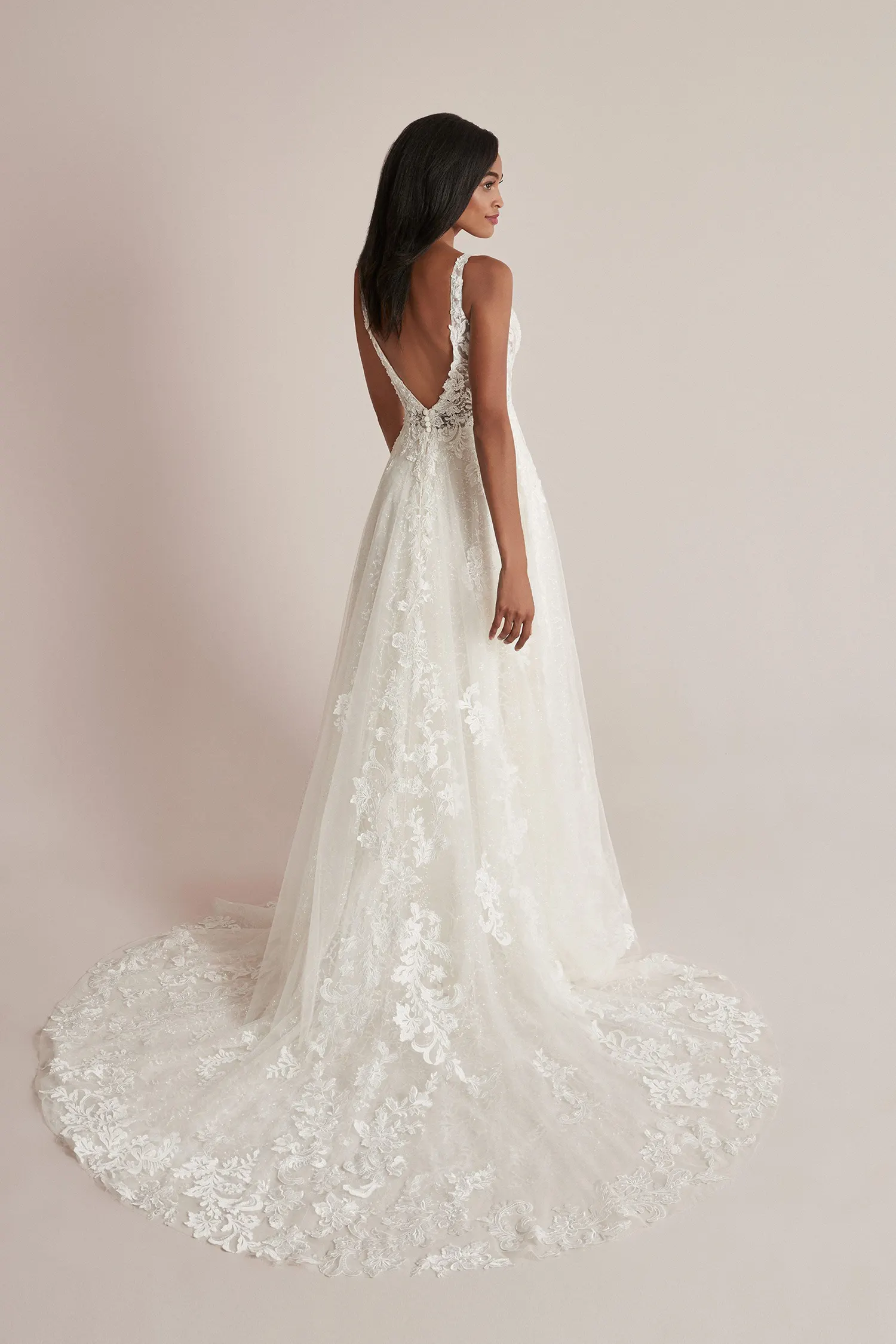 Vestido de novia con silueta en línea “A” y escote profundo en forma de “V” con transparencias estructurales. Corsé interno con soporte completo y cortes verticales que definen el torso. Tirantes finos integrados al escote delantero y trasero. Cuerpo con apliques distribuidos de manera simétrica sobre la parte superior y transición gradual hacia la falda. Falda amplia con superposición de capas y prolongación posterior tipo cola media.