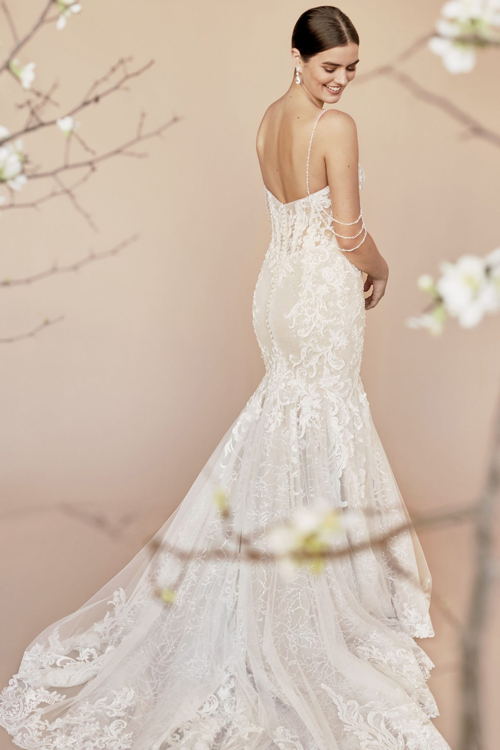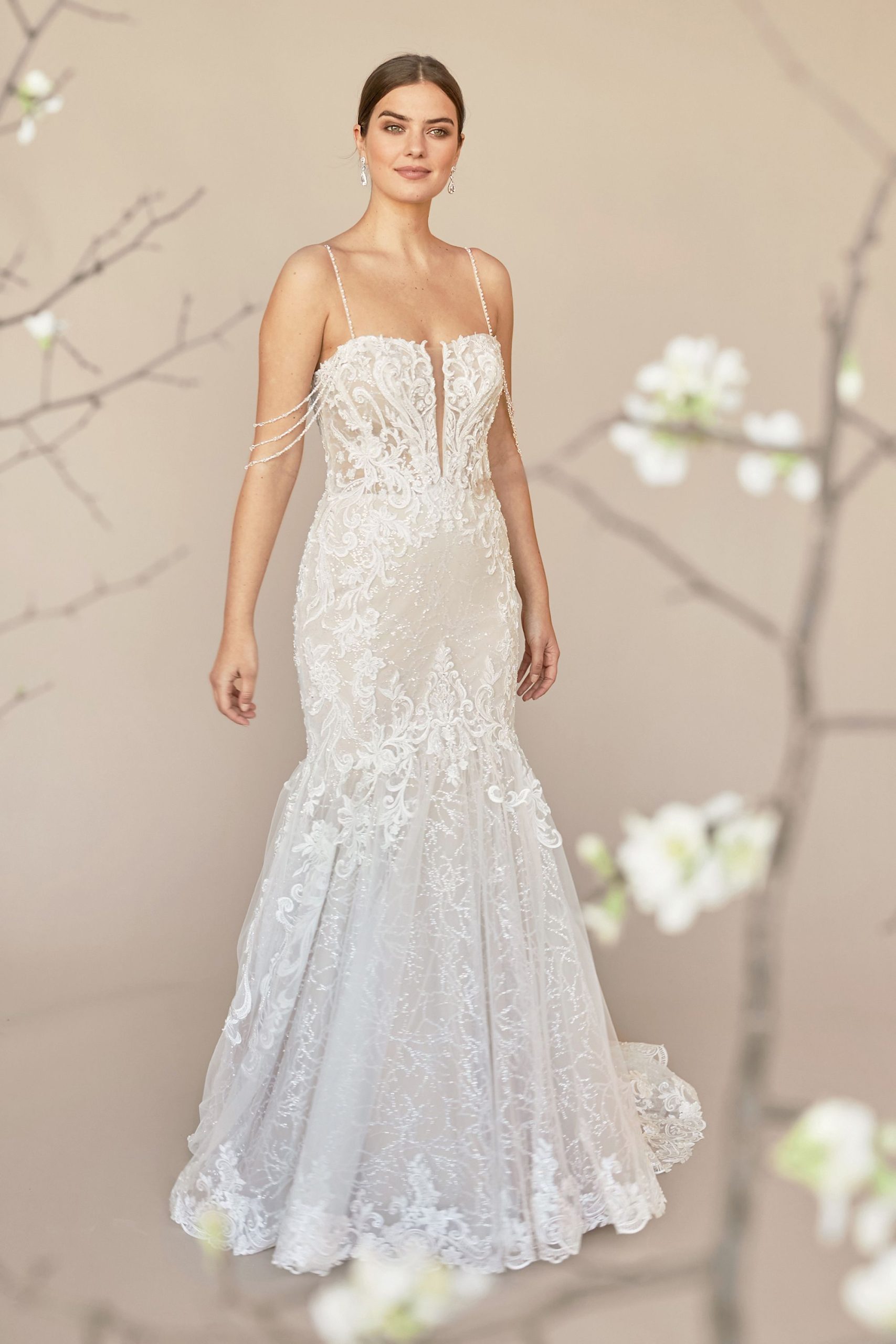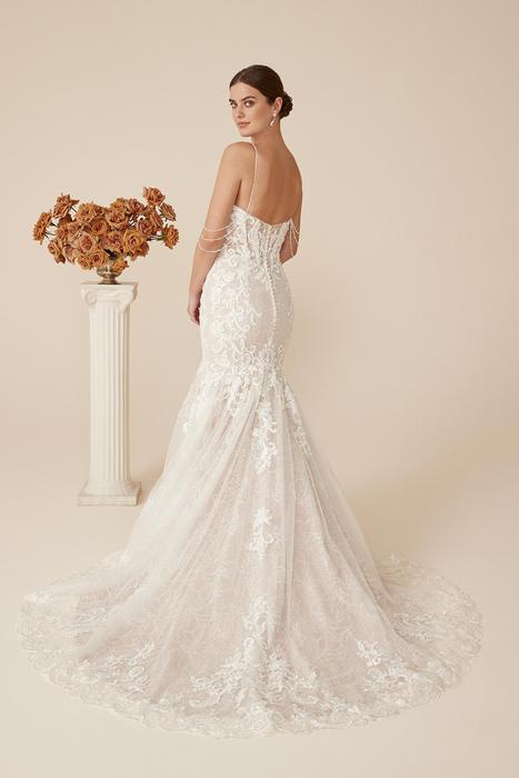 | El vestido está confeccionado en encaje bordado con aplicaciones de hilo y lentejuelas. Presenta escote profundo con transparencia central reforzada por tul invisible y estructura interna con varillas. Los tirantes son finos y decorados con cadenas de perlas que caen sobre los brazos. El corpiño tiene efecto ilusión con terminación en línea natural. La falda es de silueta sirena con ensamble en capas de tul bordado. |