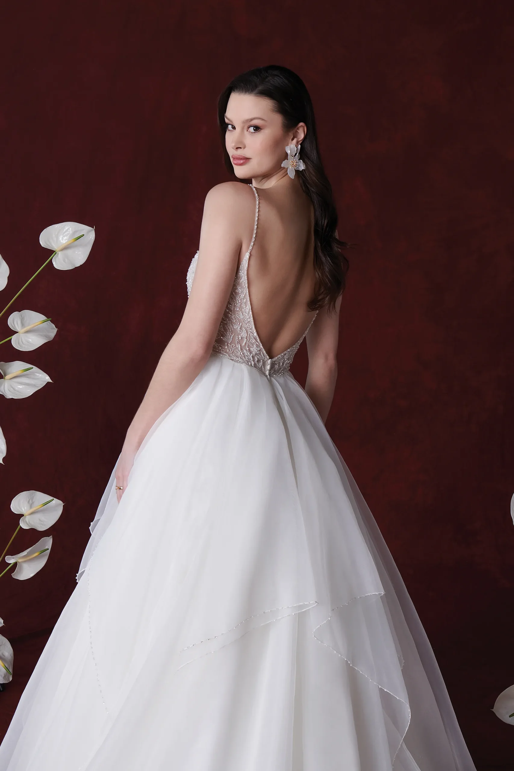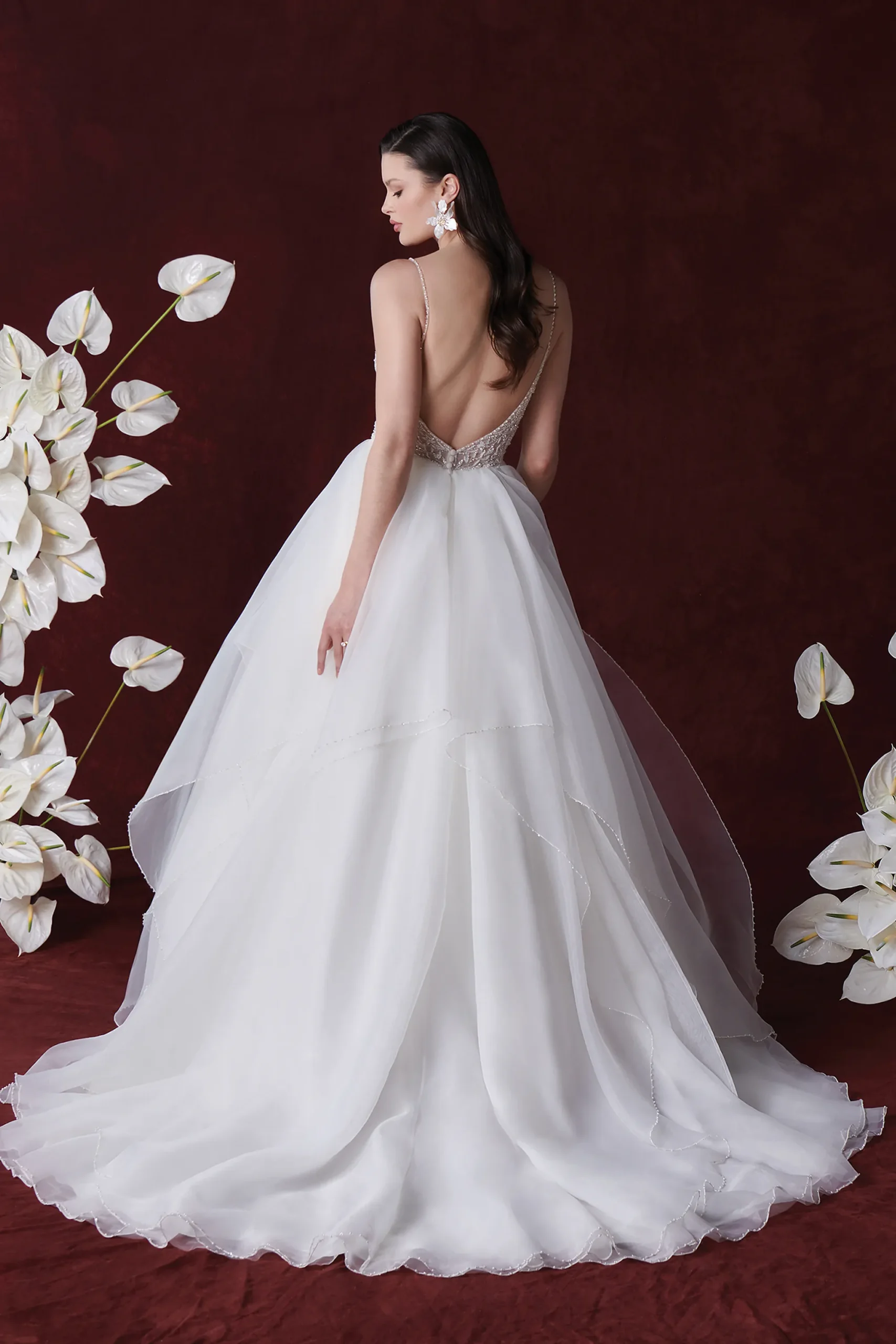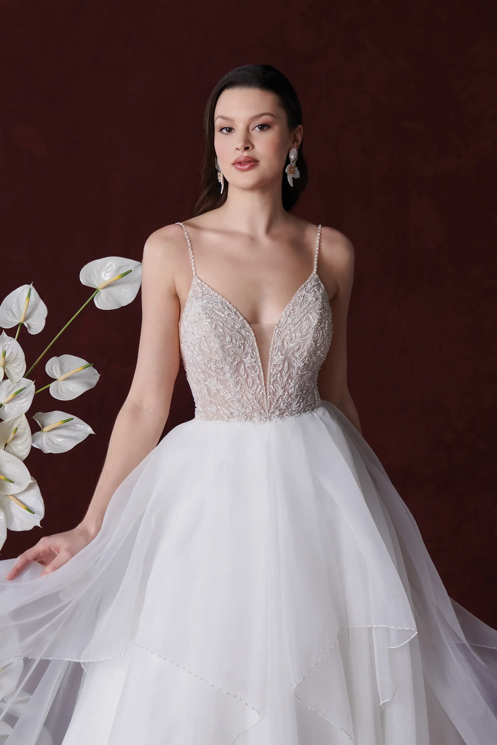 Vestido de novia confeccionado en tul y organza. El cuerpo presenta escote profundo en “V” con transparencia central y tirantes delgados. Está bordado con aplicaciones de pedrería y cuentas. La cintura se marca mediante una costura que une el cuerpo con la falda. La falda está formada por capas superpuestas de organza con cortes asimétricos y volumen progresivo hacia el ruedo, finalizando en una cola media. El cierre posterior es con cremallera invisible y el interior está forrado en tela lisa.