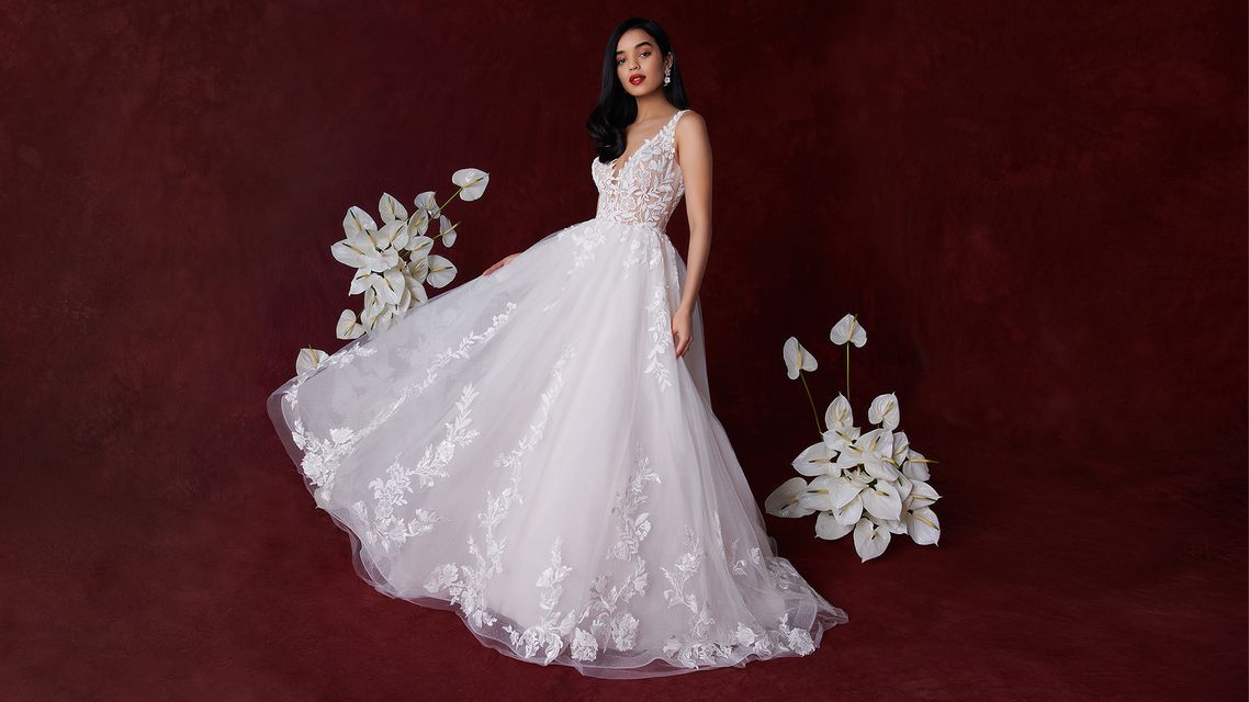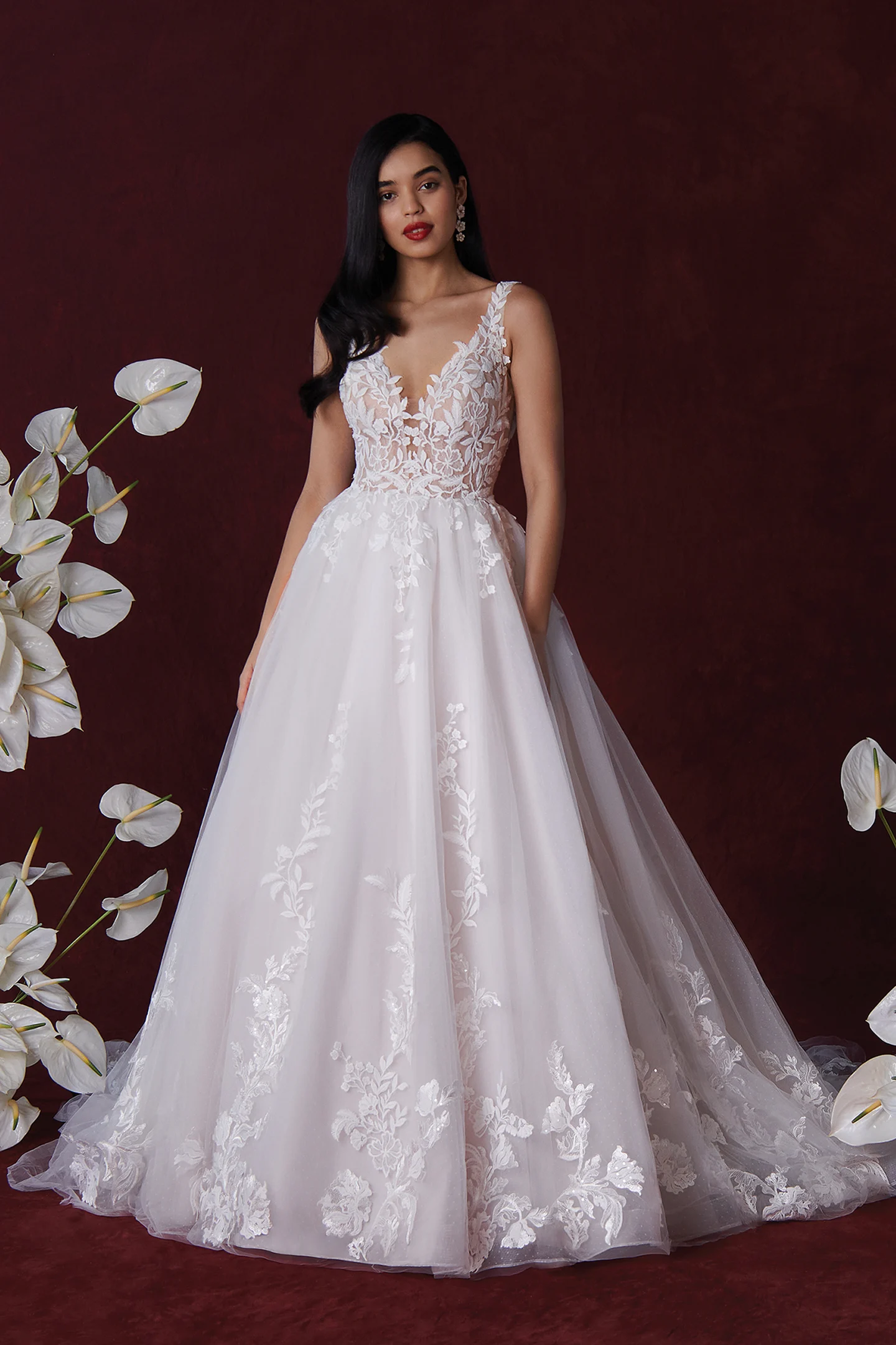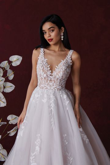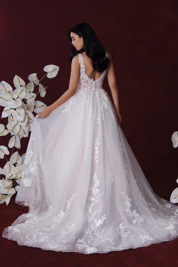 Vestido de novia con cuerpo estructurado y escote en “V” profundo. La parte superior está confeccionada en tul bordado con aplicaciones de encaje en forma de motivos florales y transparencia en el escote y la espalda. La falda tiene base de tul con bordados aplicados en relieve distribuidos desde la cintura hacia el bajo. El corte de la falda es amplio con volumen y prolongación posterior en forma de cola.