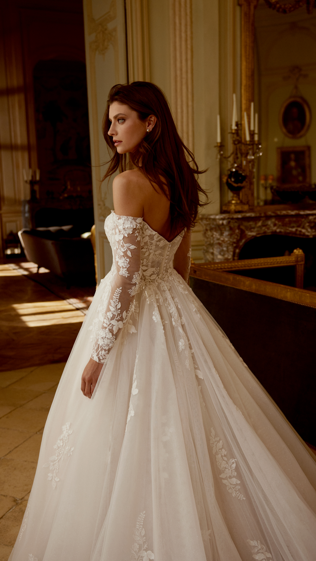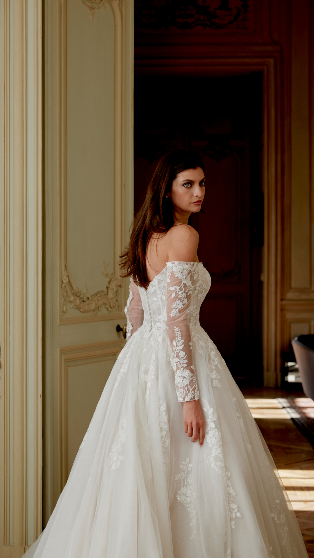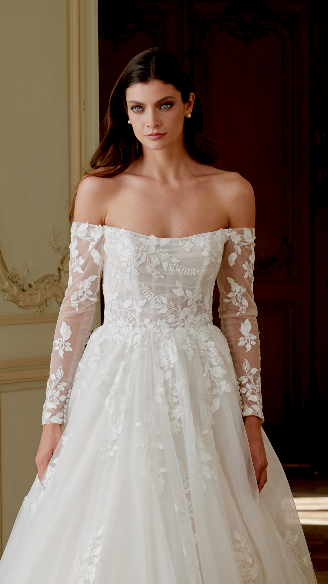 Vestido de novia con escote tipo off shoulder y mangas largas en tul bordado. El cuerpo está estructurado con corsetería visible y aplicaciones florales distribuidas de forma uniforme. La cintura se marca mediante la unión con una falda amplia confeccionada en capas de tul con bordado floral disperso.