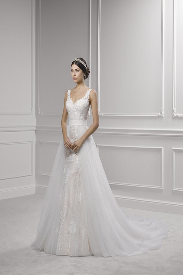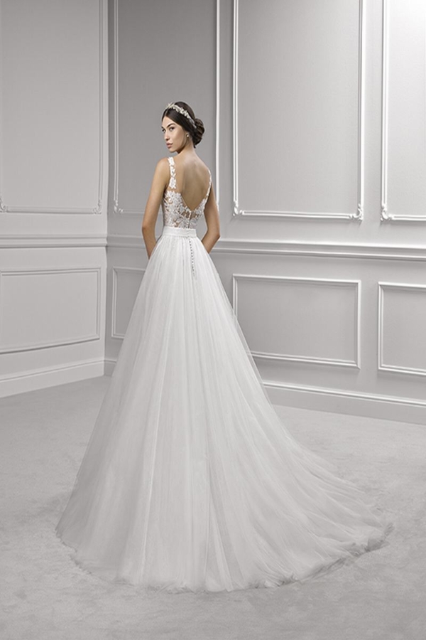 VESTIDO ESCOTE EN V EN ENCAJES Y ESPALDA CON CORTE EFECTO ILUSION, ELABORADO EN ENCAJES DE BRILLO SOBRE UN FONDO ALMENDRADO Y SOBREFALDA EN TULL CORTE PRINCESA