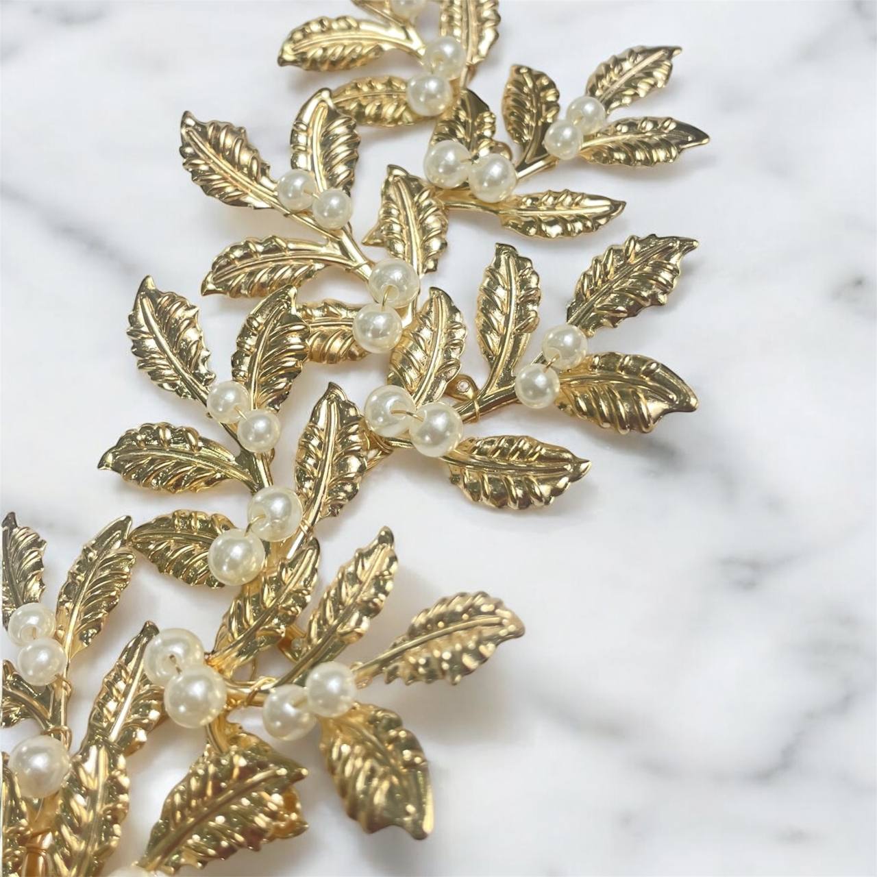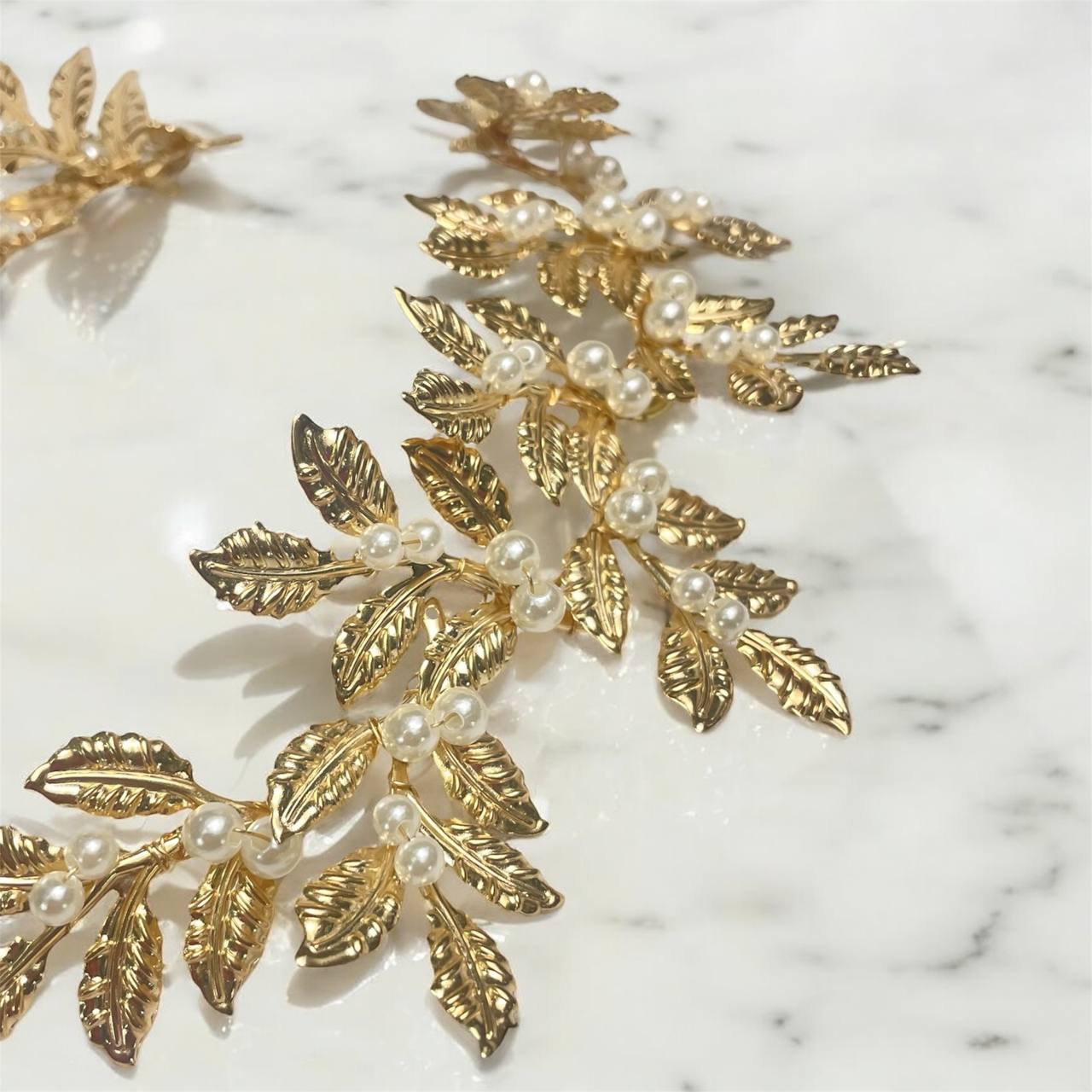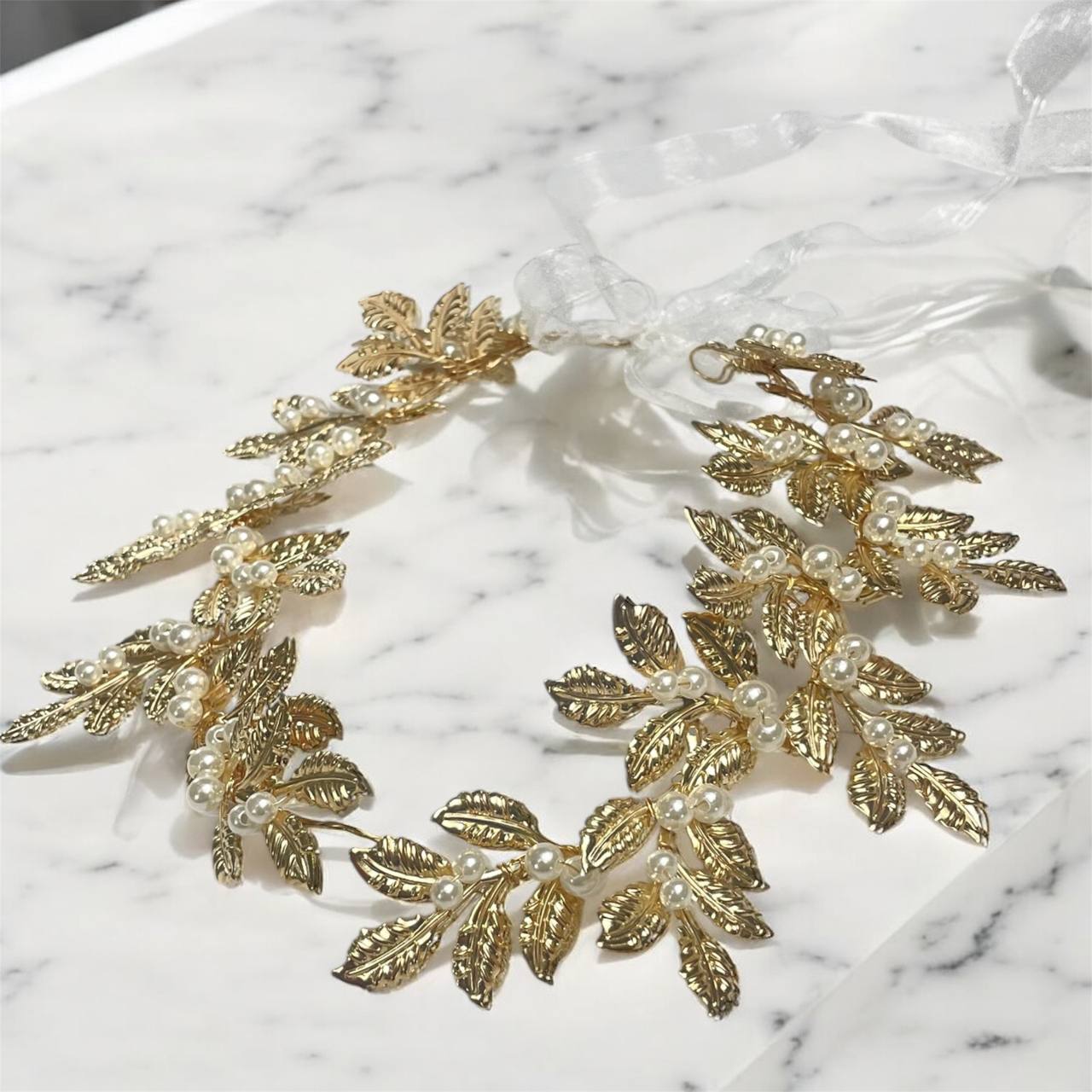 tocado dorado diseñado con finas hojas metálicas en relieve, creando un efecto elegante y natural. Cada hoja está adornada con perlas blancas brillantes, aportando un toque sofisticado y romántico. Su estructura flexible permite adaptarlo cómodamente al peinado, mientras que su cinta de organza transparente asegura un ajuste perfecto y discreto.