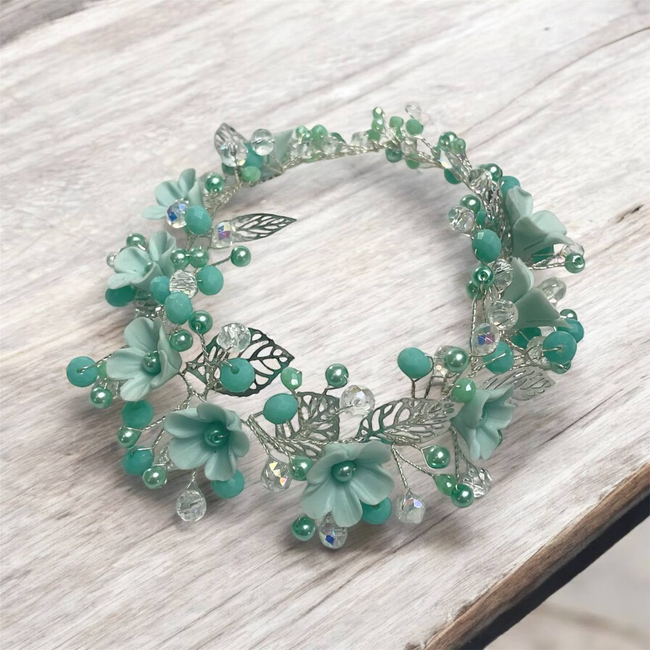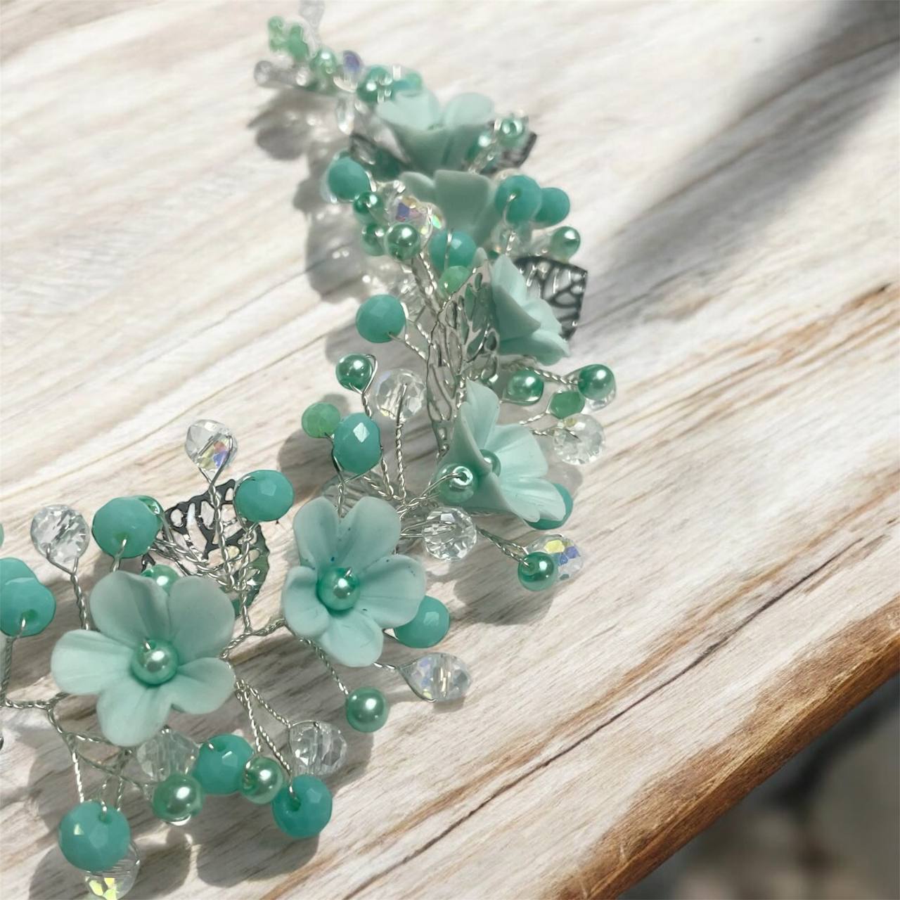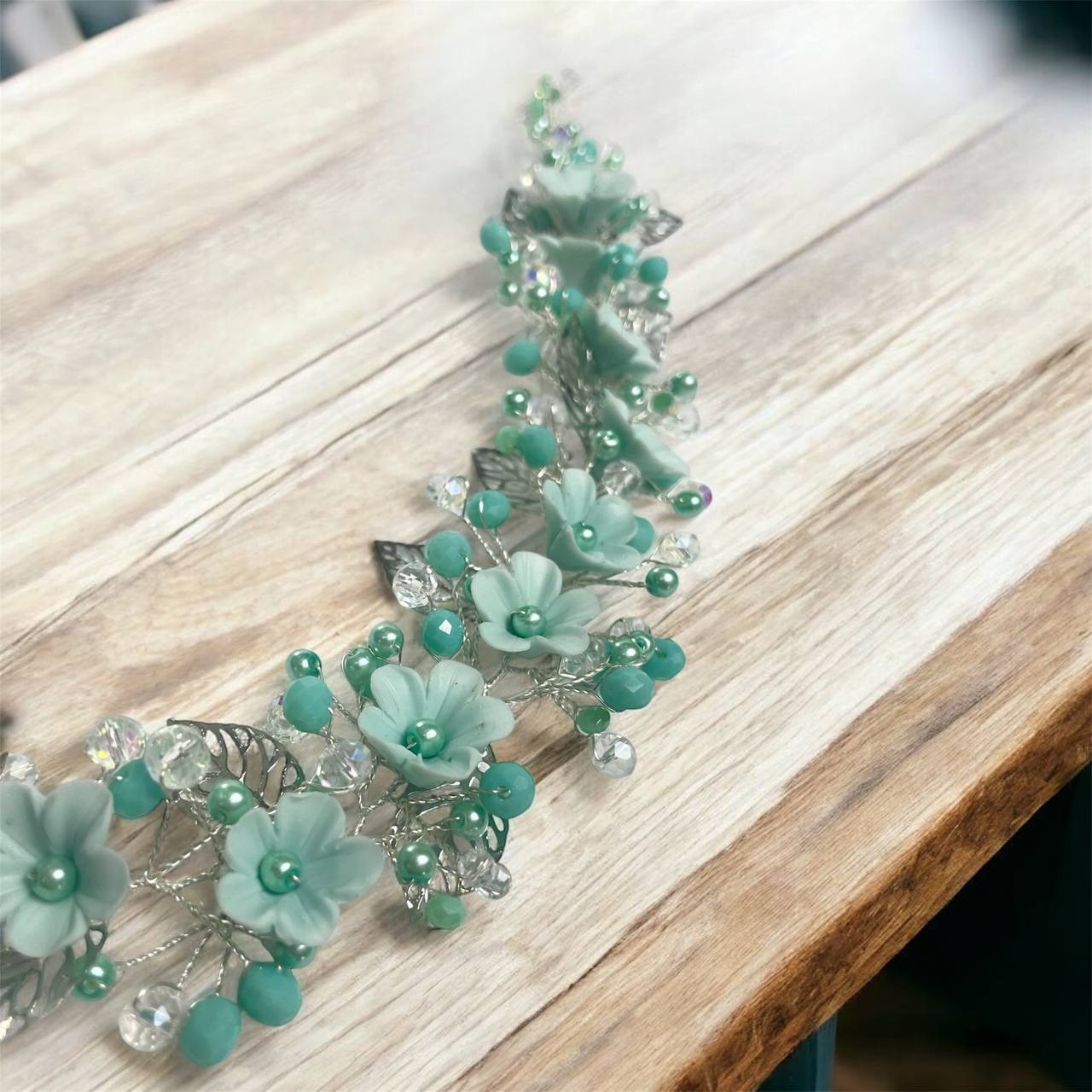 Tocado artesanal en tonos verde agua, adornado con delicadas flores, perlas y cristales brillantes. Su estructura flexible permite adaptarlo con facilidad a distintos peinados, aportando un toque fresco y romántico.