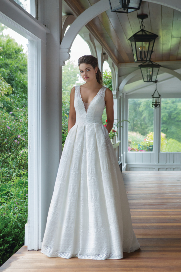 VESTIDO DE NOVIA ESCOTE V MANGA SISA FALDA EN TABLAS ELABORADO EN ENCAJE DE HILO