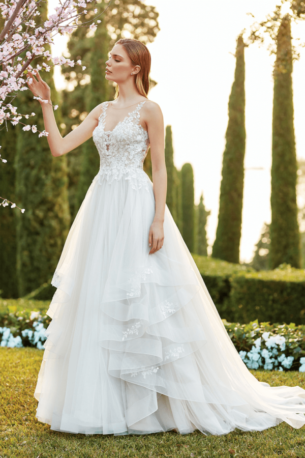 VESTIDO DE NOVIA ESCOTE ILUSION DELANTERO FALDA EN CAPAS CON ARANDELAS