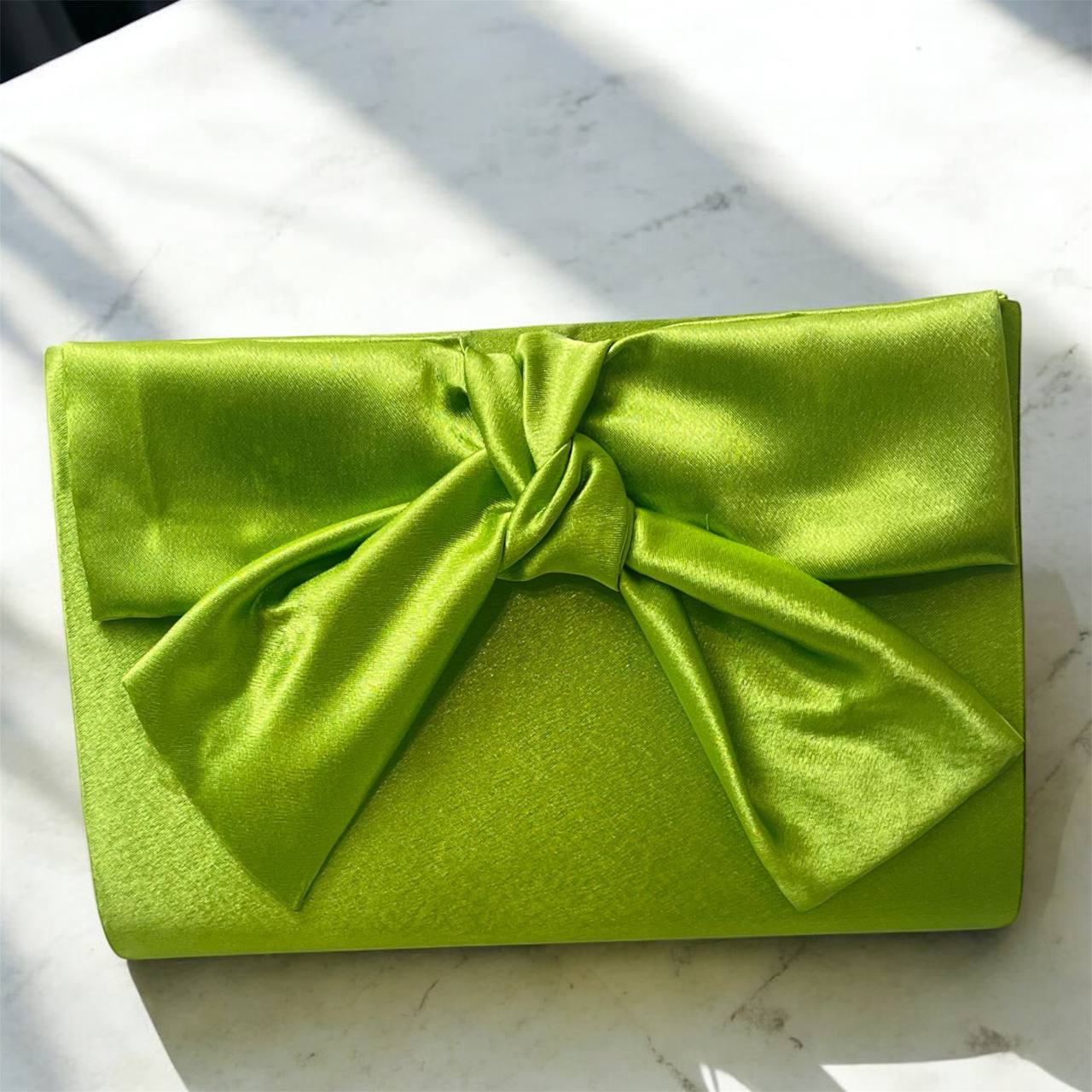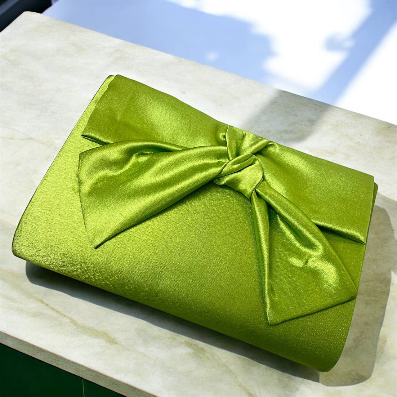 Bolso de mano en un vibrante tono verde lima, confeccionado en satén con un lazo elegante al frente.
