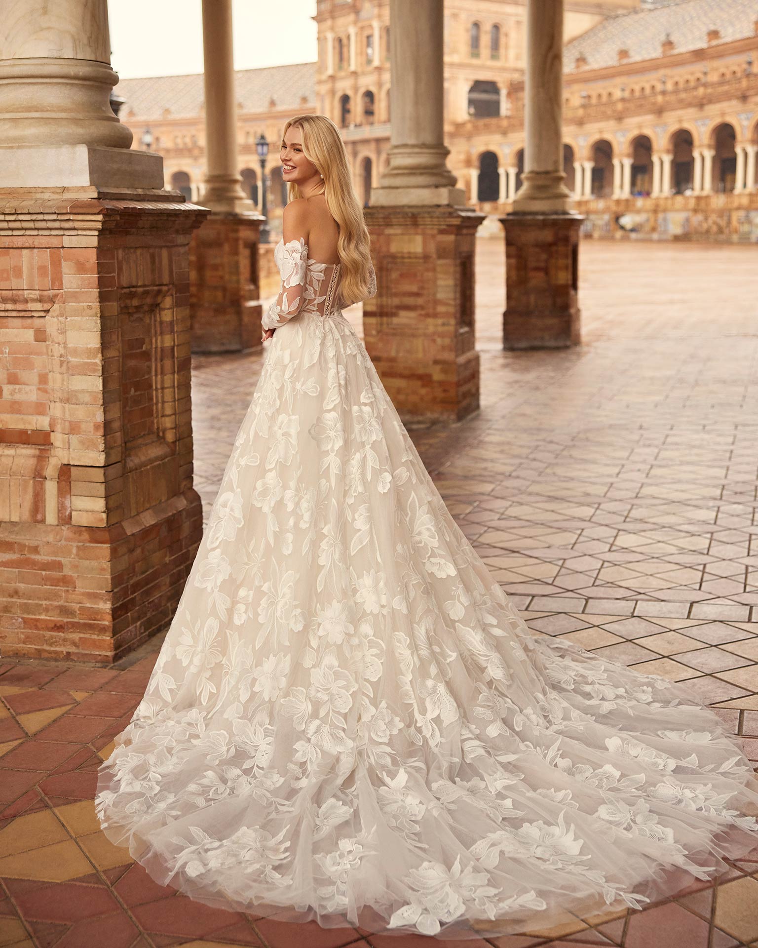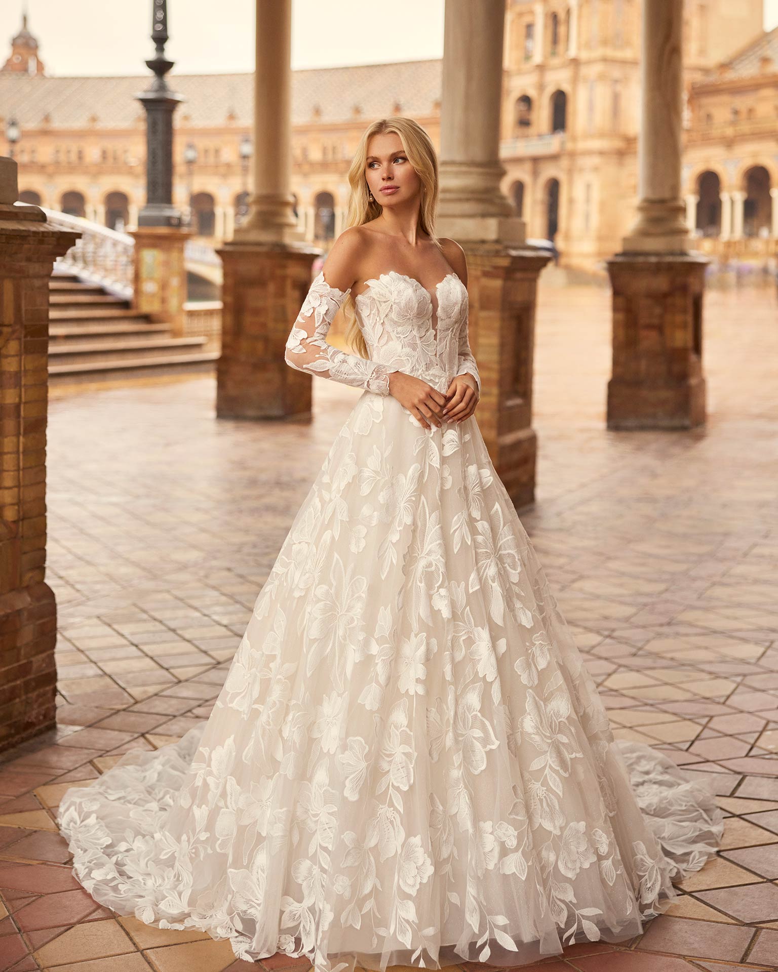 Vestido de novia Aire de Rosa Clara, silueta princesa con corsé estructurado y escote corazón. El diseño presenta mangas largas desmontables en tul con apliques florales bordados. La falda amplia está confeccionada en tul con bordados de gran formato que cubren toda la superficie y finaliza en una cola extendida.
