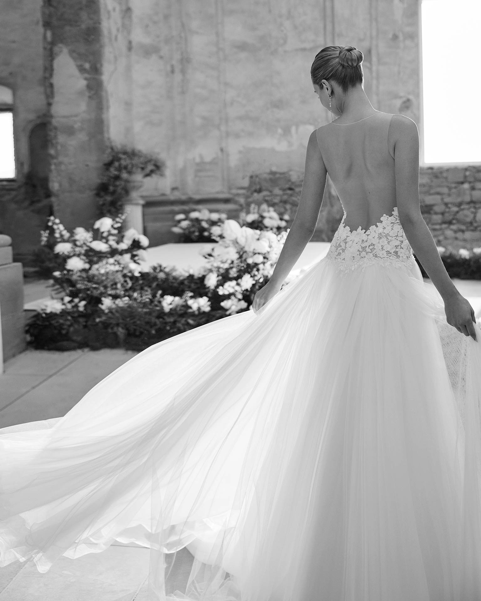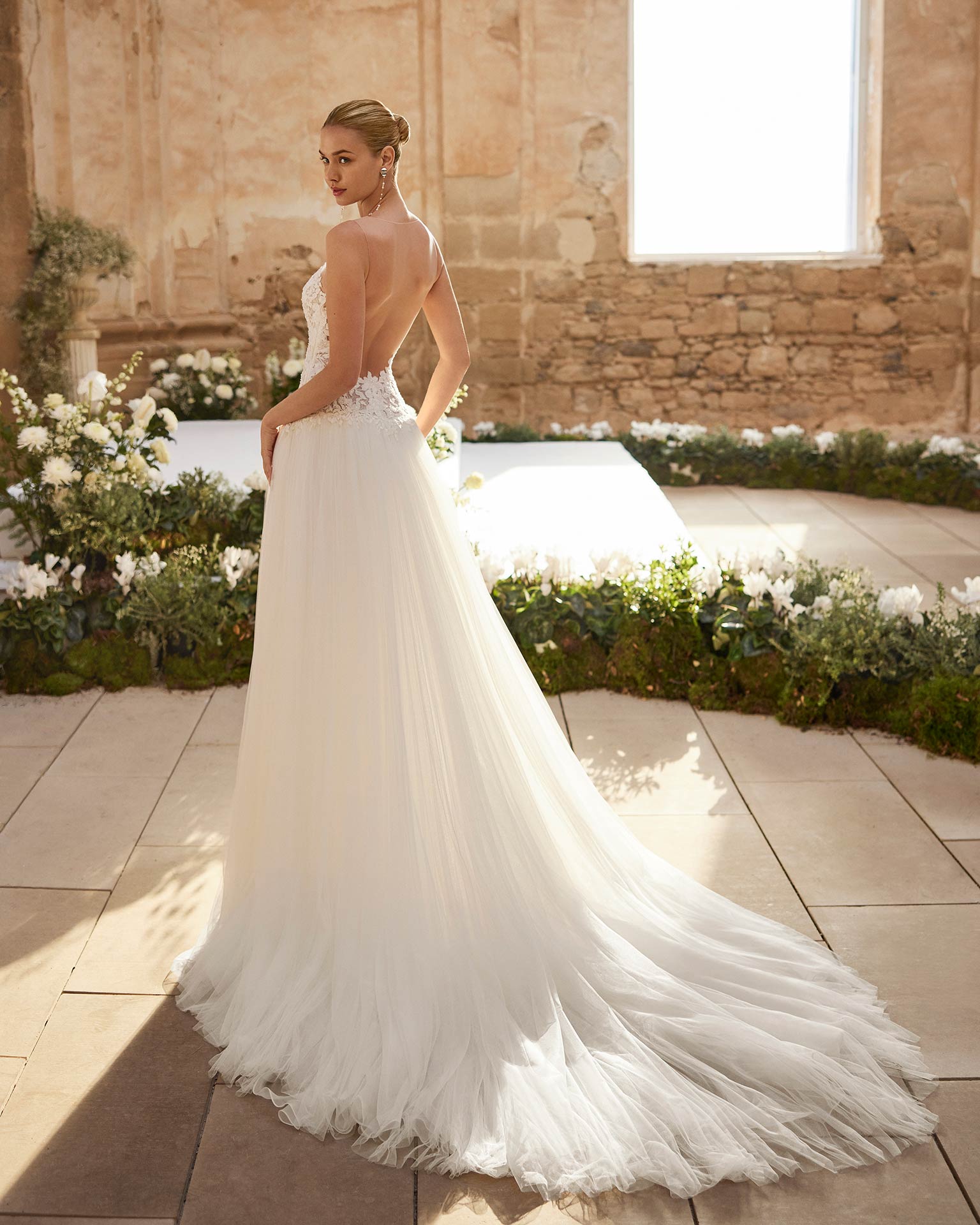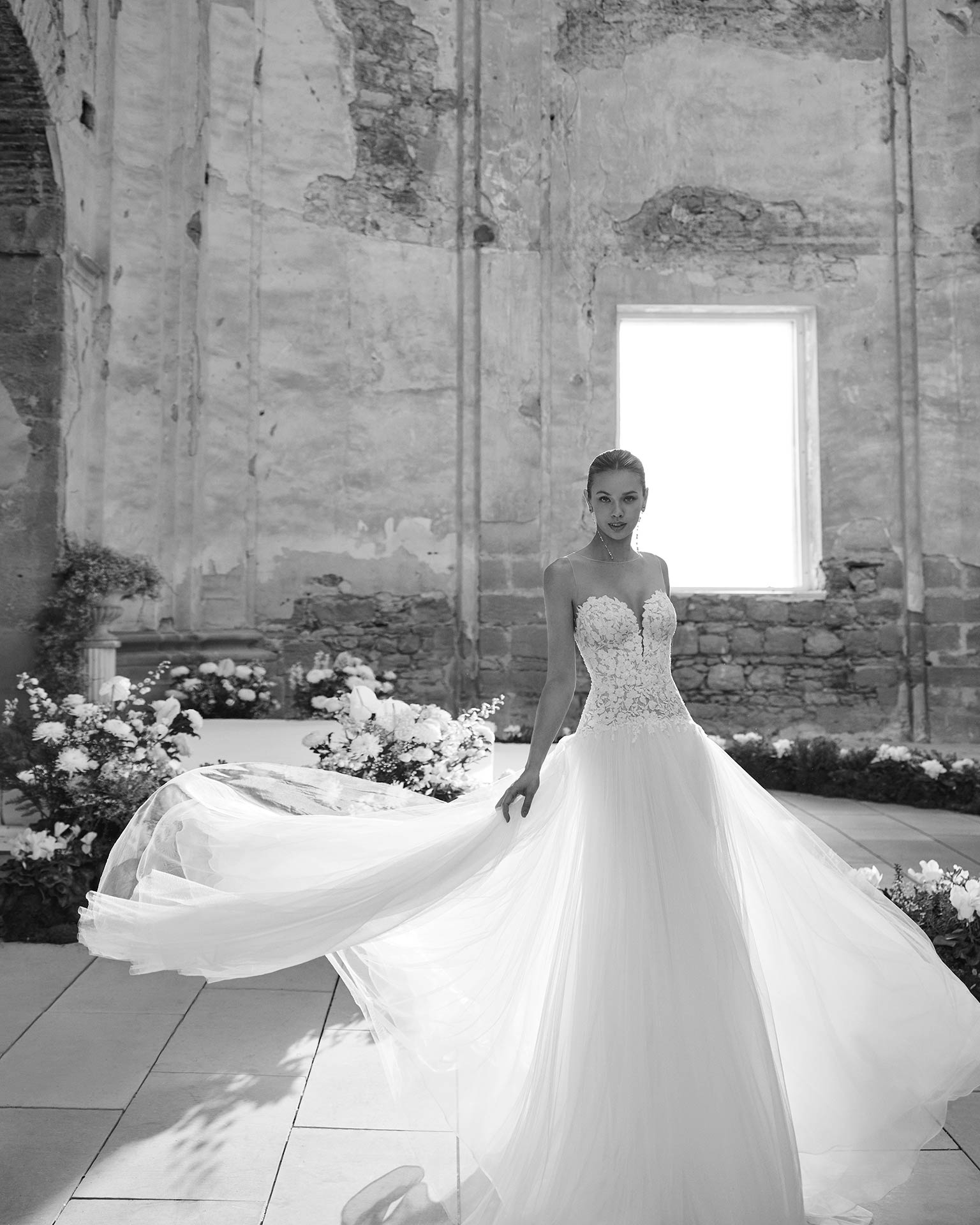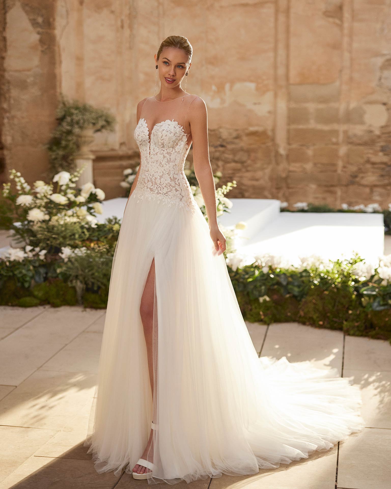 | Vestido de novia Aire de Rosa Clara, silueta línea A con corsé estructurado y escote corazón cubierto con tul ilusión. El cuerpo está elaborado en encaje con apliques florales bordados que se extienden hacia la cintura. La falda está confeccionada en capas de tul con abertura lateral y se prolonga en una cola media. |