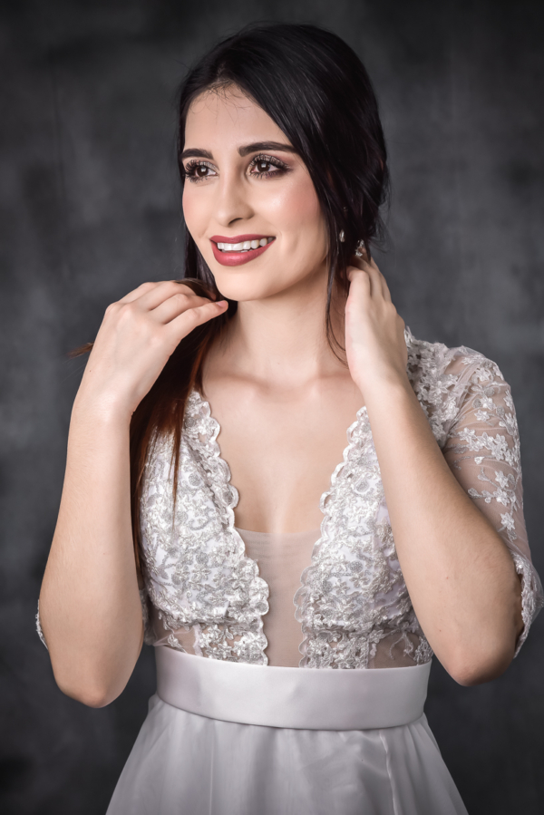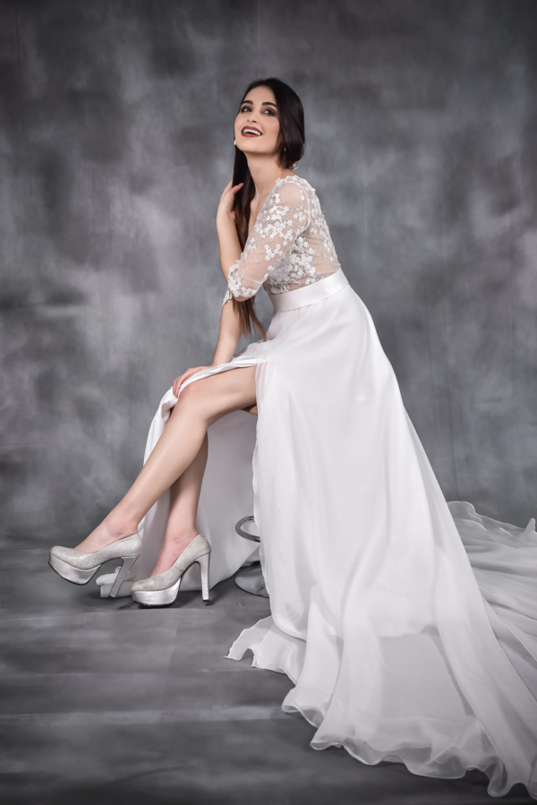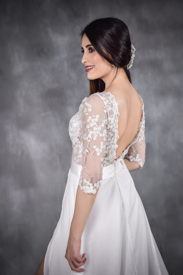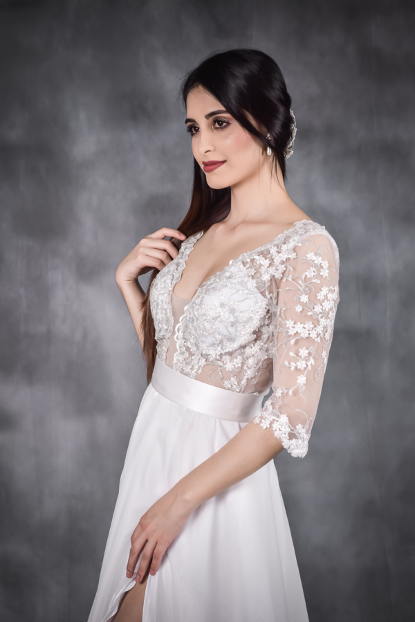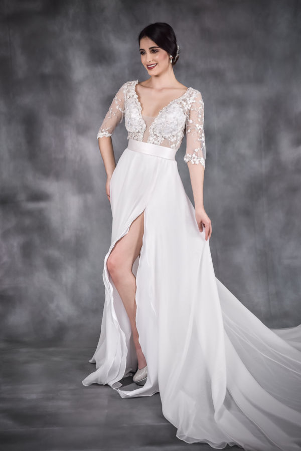 VESTIDO ESCOTE EN V PROFUNDO CON TRANSPARENCIA Y MANGAS EN ENCAJE 3/4 FAJON SATINADO ENMARCANDO CINTURA , FALDA EN VELO CHIFON CON ABERTURA