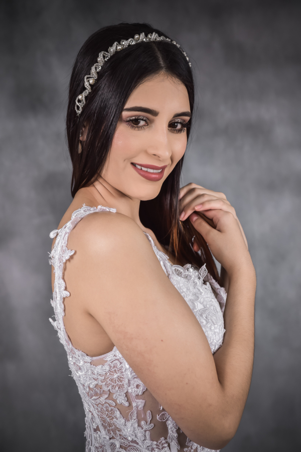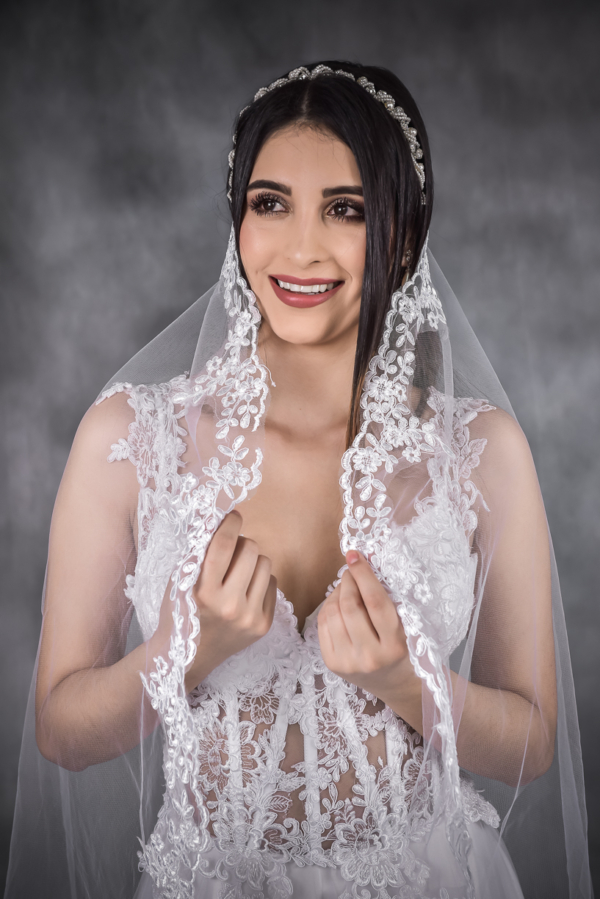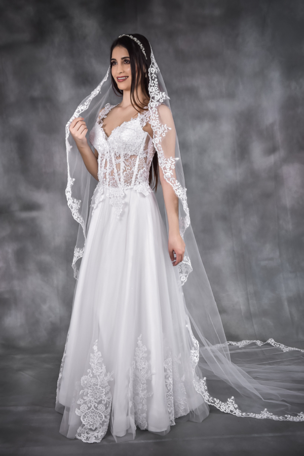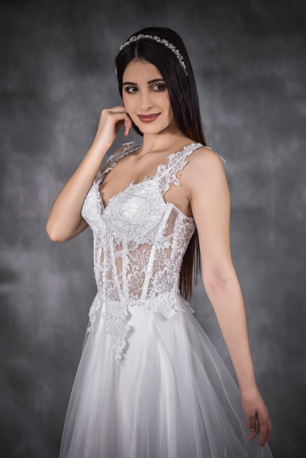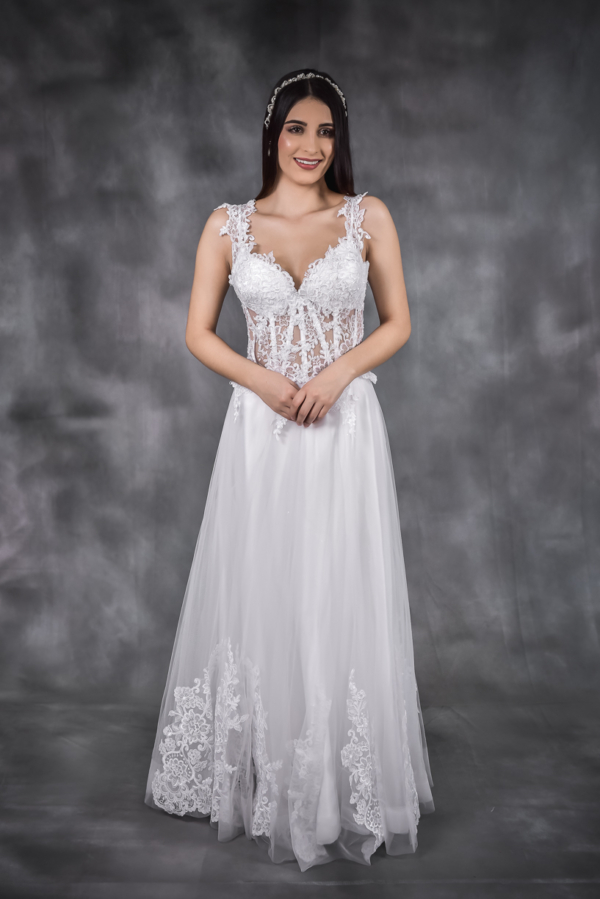 VESTIDO ESCOTE CORAZON ADORNADO CON TIRA EN ENCAJE CORPIÑO CON VARILLAS EXPUESTAS MANEJANDO TRANSPARENCIA Y APLICACIONES SOBREPUESTAS FALDA CON APLITUD EN TULL Y APLICACIONES EN CENEFA.