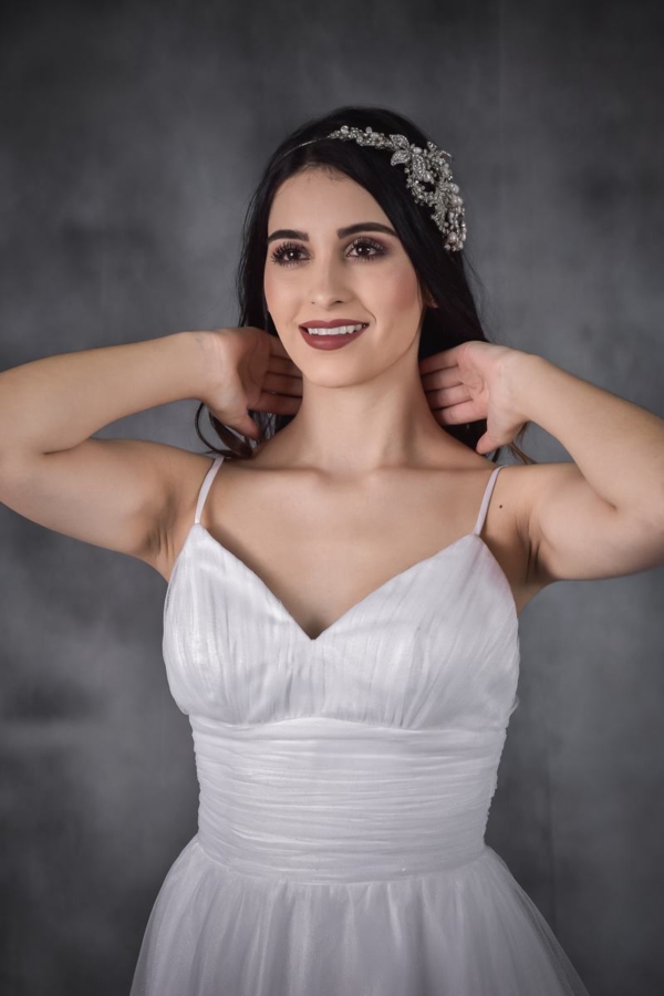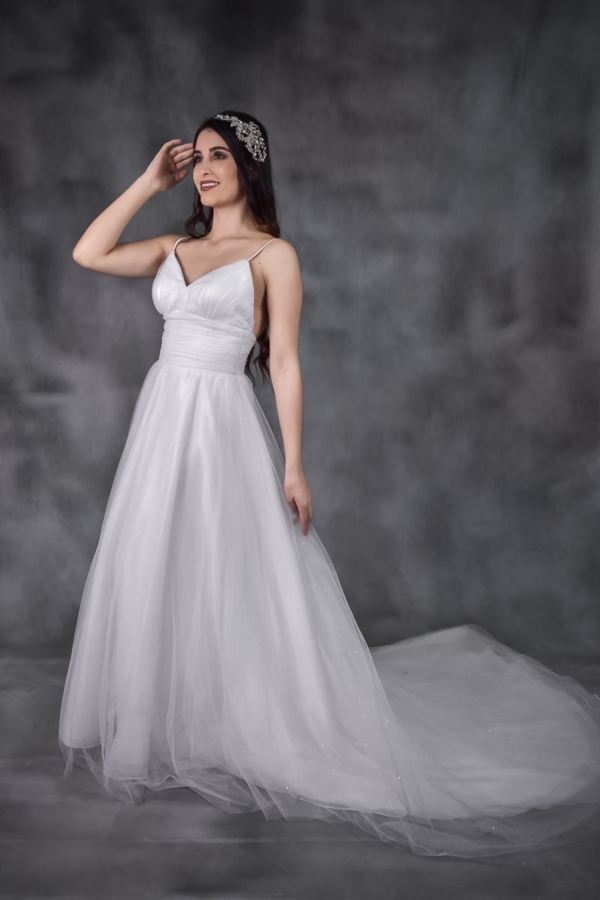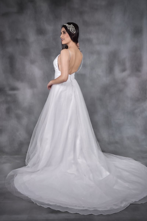 VESTIDO ESCOTE EN V CON TIRAS SPAGUETTI DRAPEADO EN BUSTO HASTA CINTURA FALDA EN TULL CON CAIDA