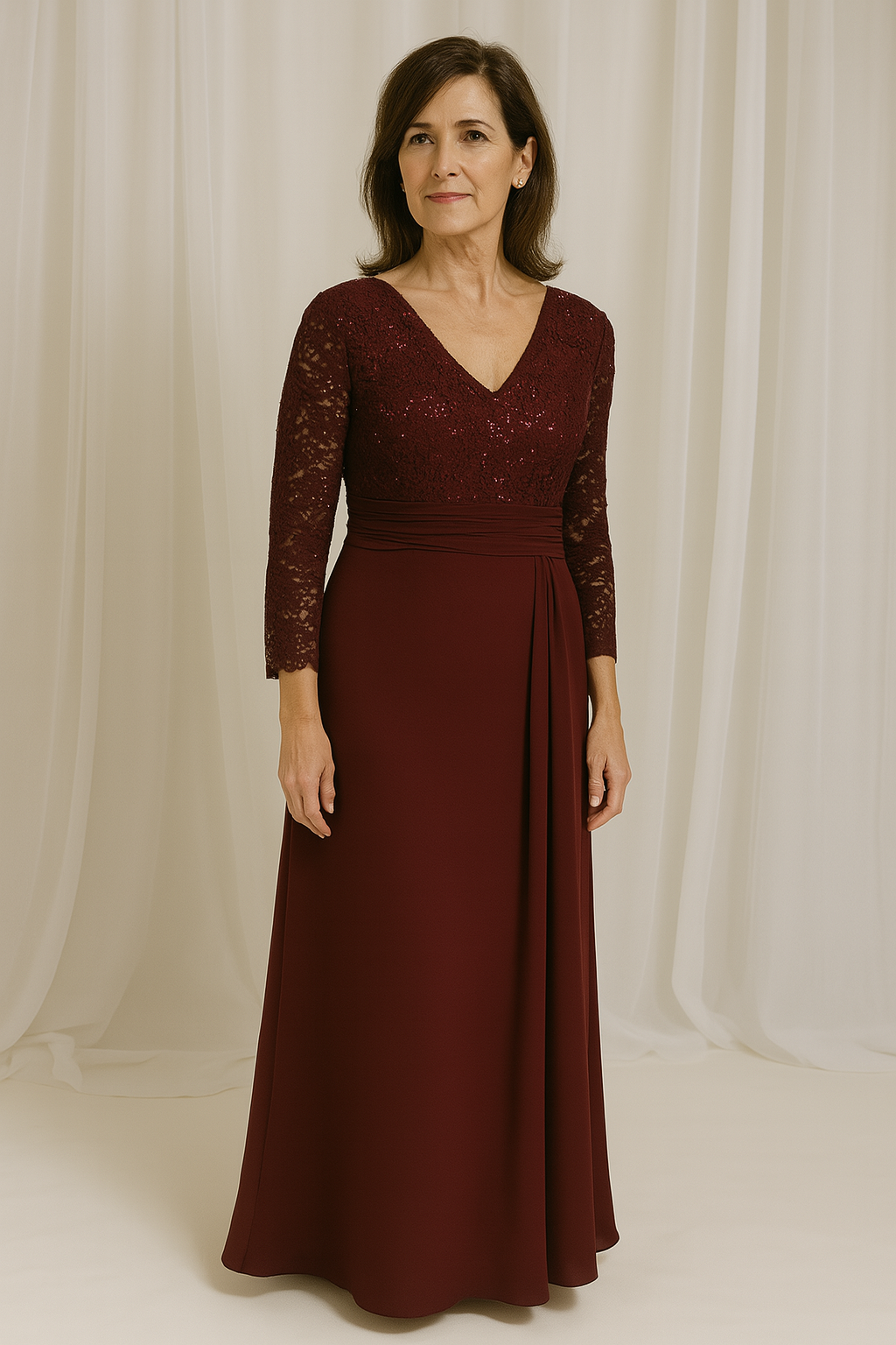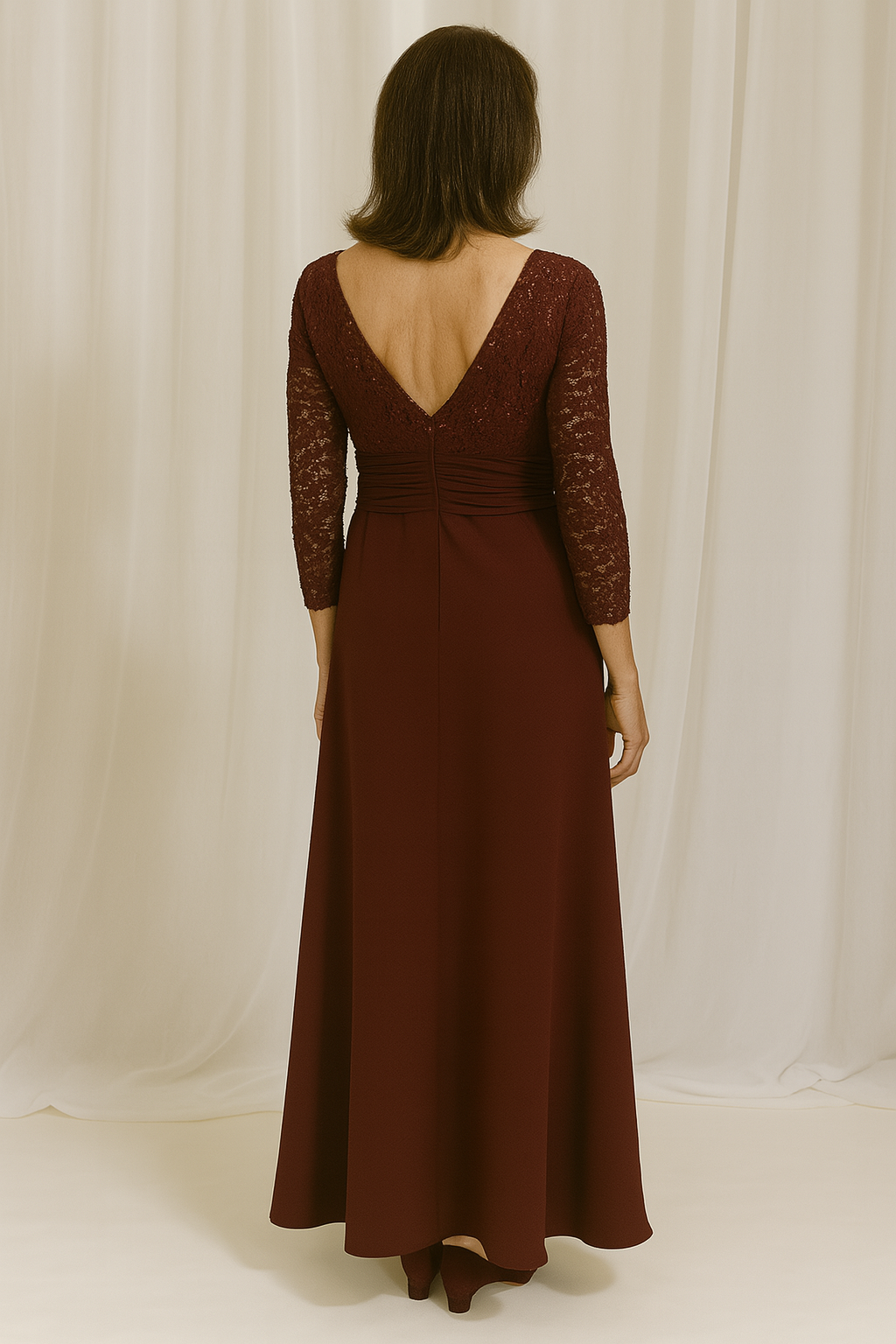 | Vestido largo con escote en V y mangas tres cuartos. El cuerpo superior presenta una superficie de encaje con aplicaciones brillantes. La cintura está marcada por un diseño drapeado que se extiende hacia un costado con caída libre en forma de pliegue. La falda tiene silueta amplia y caída recta desde la cadera hasta el bajo. |