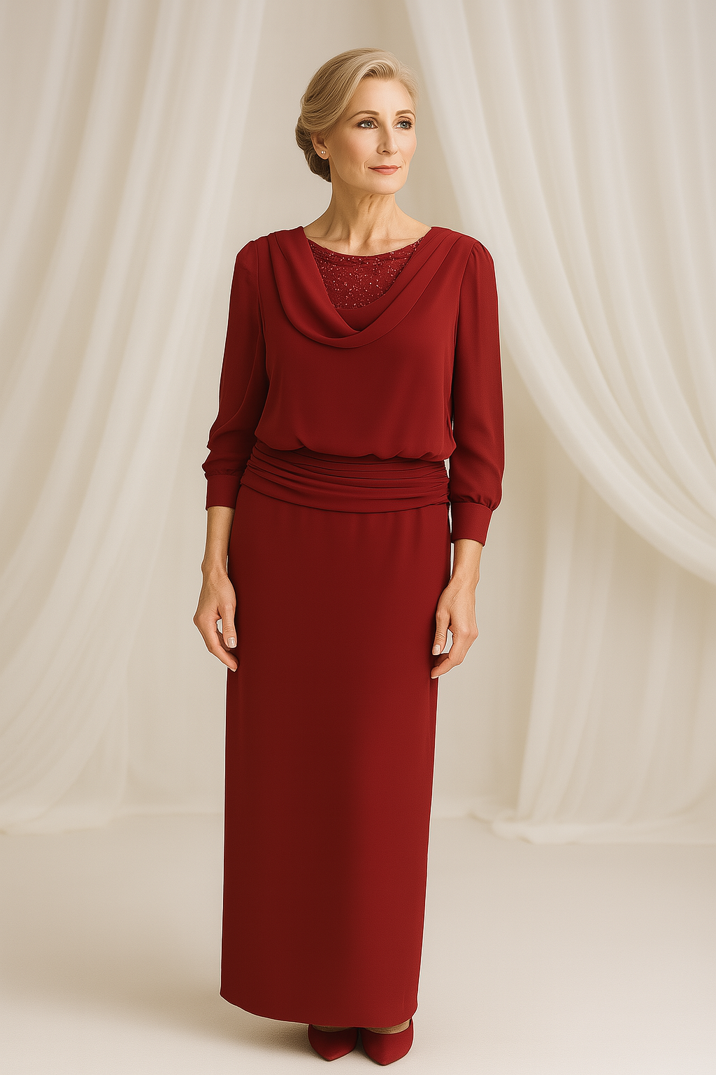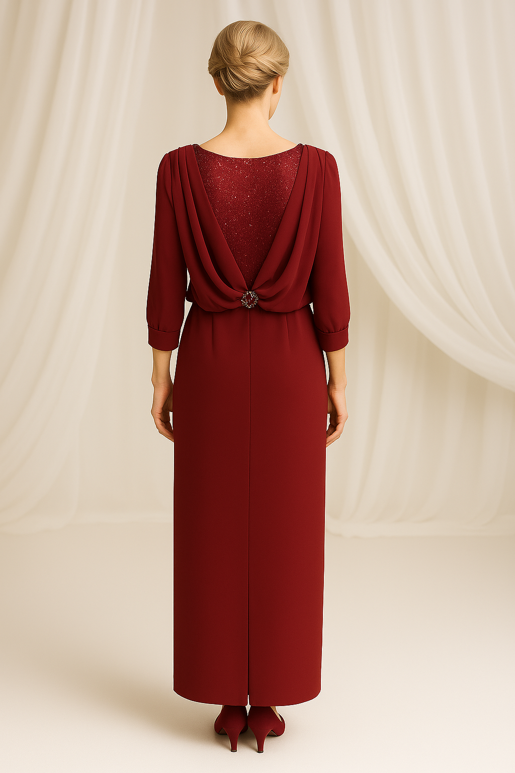 | Vestido largo de falda recta con escote drapeado y cuello interior redondo con aplicación de tela con brillos. Presenta mangas largas con puño angosto y blusa de caída suelta sobre la cintura. La cintura está definida con una pretina ancha drapeada. El cierre se ubica en la parte posterior. |