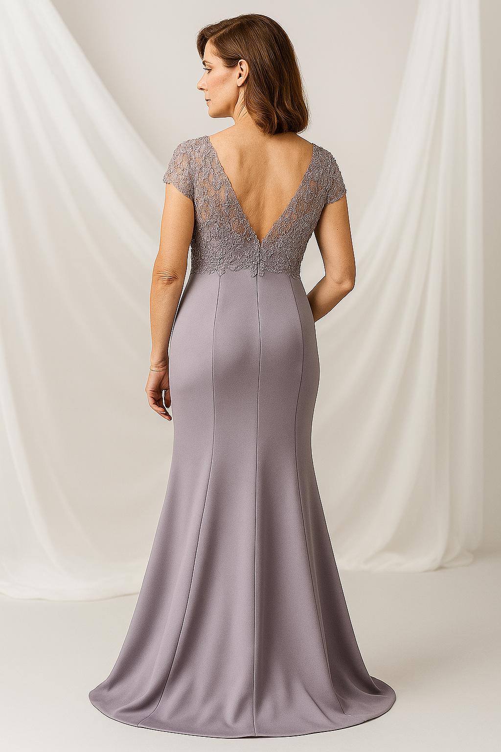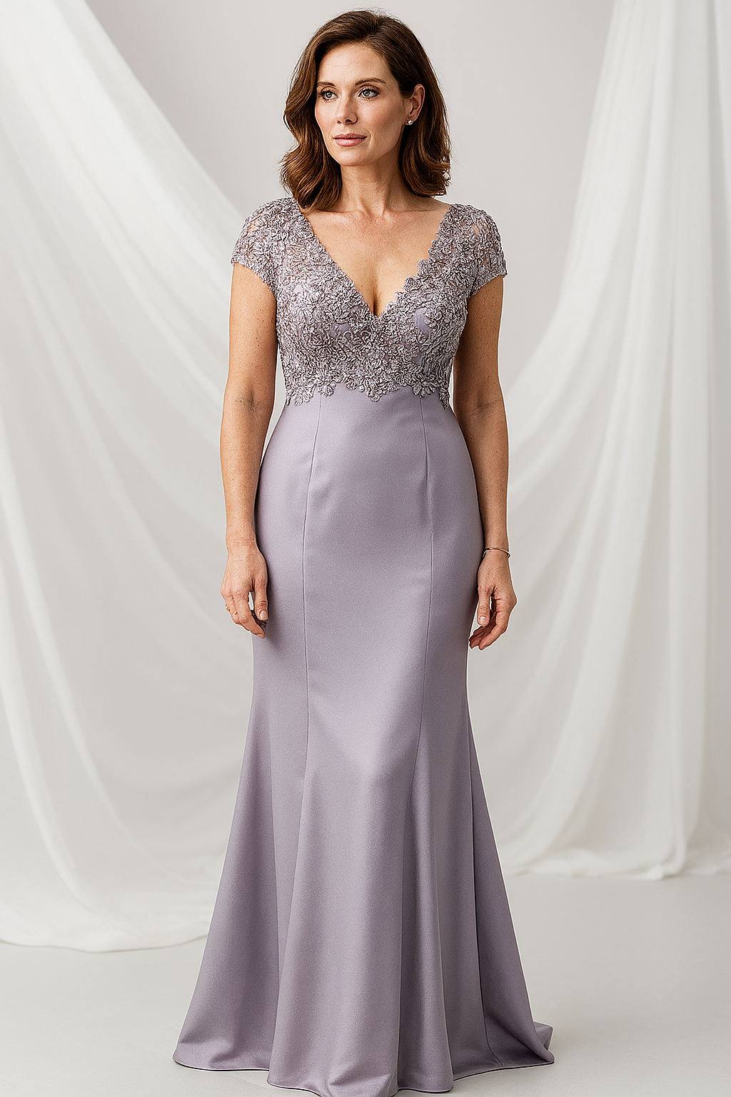 | Vestido largo de una sola pieza con escote en V y cuerpo superior elaborado en encaje bordado con pedrería. El diseño incluye mangas cortas tipo casquillo formadas por el mismo encaje. La línea de la cintura está ligeramente definida por la terminación del bordado, que se extiende en forma irregular hacia la parte inferior. La falda está confeccionada en tejido plano con caída y silueta tipo sirena, con ajuste en cadera y ensanche progresivo hacia el ruedo. |