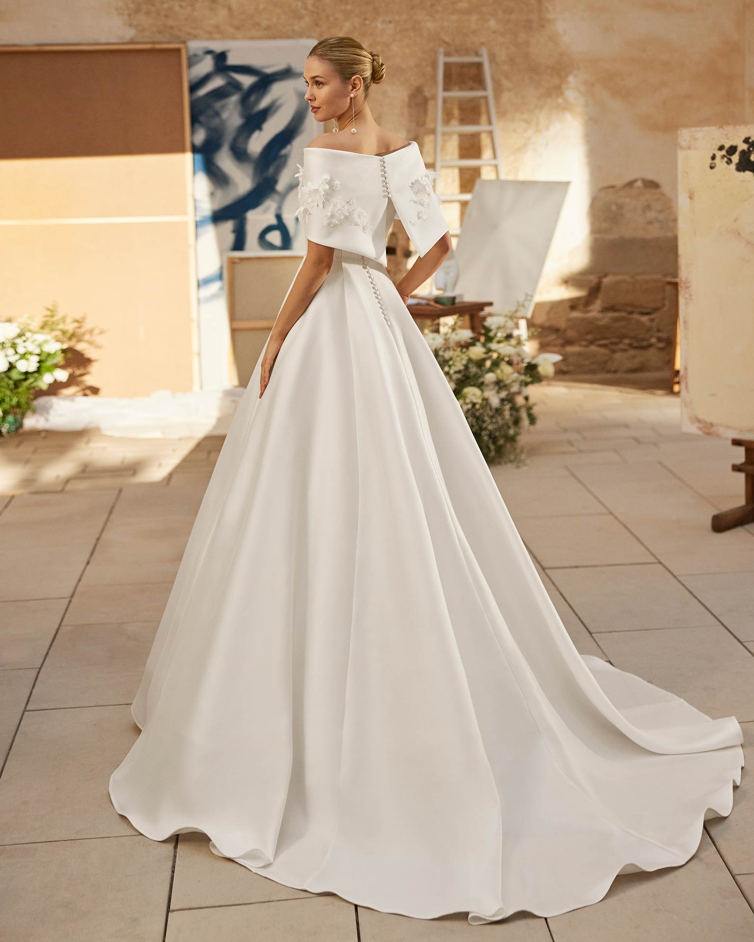 El diseño se complementa con una capa envolvente desmontable de escote bardot, elaborada en el mismo tejido y decorada con aplicaciones florales en relieve sobre los hombros.