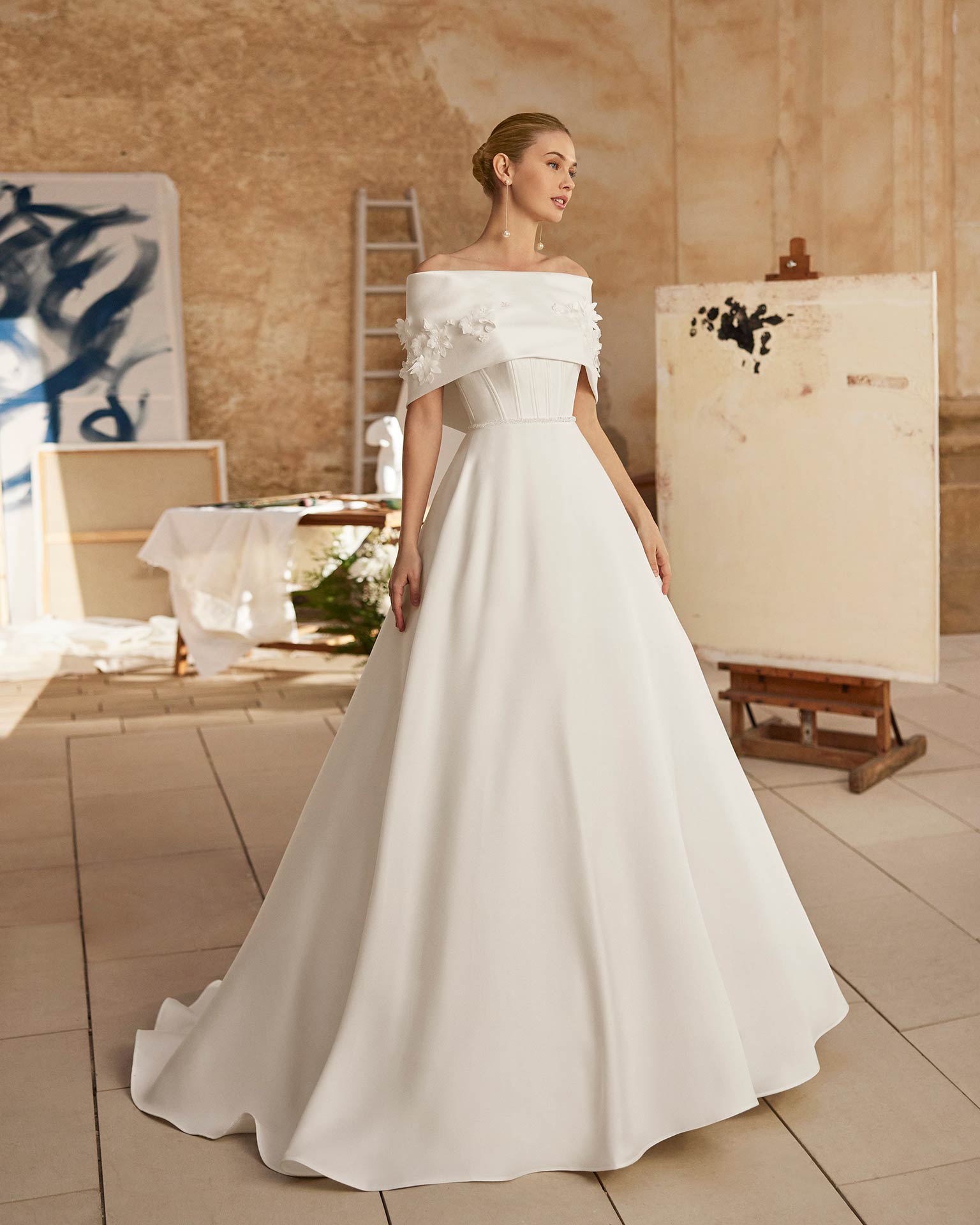 Vestido de novia Aire de Rosa Clara, silueta línea A con corsé estructurado de escote recto y varillas visibles. Está confeccionado en tejido liso con falda amplia y cola prolongada.