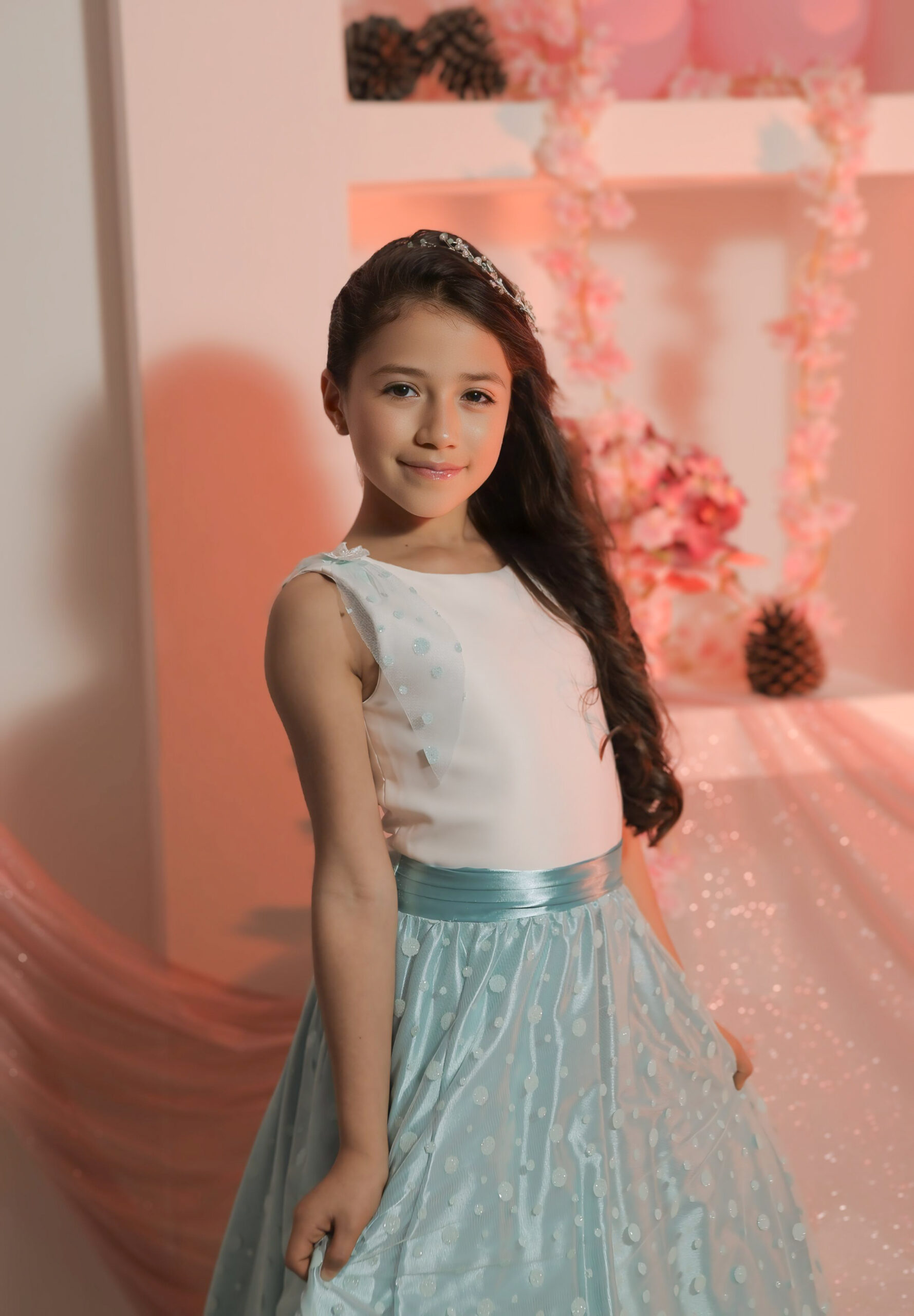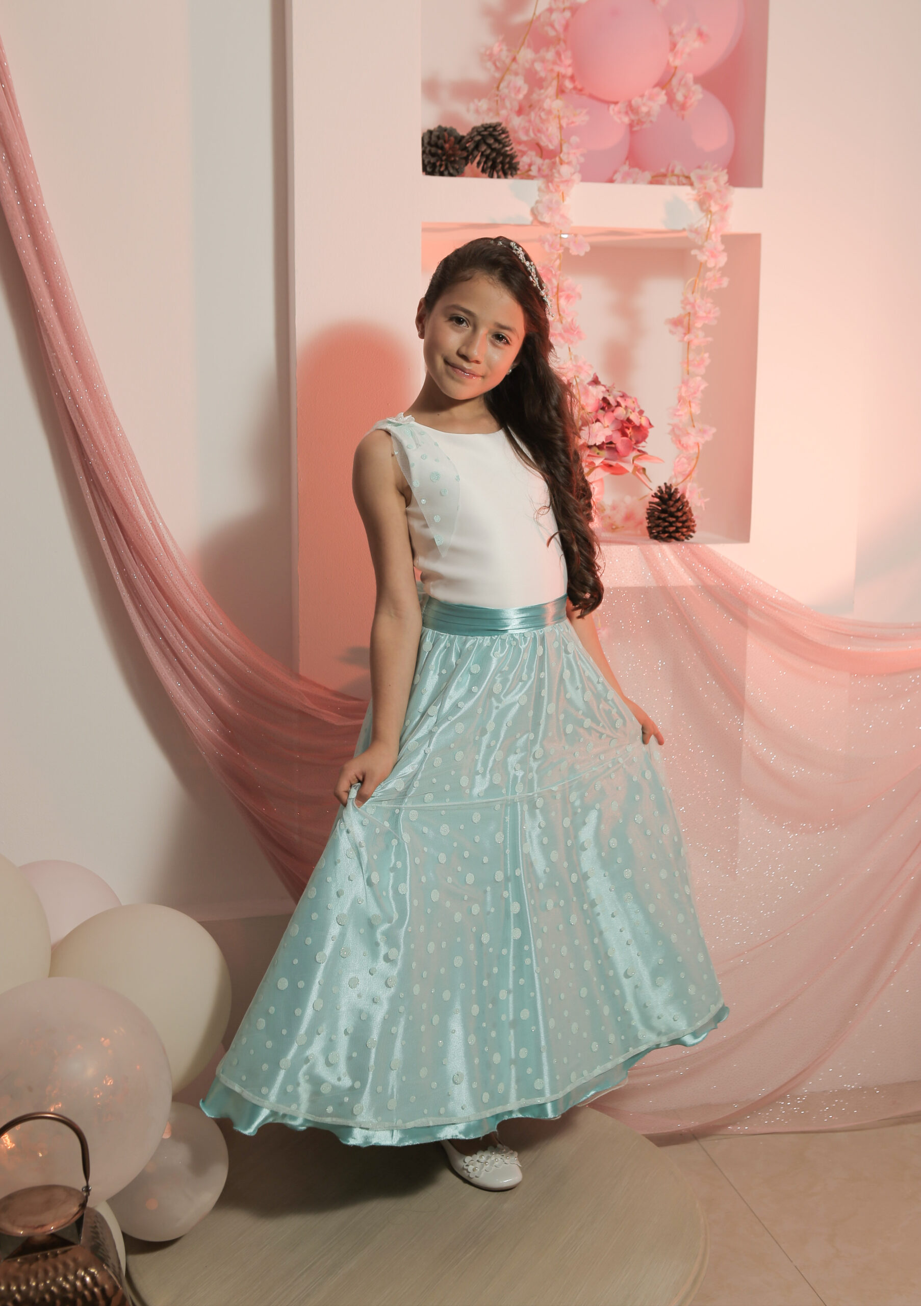 Vestido corte A. Parte superior sin mangas, con aplicación de tul en los hombros. Falda larga de corte circular con capa superior en tul con puntos en relieve y cinturilla ancha.