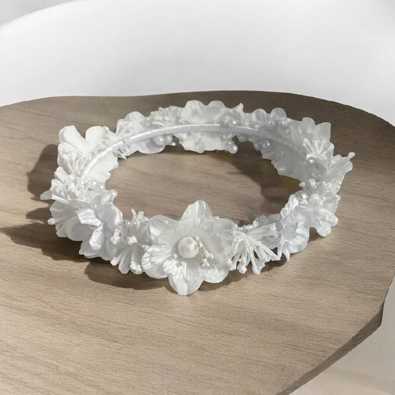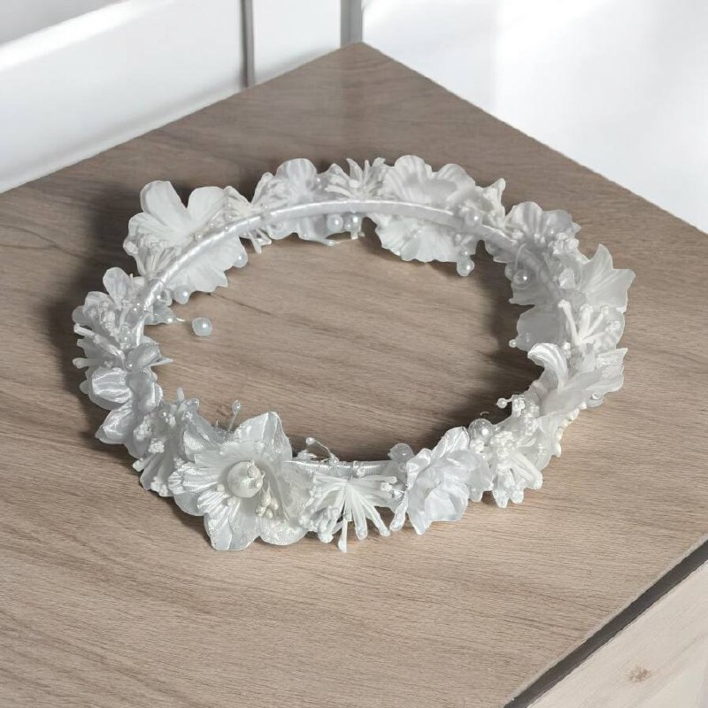 Corona floral en tonos blancos, elaborada con flores de tela en diferentes texturas y tamaños, intercaladas con pequeñas perlas que aportan un brillo sutil.