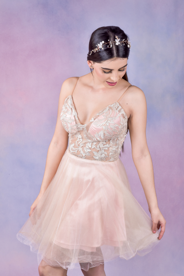 VESTIDO ESCOTE EN V TIRAS SPAGUETTI CORPIÑO EN TRANSPARENCIA EN ENCAJE, FALDA NUDE CORTA EN TULL