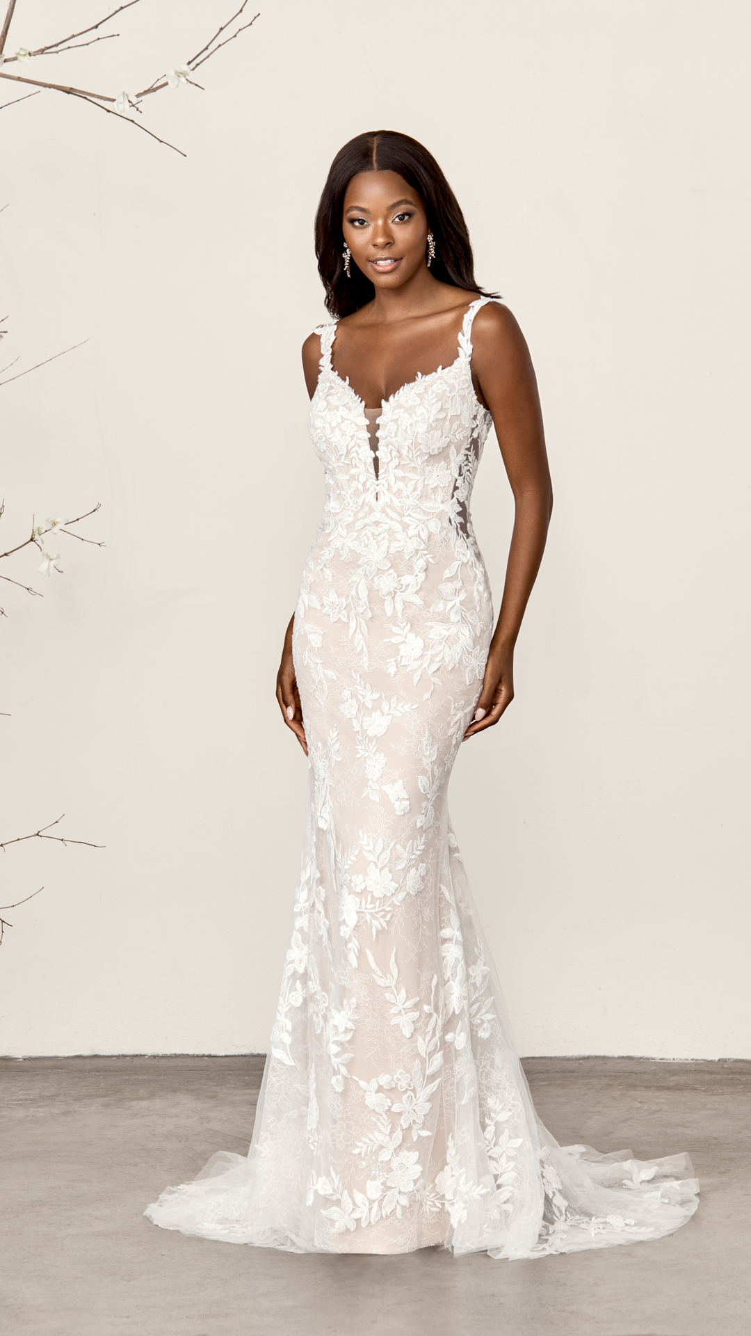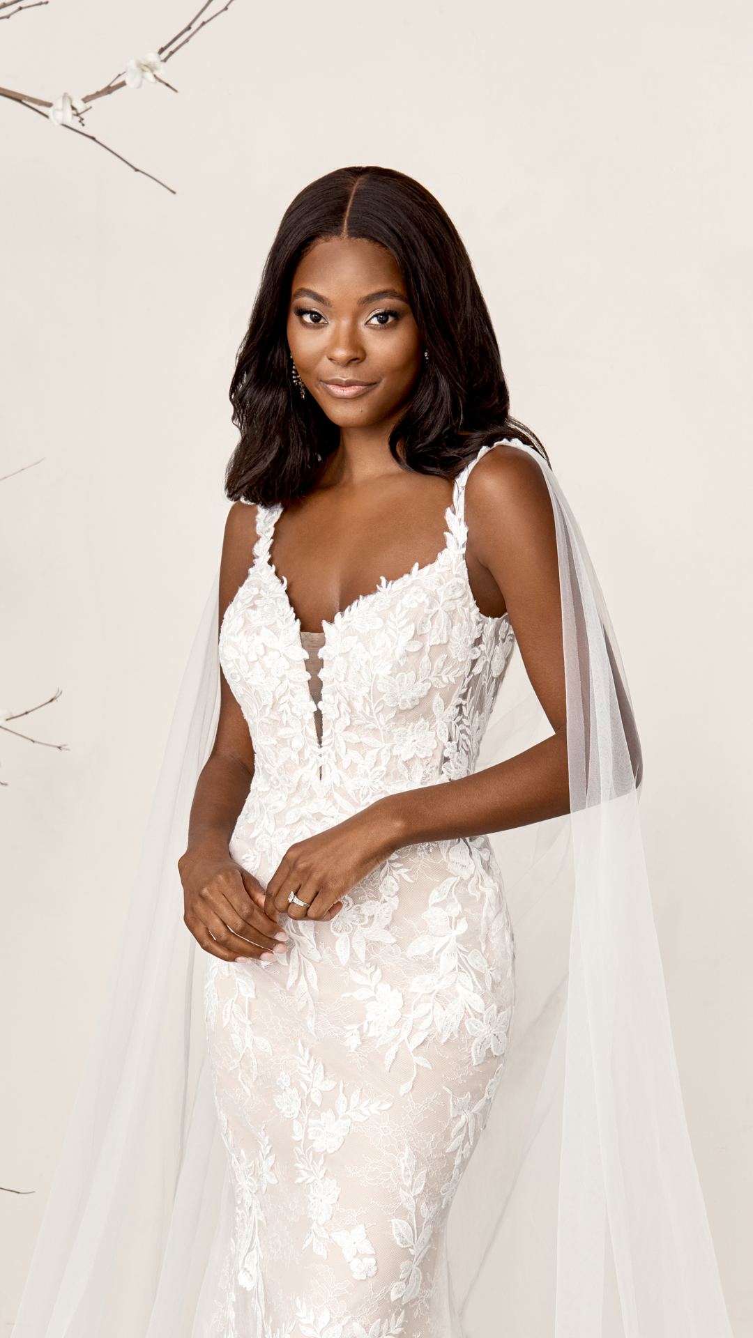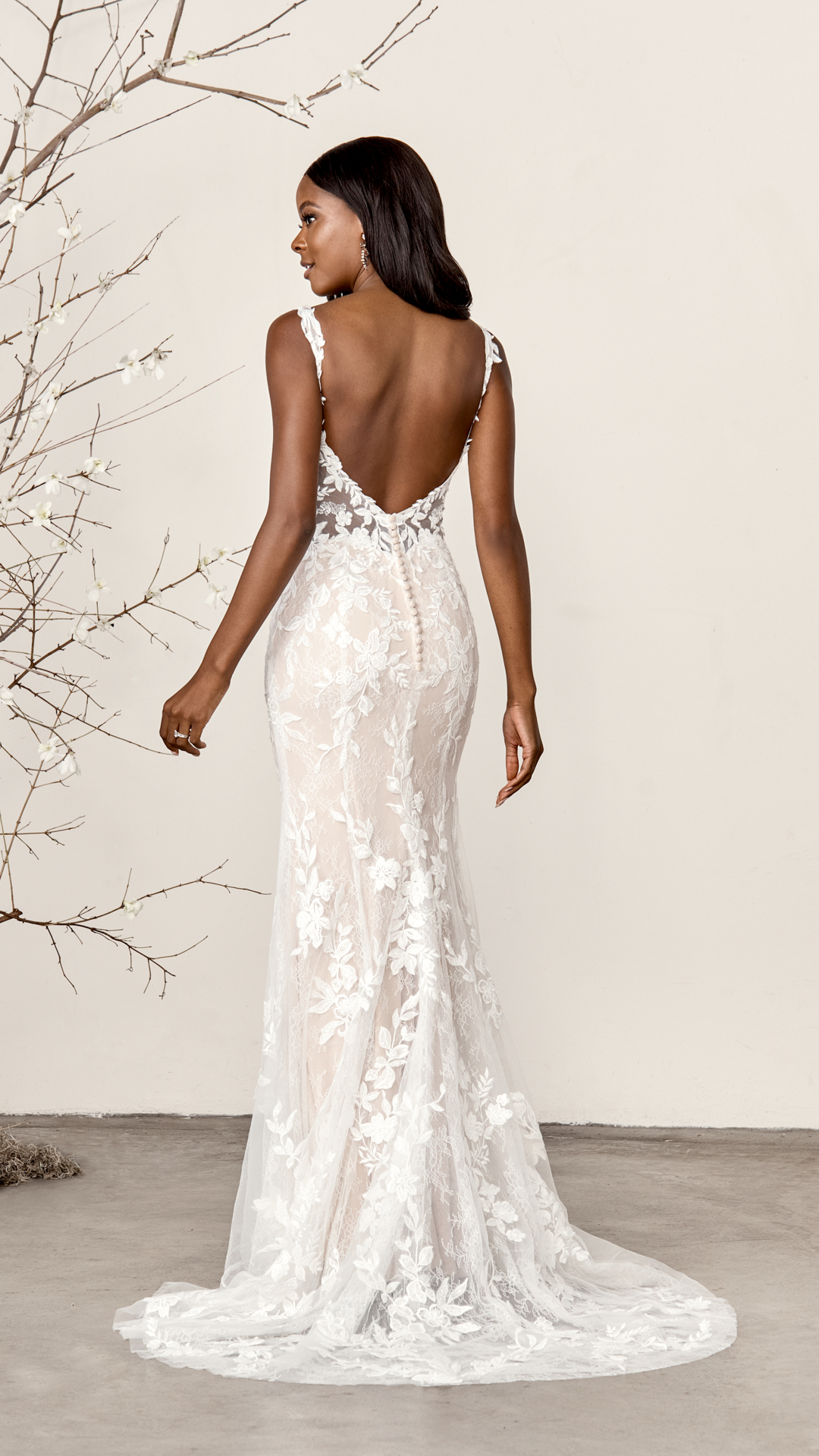 Vestido de novia estilo sirena en encaje con escote en V, aberturas laterales que conducen a una espalda en V en transparencia, con una capa inferior de encaje Chantilly con apliques de encaje de lentejuelas.